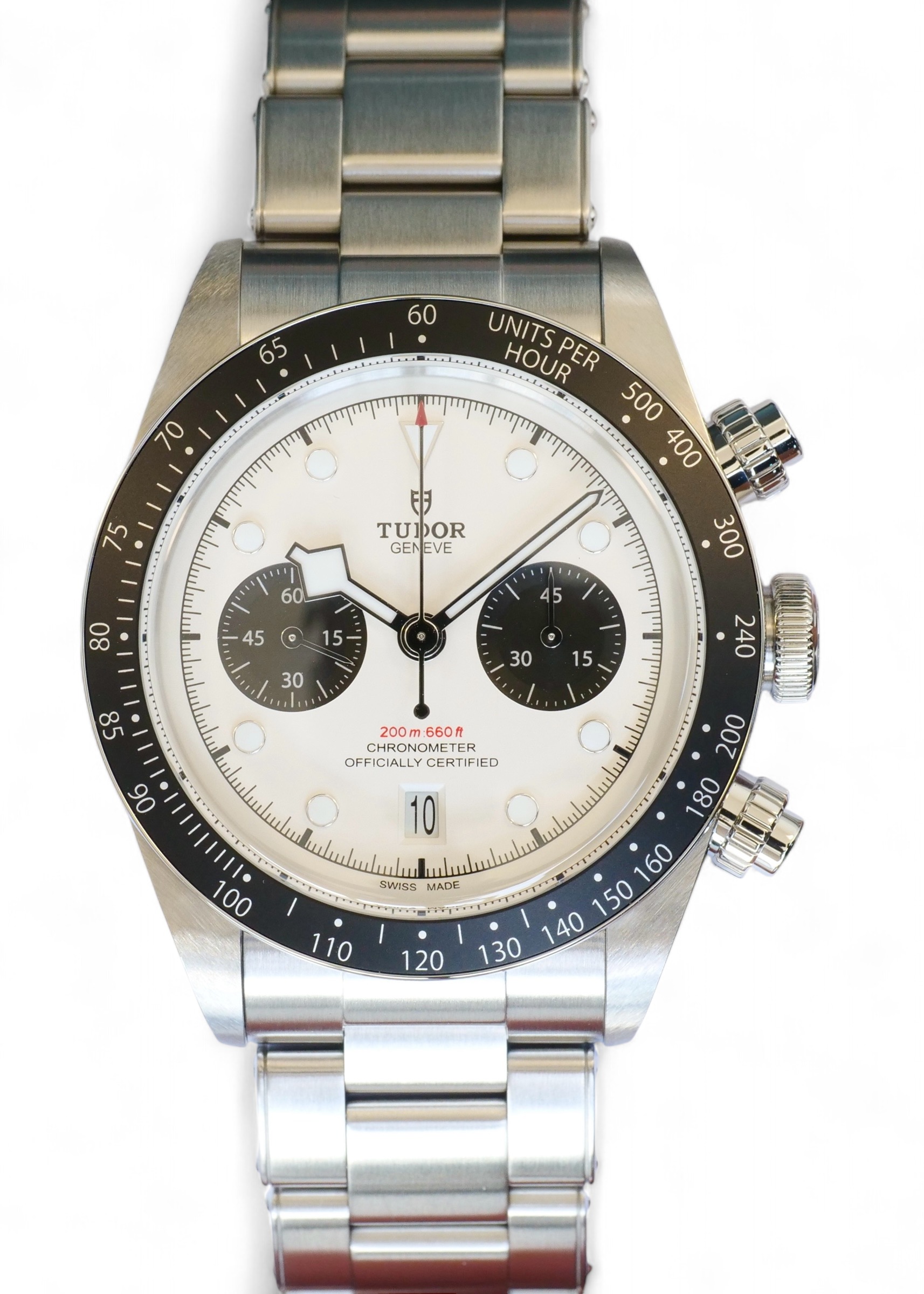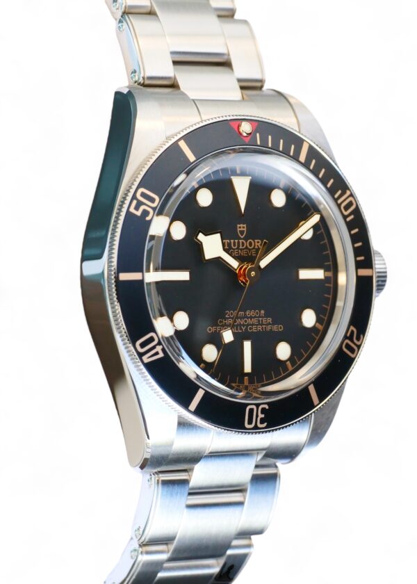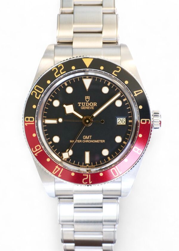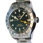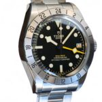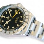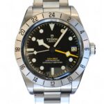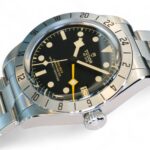 Tudor Black Bay Pro GMT in a very popular and wearable size of 39mm, stainless steel case and satin-brushed steel bezel with 24-hour graduations , and a matt black dial with a quirky orange GMT hands.