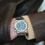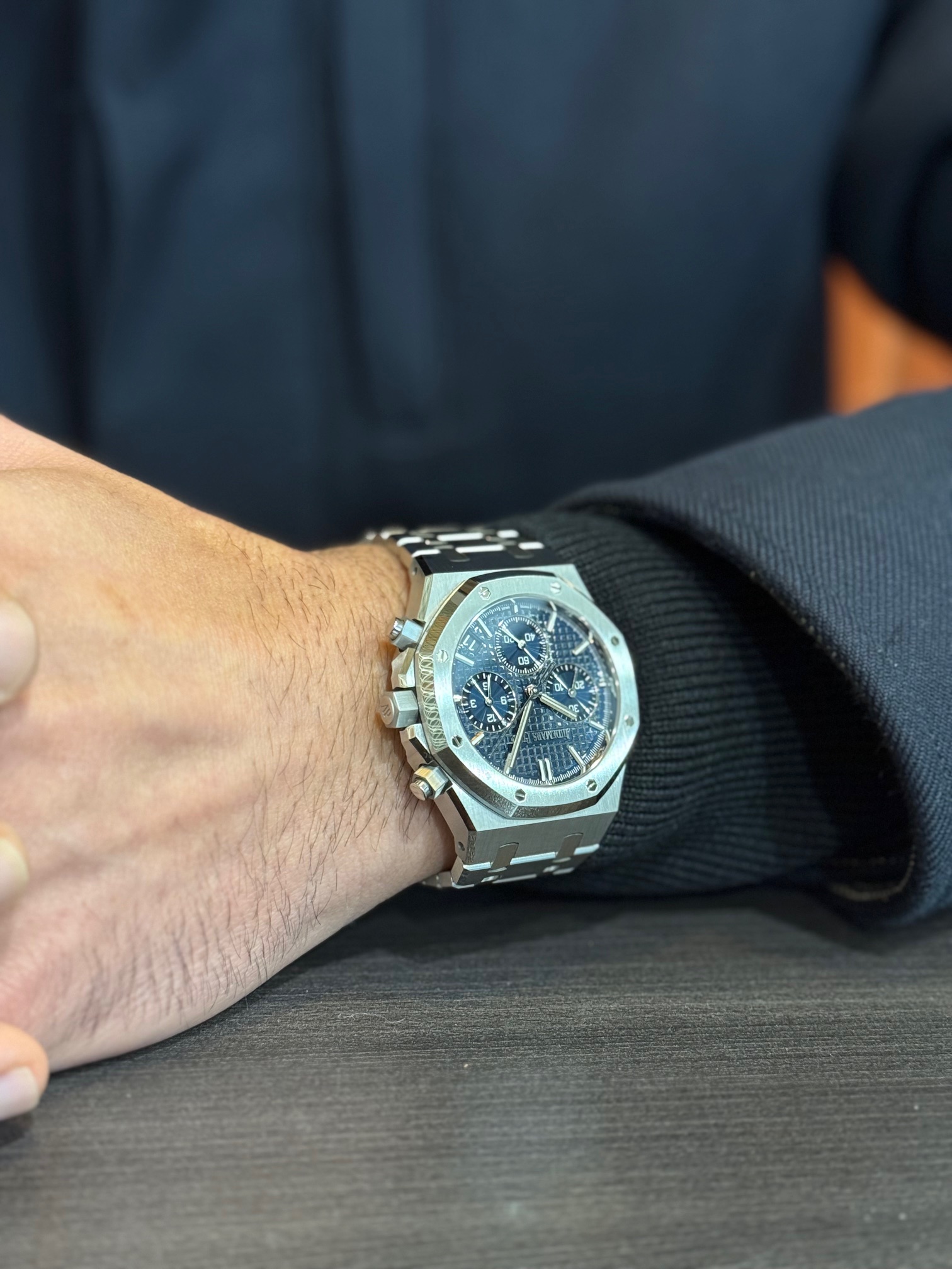 All photos are from the actual AP Royal Oak Flyback Chronograph for sale including the photo with delivery contents and form part of the description. The photos are indicative of the condition of the watch and form part of the description, and the items that come included in the box.
