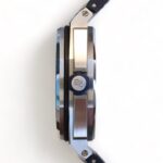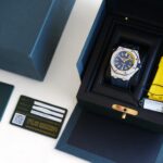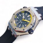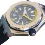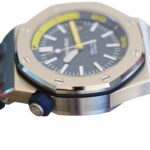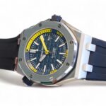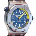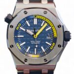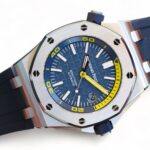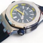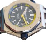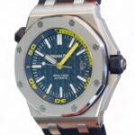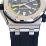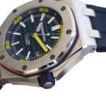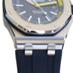 On offer for sale is an ultra cool and rare Audemars Piguet, the sleek dark-blue Royal Oak Offshore Diver in the “Funky Colour” collection, with easy to switch out rubber straps in blue or yellow. An exceptional diving watch, water-resistant to 300m, with bright yellow diving scale and zone from 60 to 15 minutes on the rotating inner bezel.