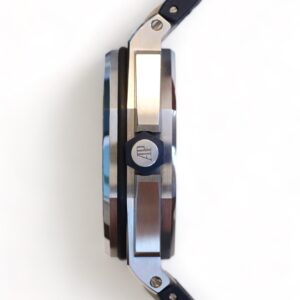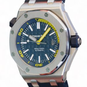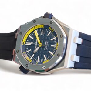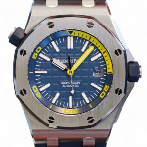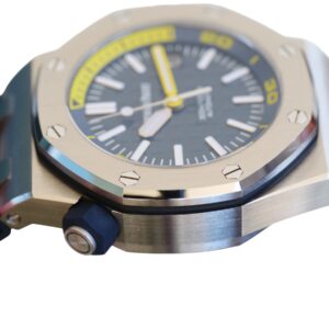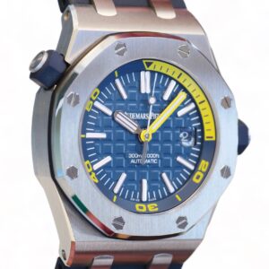 On offer for sale is an ultra cool and rare Audemars Piguet, the sleek dark-blue Royal Oak Offshore Diver in the “Funky Colour” collection, with easy to switch out rubber straps in blue or yellow. An exceptional diving watch, water-resistant to 300m, with bright yellow diving scale and zone from 60 to 15 minutes on the rotating inner bezel.
