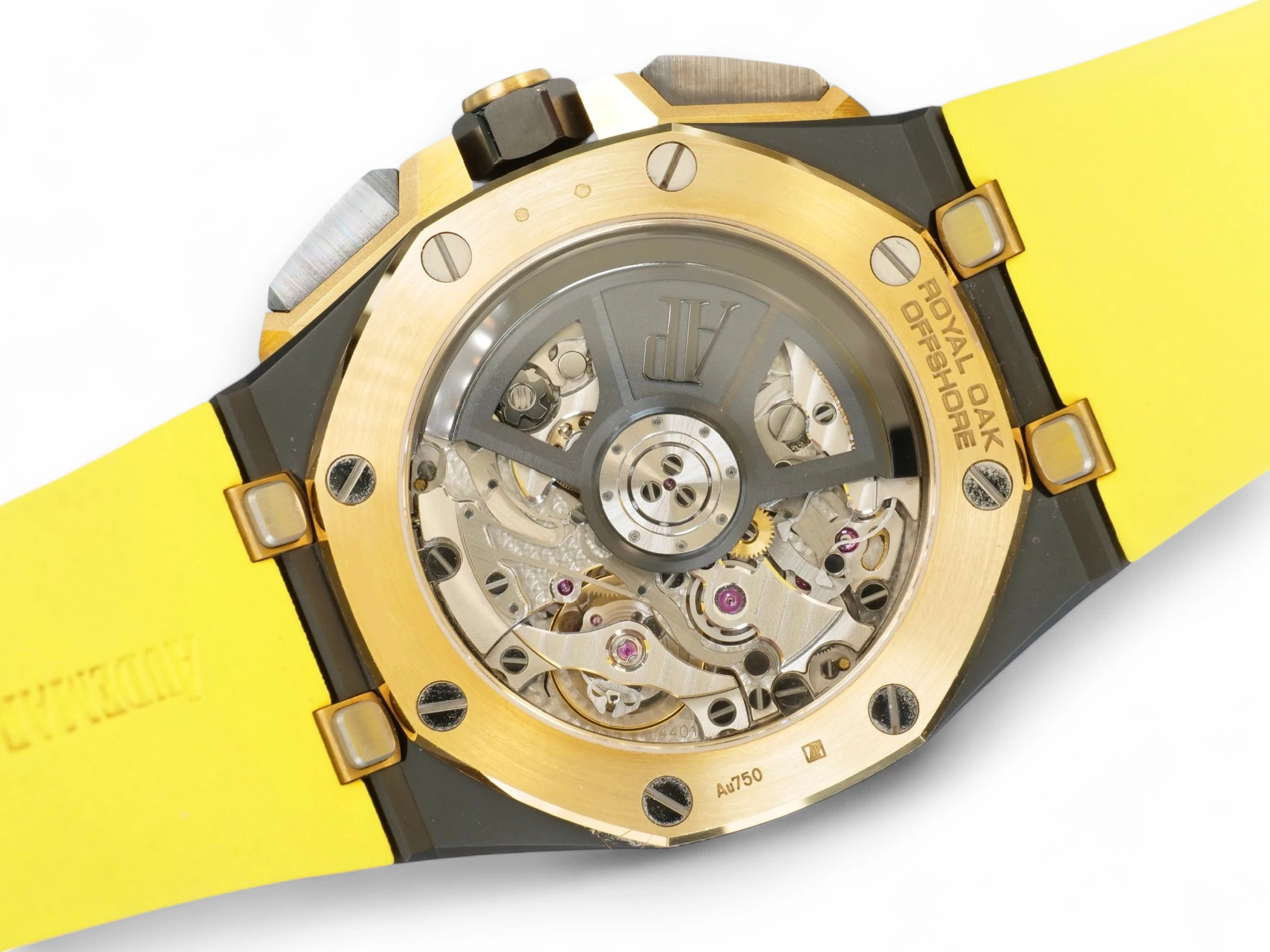Black dial with “Méga Tapisserie” pattern, black counters and external zone, yellow gold applied hour-markers and Royal Oak hands with black paint, black inner bezel.