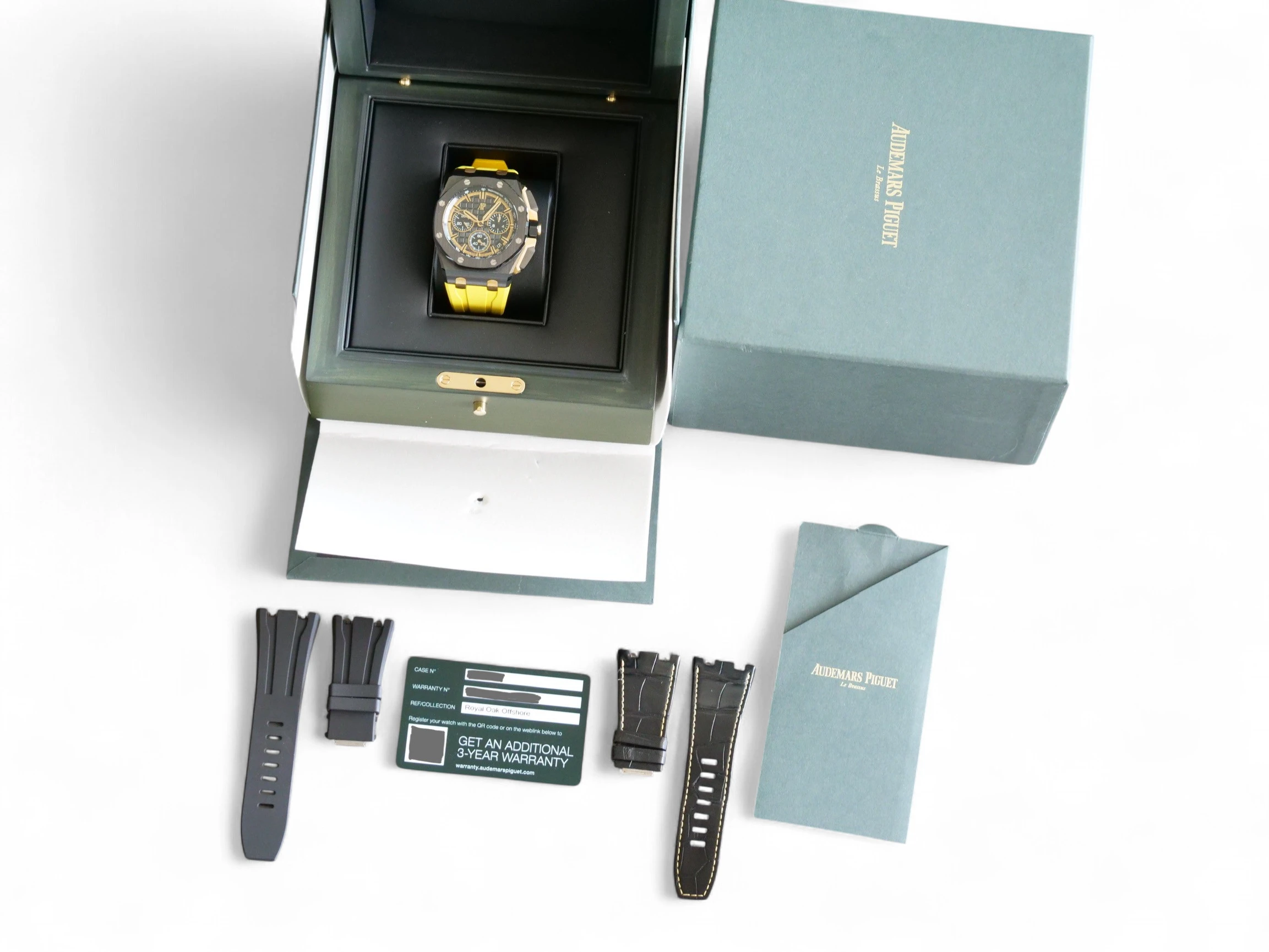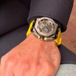 The timepiece comes with 2x spare straps (3x in total), and includes one black rubber strap, one yellow rubber strap and a black gator strap with yellow stitching.
