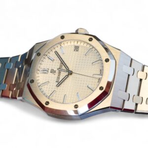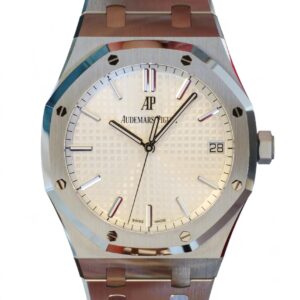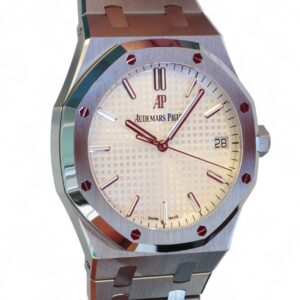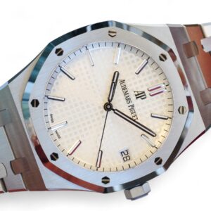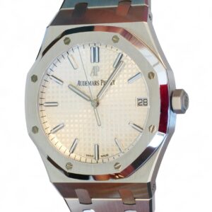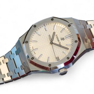 Audemars Piguet Royal Oak 41 is on offer for sale. One of the most iconic and popular watches, one of the finest examples of Haute Horology and fine watchmaking, the Audemars Piguet Royal Oak 41 in the modern size of 41mm and an incredibly beautiful silvery-white dial and stainless-steel case and bracelet.