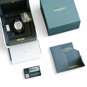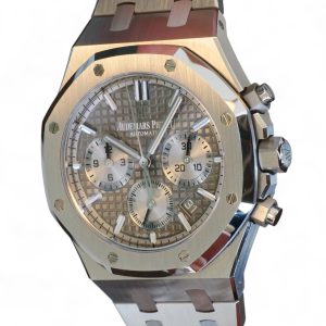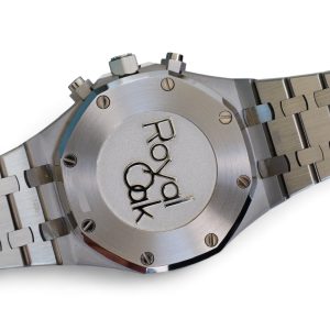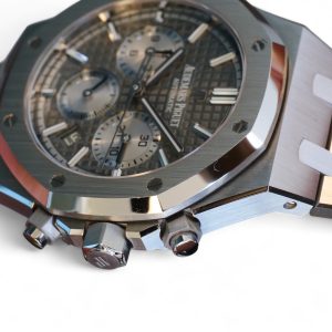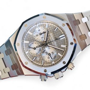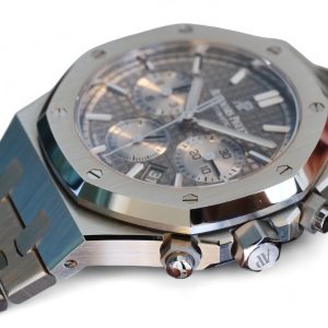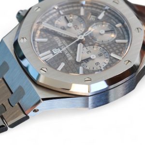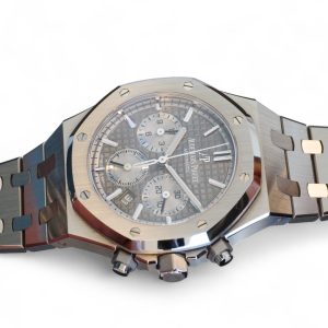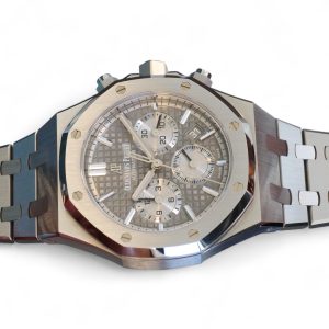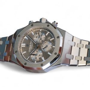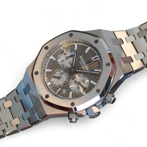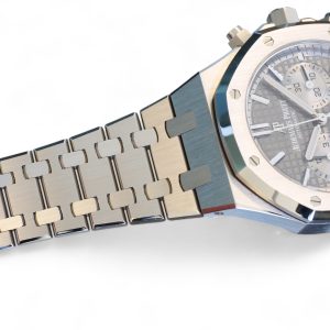 This Audemars Piguet Royal Oak on offer for sale is a rare opportunity to acquire a now discontinued, and a very collectible, and beautiful AP Royal Oak Chronograph Grey Dial with contrasting silver sub dials model 26315ST in a very wearable 38mm case size.