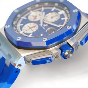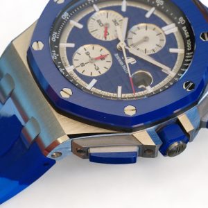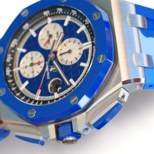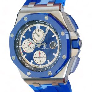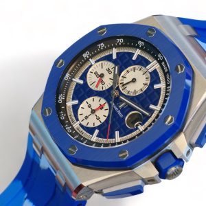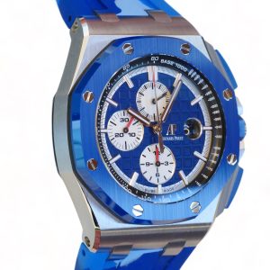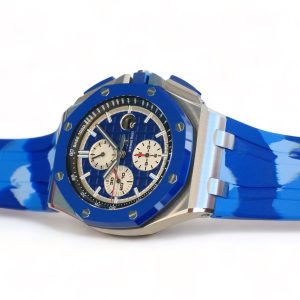 On offer for sale is an ultra cool, a rare and now discontinued Audemars Piguet, in a very short production run and a limited edition of only 400 pieces, Royal Oak Offsore Selfwinding Chronograph 44mm Camouflage Blue Méga-Tapisserie Dial 44 mm case with blue cermaic bezel and blue ceramic chrono pushers and crown guard.