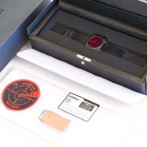 The watch is offered as full set with presentation boxes and factory papers including the spare red canvas strap, as shown in the last photo.