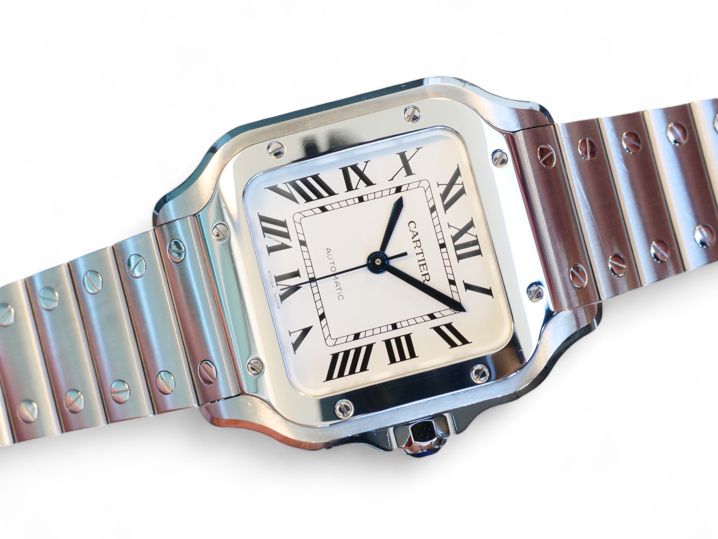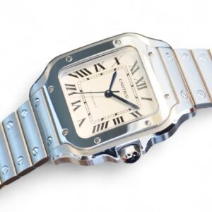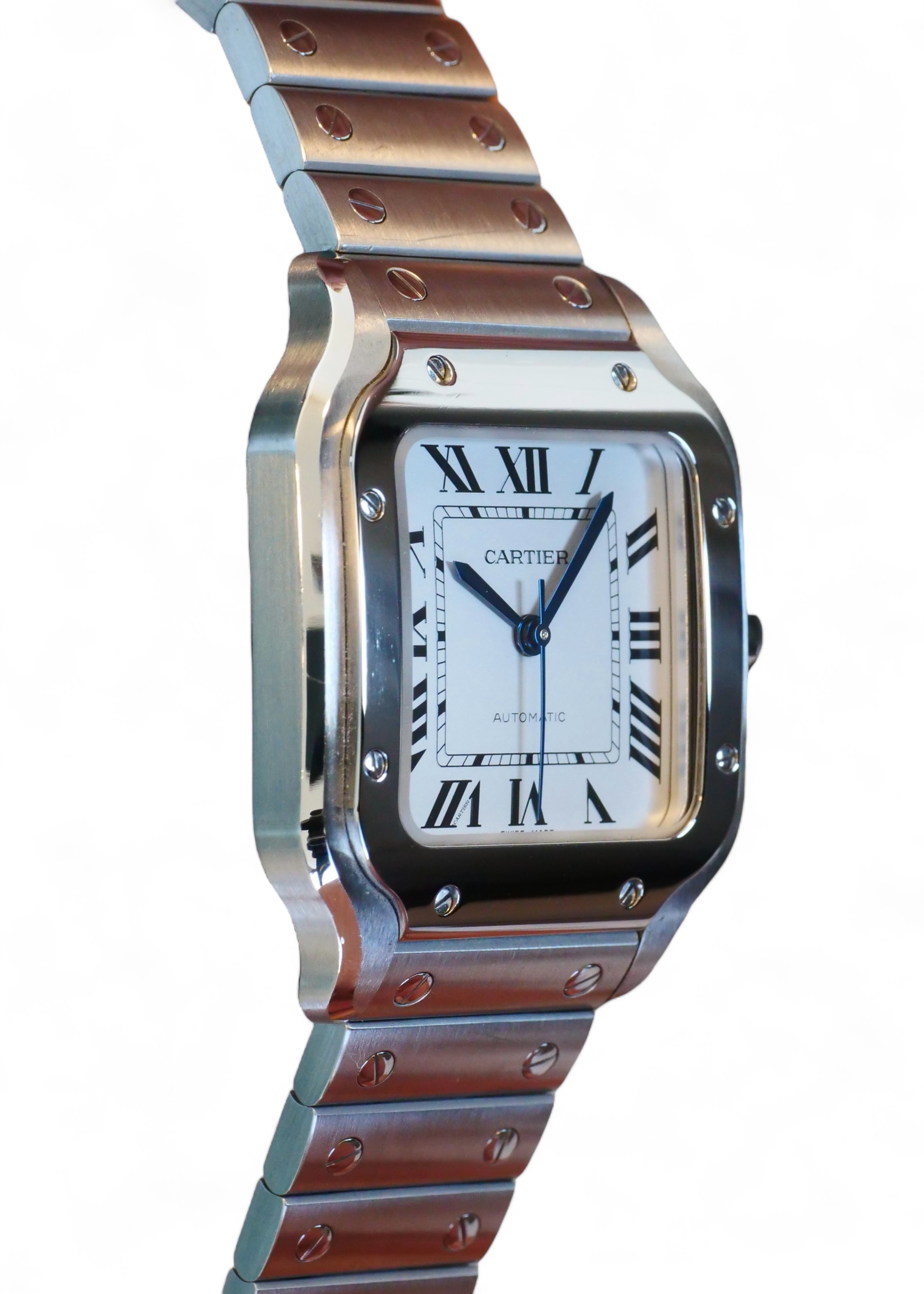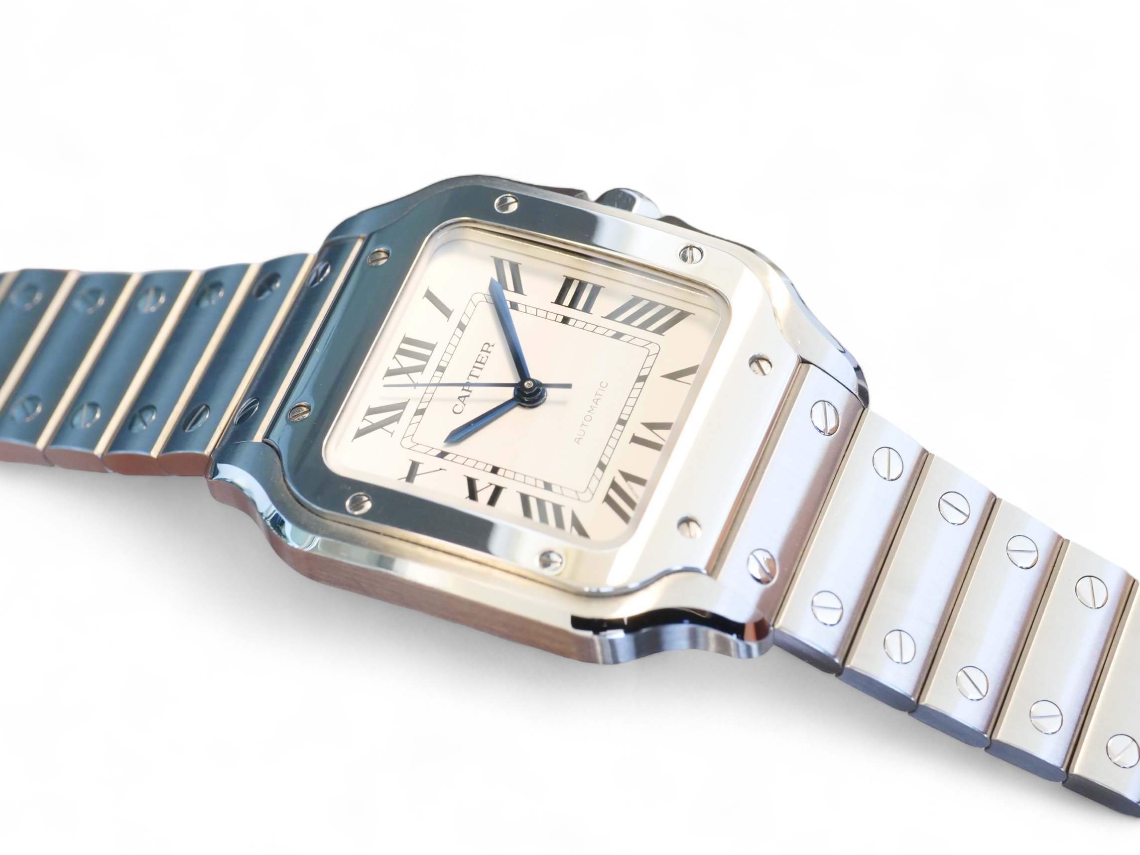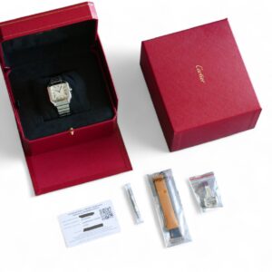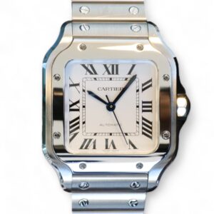 Presenting a timelessly elegant, Cartier de Santos, with a beautiful Silvered opaline dial with steel sword-shaped blued hand and a sapphire crystal, housed inside a very wearable medium case size with interchangeable leather and metal bracelet, model reference WSSA0029.