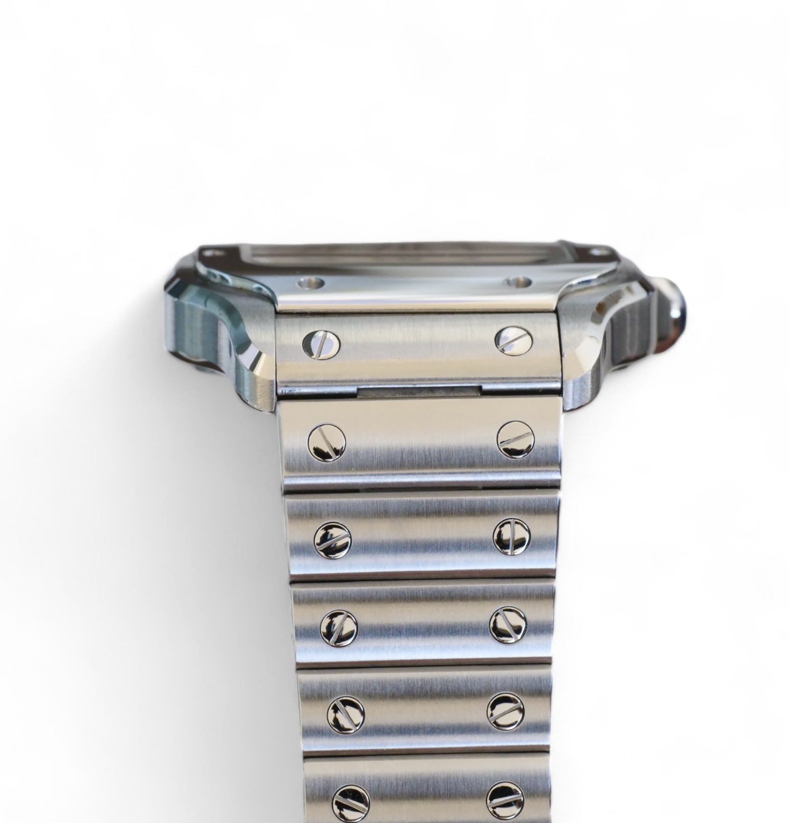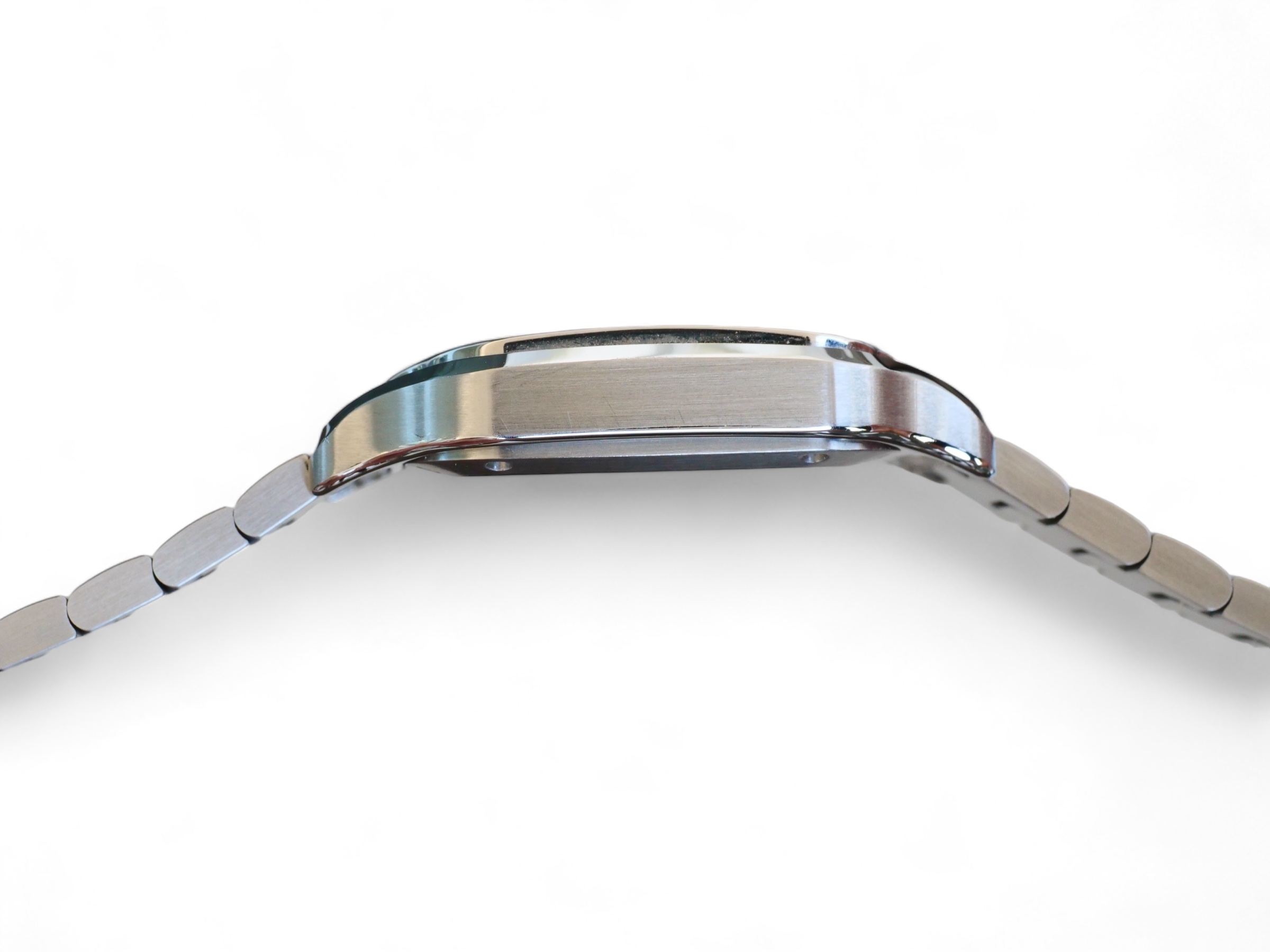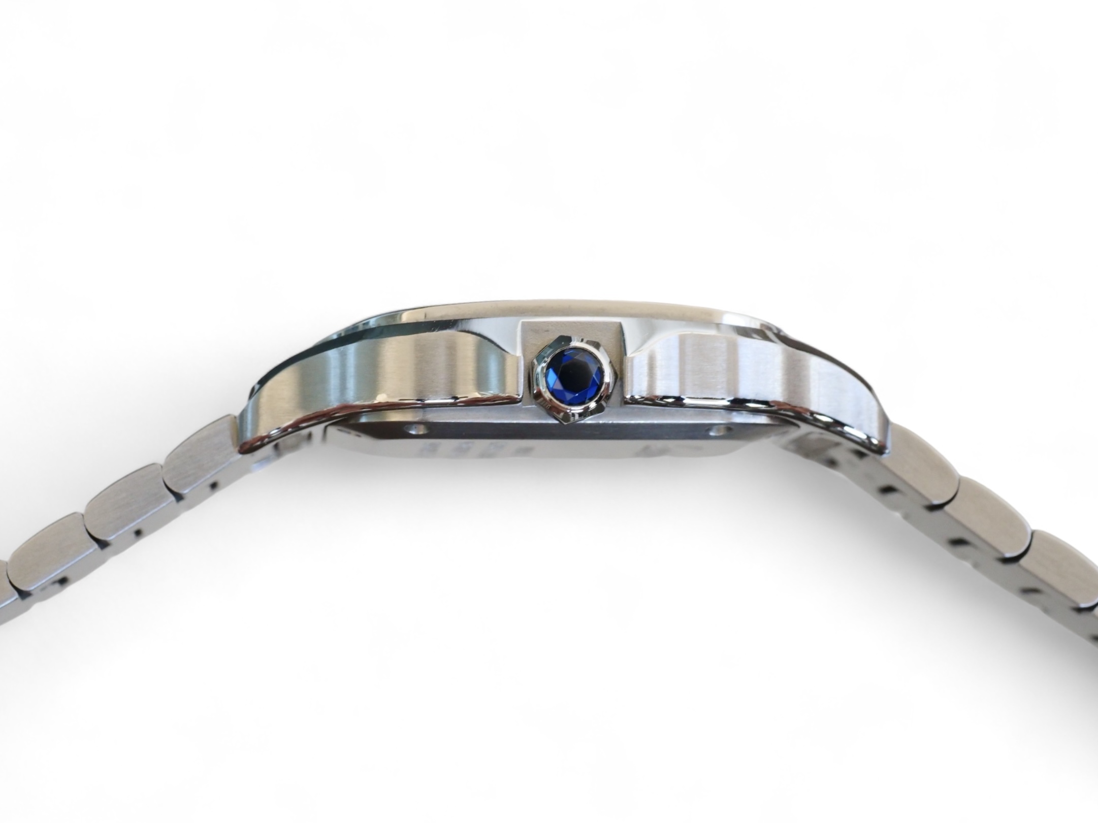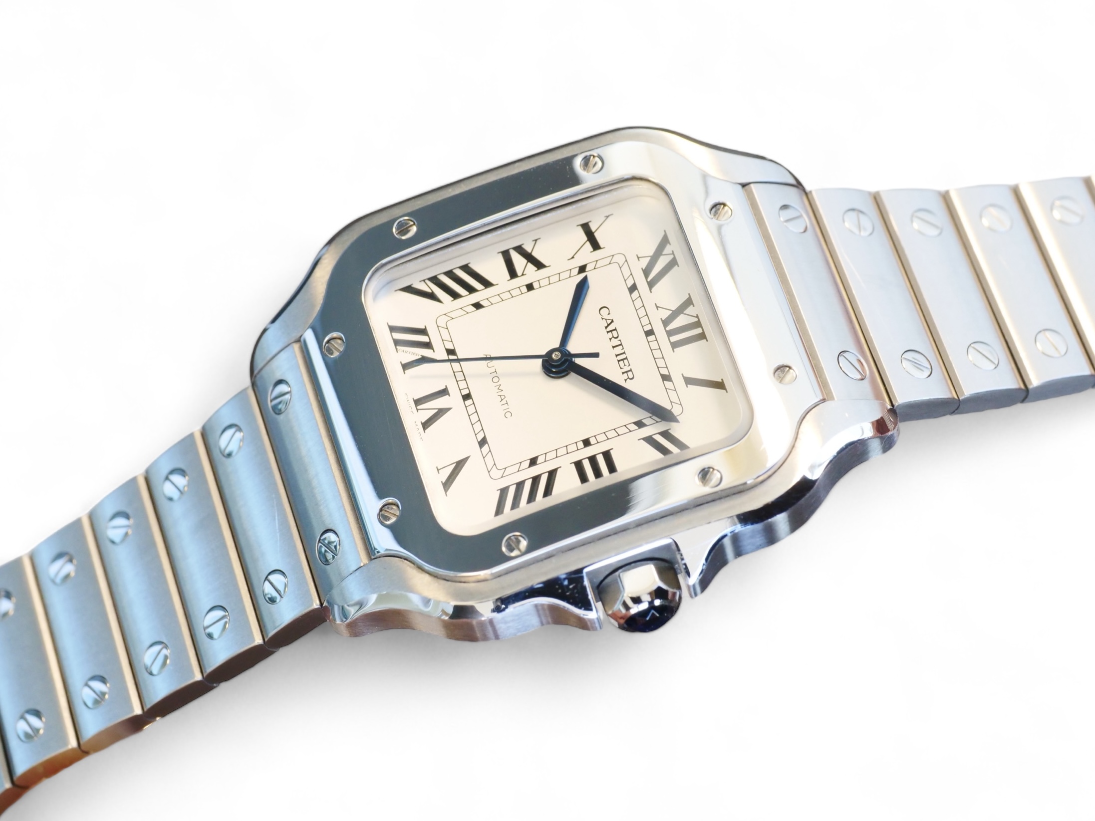 Presenting a timelessly elegant, Cartier de Santos, with a beautiful Silvered opaline dial with steel sword-shaped blued hand and a sapphire crystal, housed inside a very wearable medium case size with interchangeable leather and metal bracelet, model reference WSSA0029.