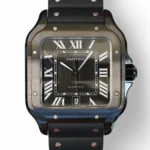 The version we have in this example is arguably, the sportiest of the Santos range, and certainly one of the coolest. The case is in steel, and the coated in ADLC to achieve it’s blackened finish making it almost impossible to scratch, and measures in at 39.8mm wide by only 9.38mm thick, with 100m of water resistance.