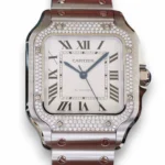 Santos de Cartier, White Opaline dial, steel bezel set with 206 brilliant-cut diamonds totaling 0.64 carat, 7-sided crown set with a faceted synthetic spinel, sunray dial, blued-steel sword-shaped hands, sapphire crystal, housed inside the most popular, and wearable medium case size with interchangeable leather and metal bracelet, model reference W4SA0005 — a timelessly elegant and arguably one of the most iconic watches on the planet.