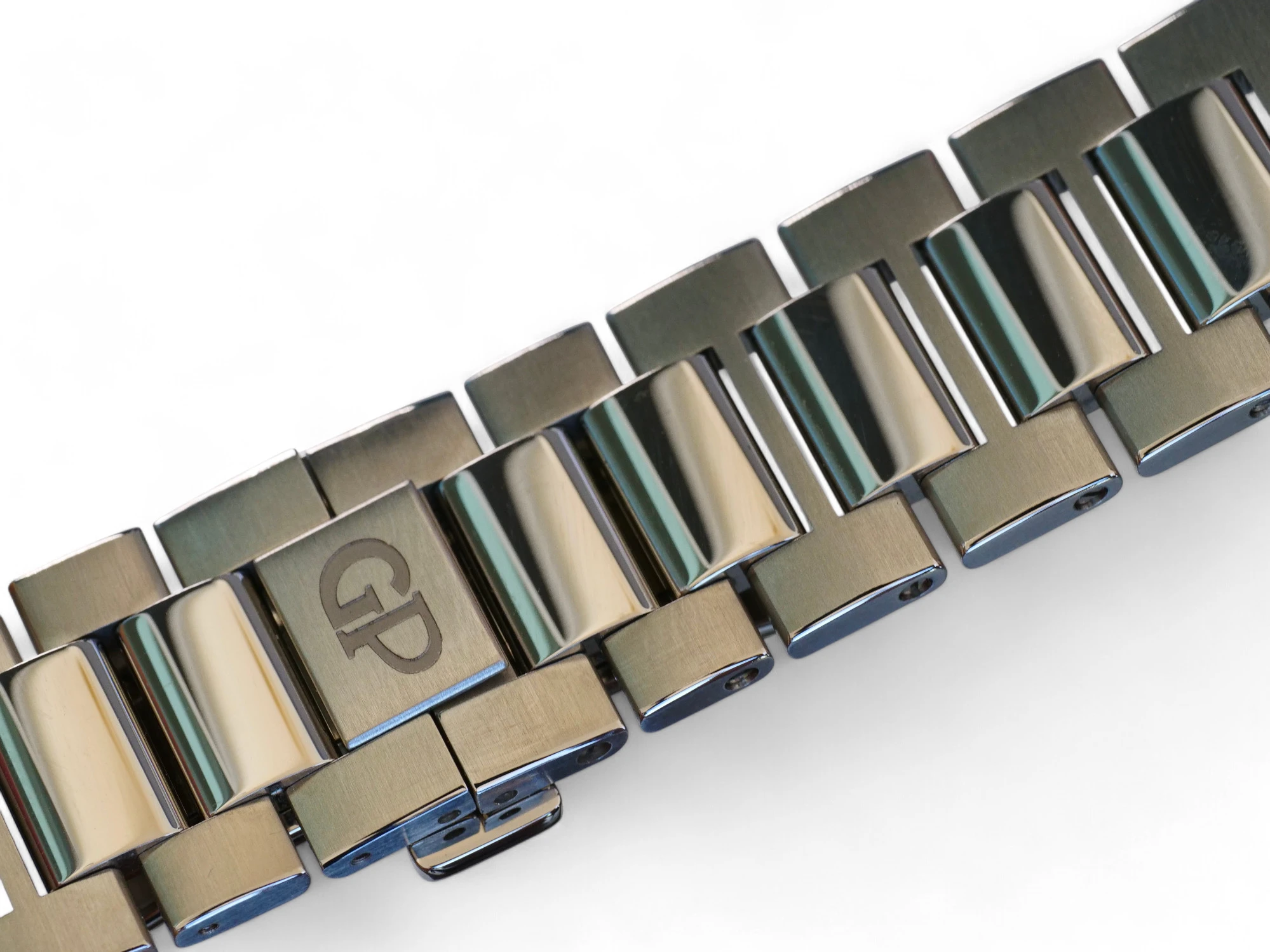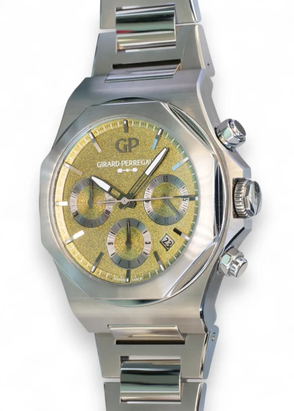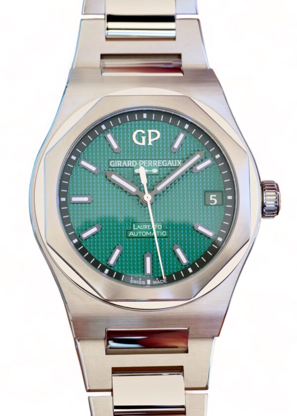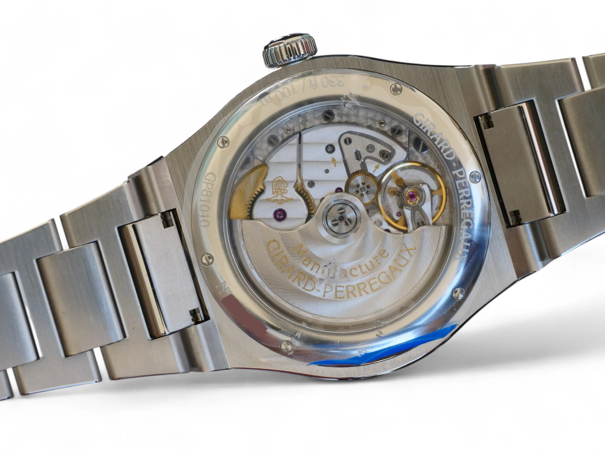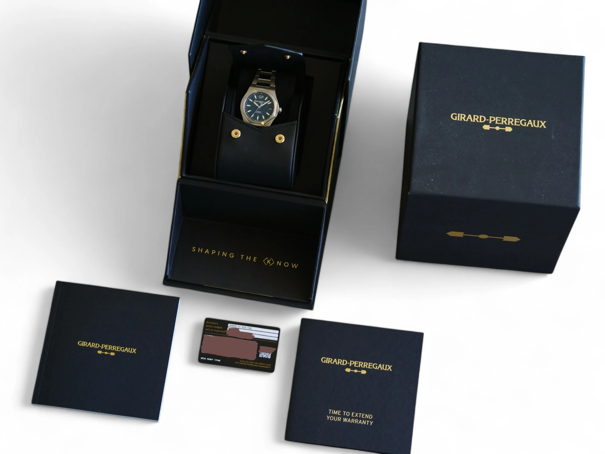 All the photos are of the actual Girard Perregaux Laureato 42mm timepiece available and offered for sale and form part of the description and condition disclosure. The serial number and card date are greyed out in the photos due to security and privacy reasons.