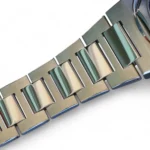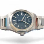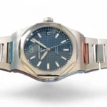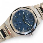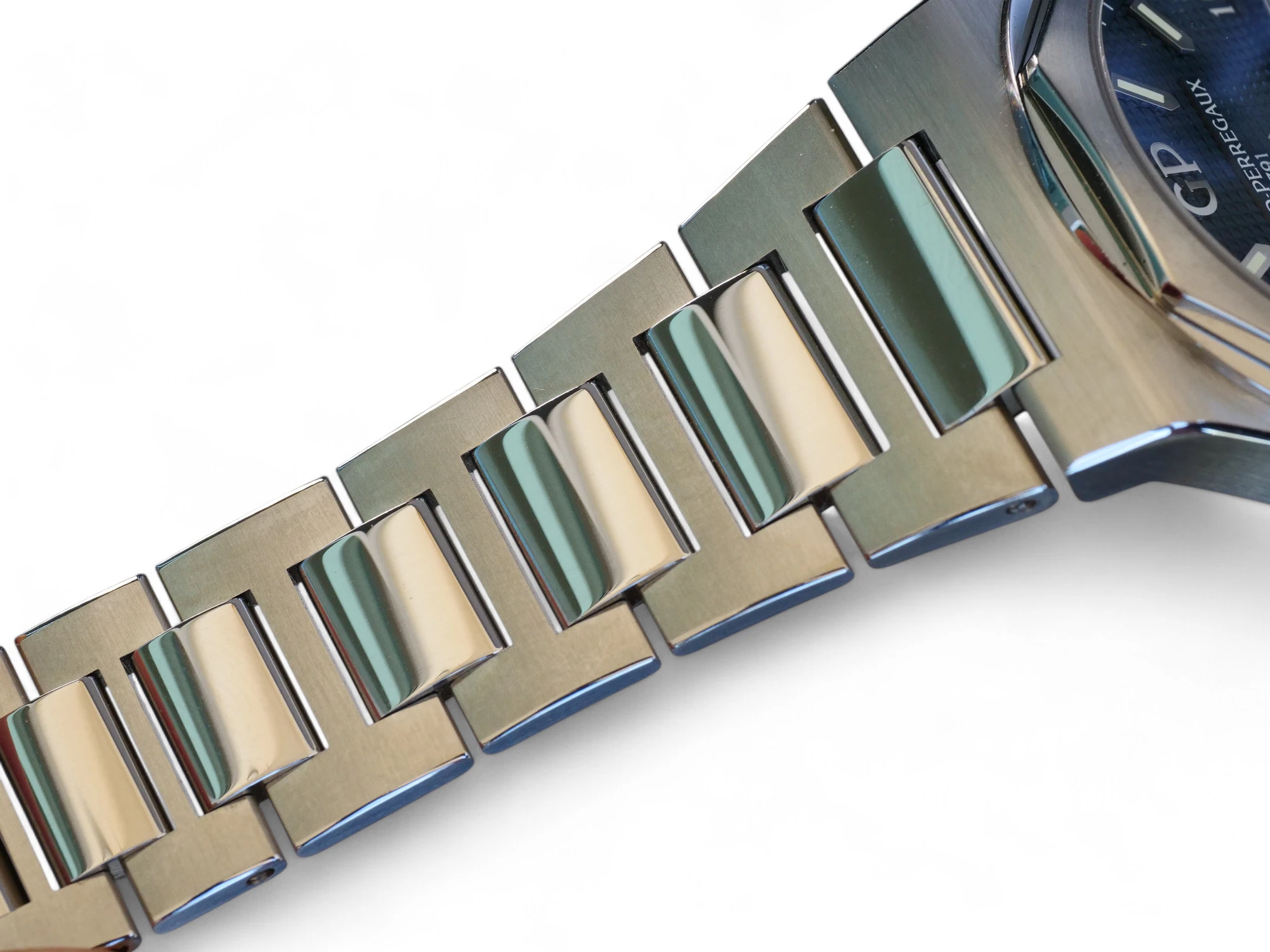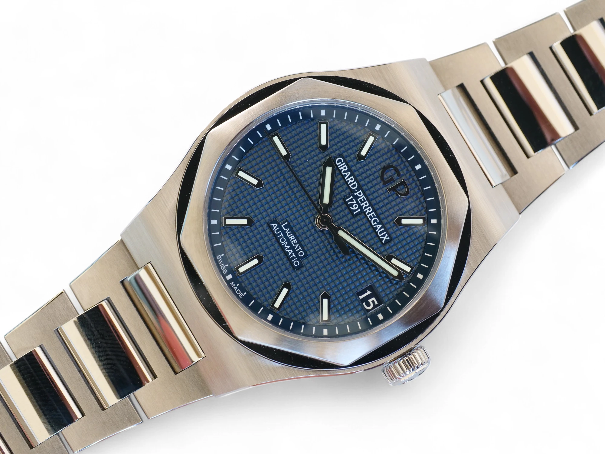 Girard Perregaux Laureato 42mm in Blue dial, with a ‘Clous de Paris’ pattern, a stainless-steel case and integrated bracelet with a double deployant butterfly clasp.