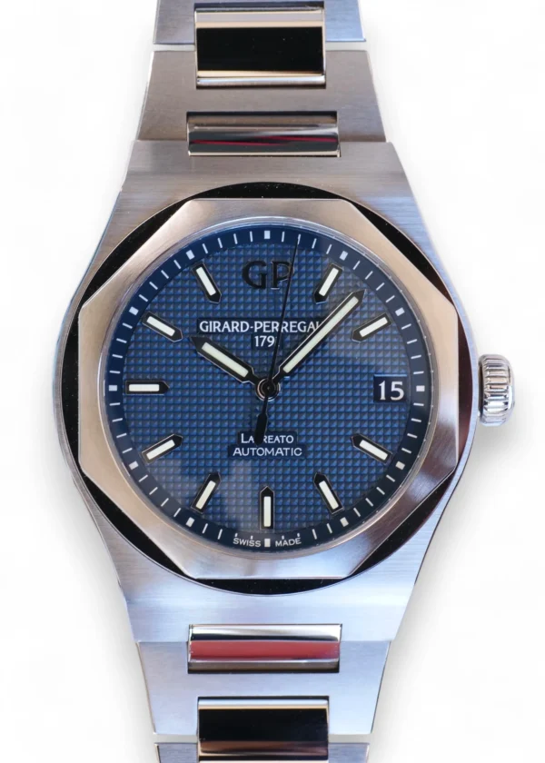 Girard Perregaux Laureato 42mm in Blue dial, with a ‘Clous de Paris’ pattern, a stainless-steel case and integrated bracelet with a double deployant butterfly clasp, model reference 81010-11-431-11A.