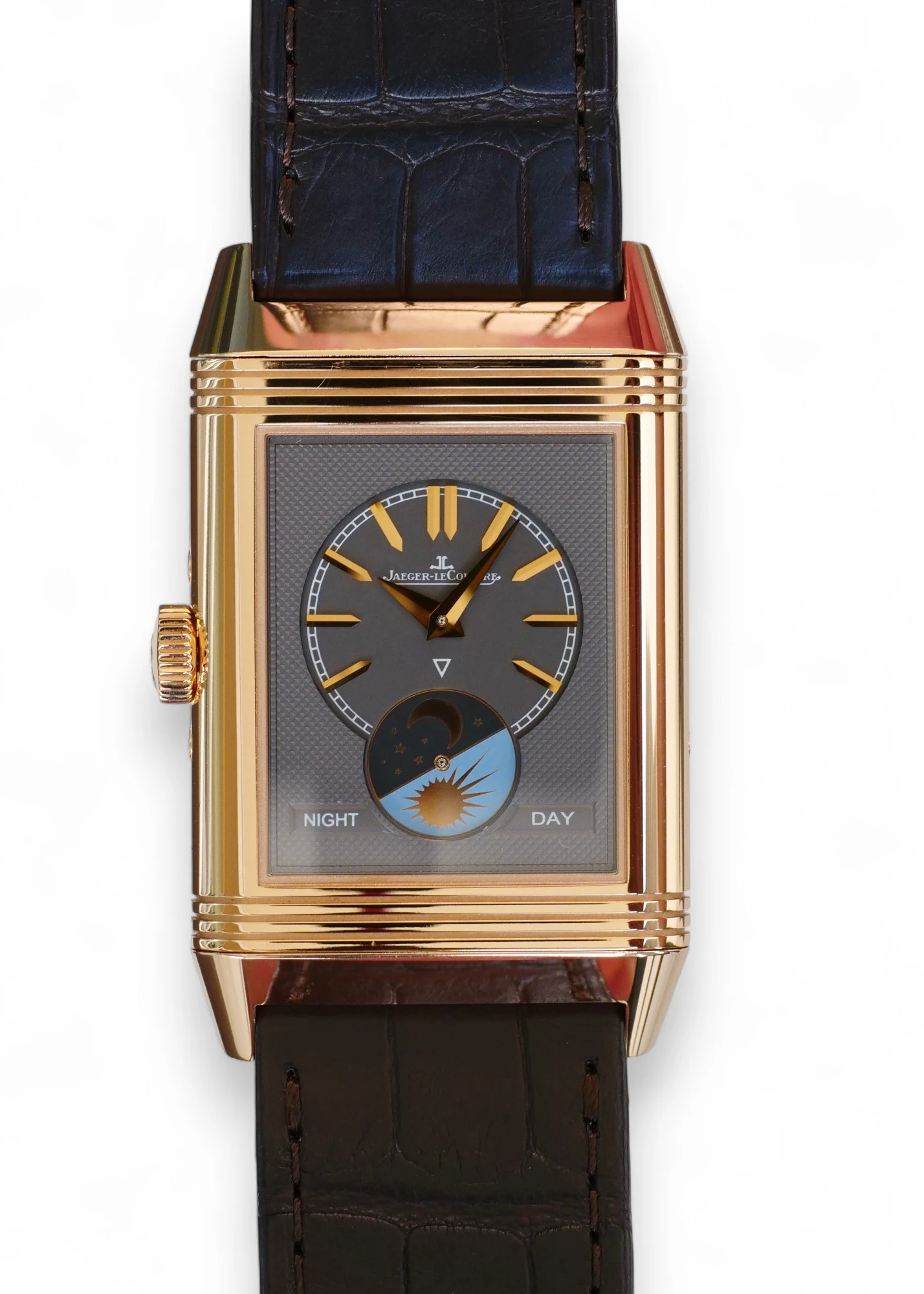 The front-facing silver-tone dial presents appliqued hour markers, a date display and a day/night indicator, while the back facing, charcoal grey, Velvety Clous de Paris guillochΓ© dial is equipped with rose gold-toned hands and hour markers, as well as a day/night indicator.