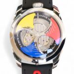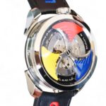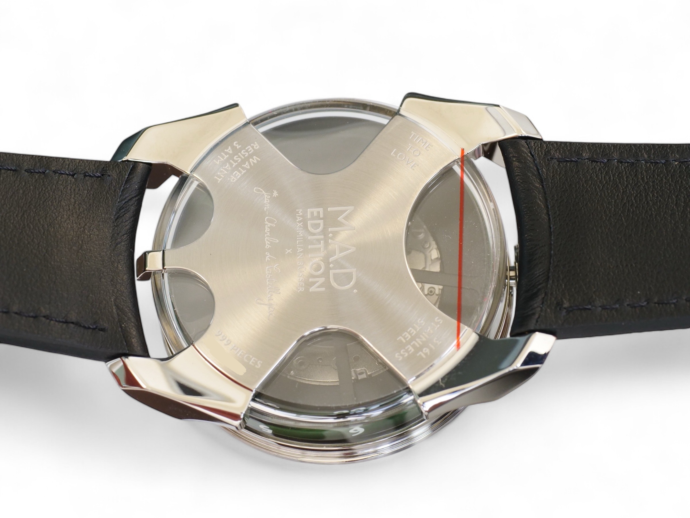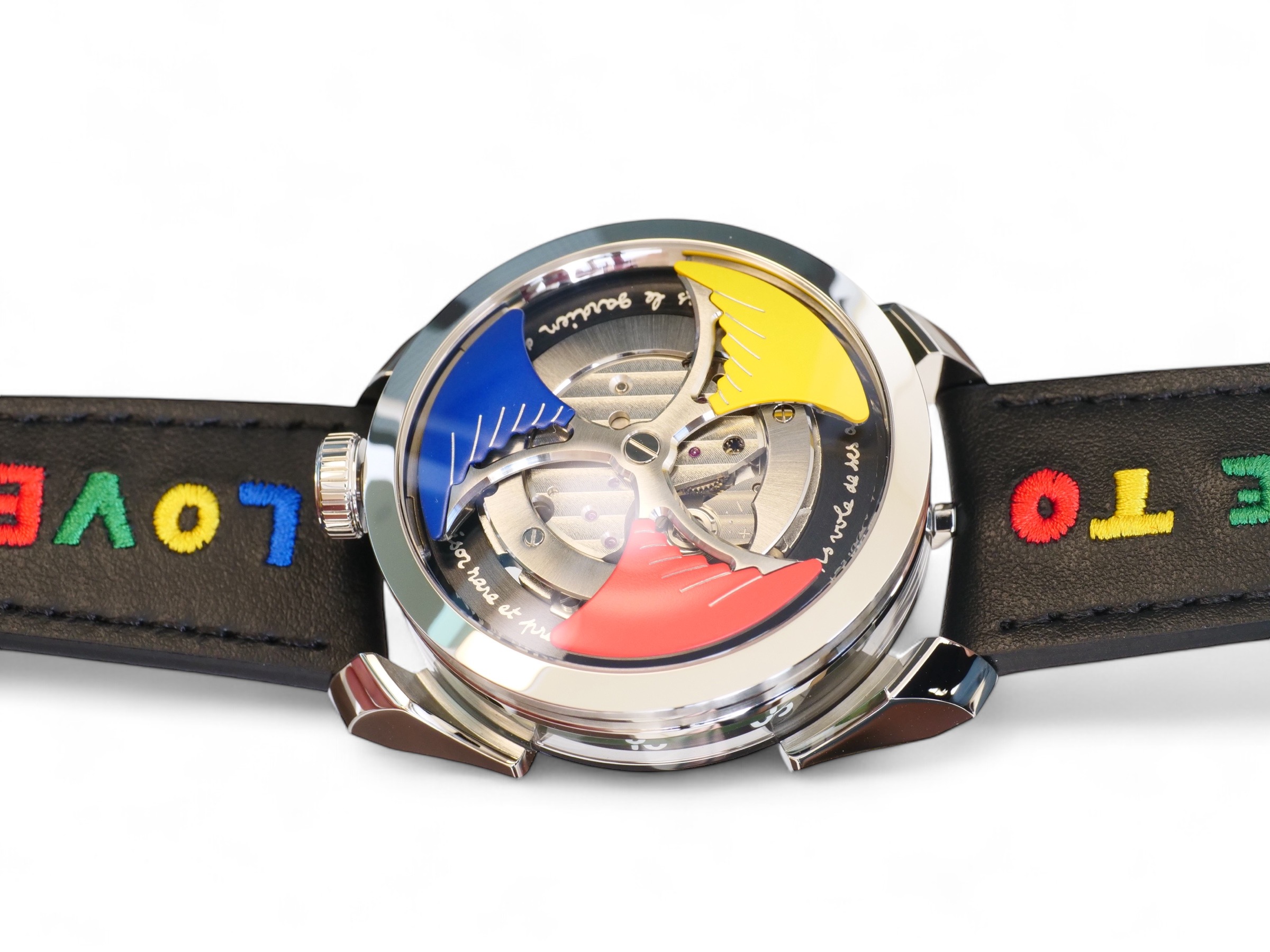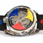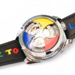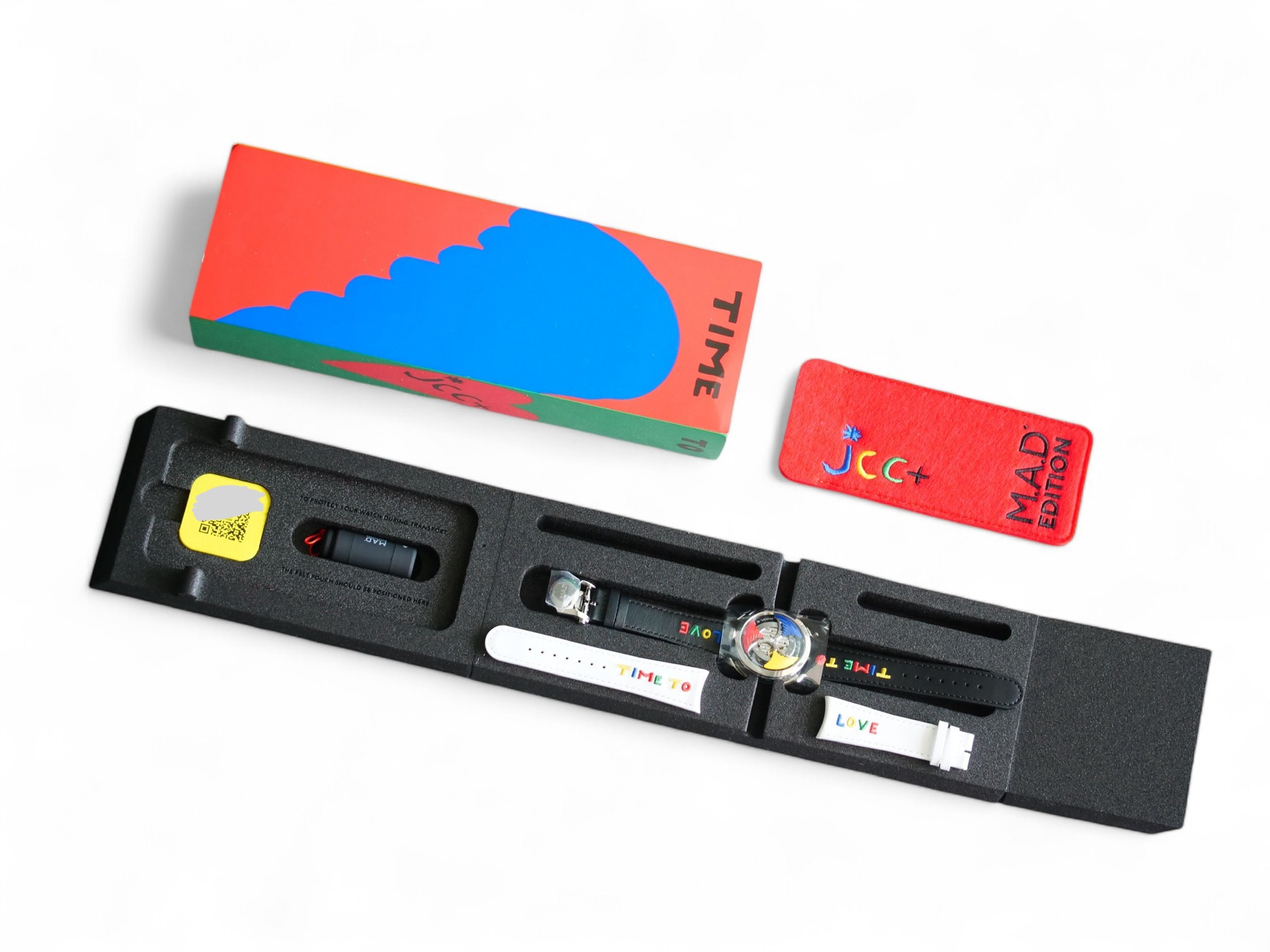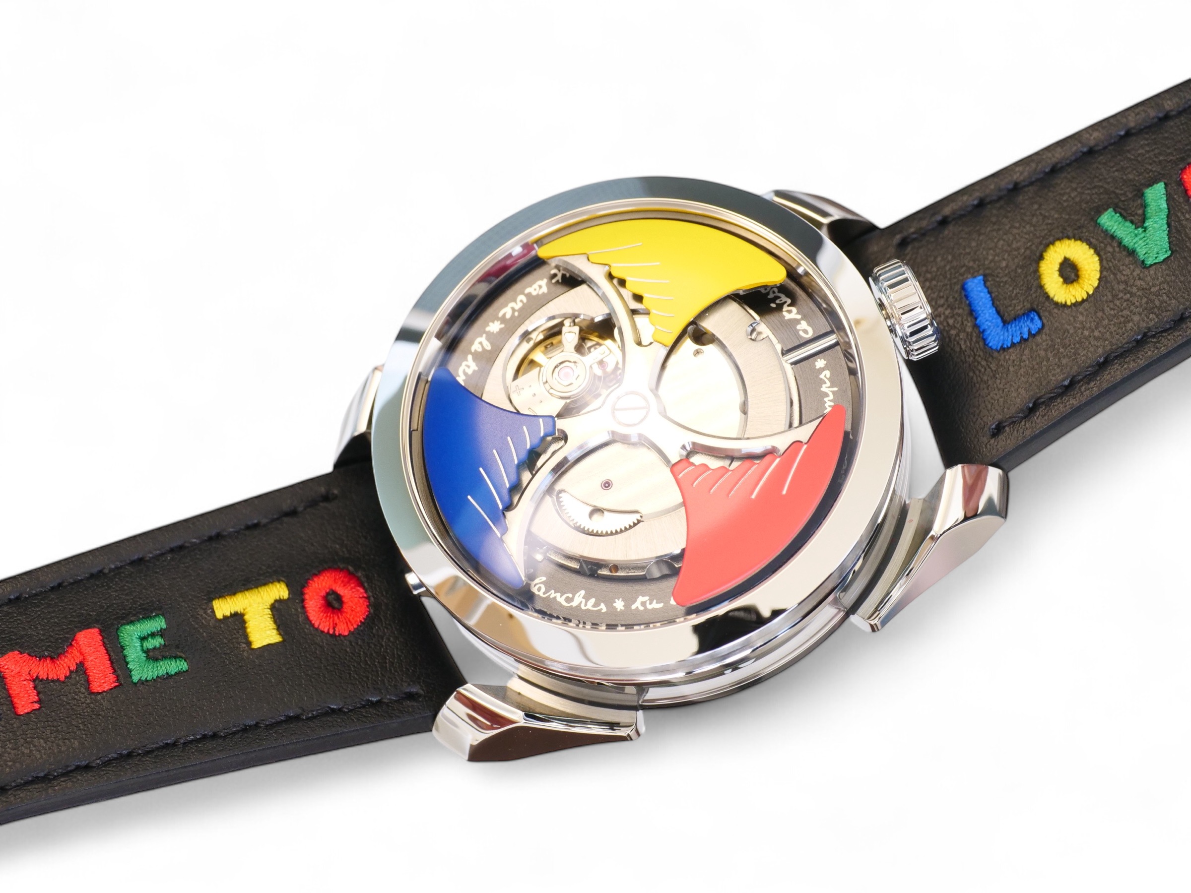 MB&F M.A.D.1 – Time to Love, the first limited edition from MB&F’s affordable sub-brand, created in collaboration with French fashion designer Jean-Charles de Castelbajac, also known as JC/DC. A variant of the standard model endowed with Mr de Castelbajac’s touch – including numerals in his handwriting – the M.A.D.1 “Time to Love” is a 999-piece edition that was completely sold out via an online raffle.