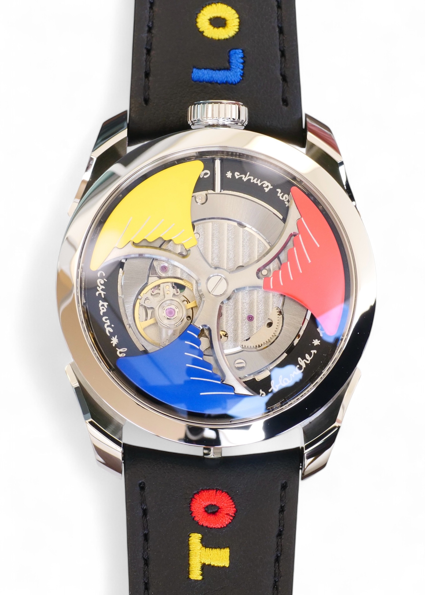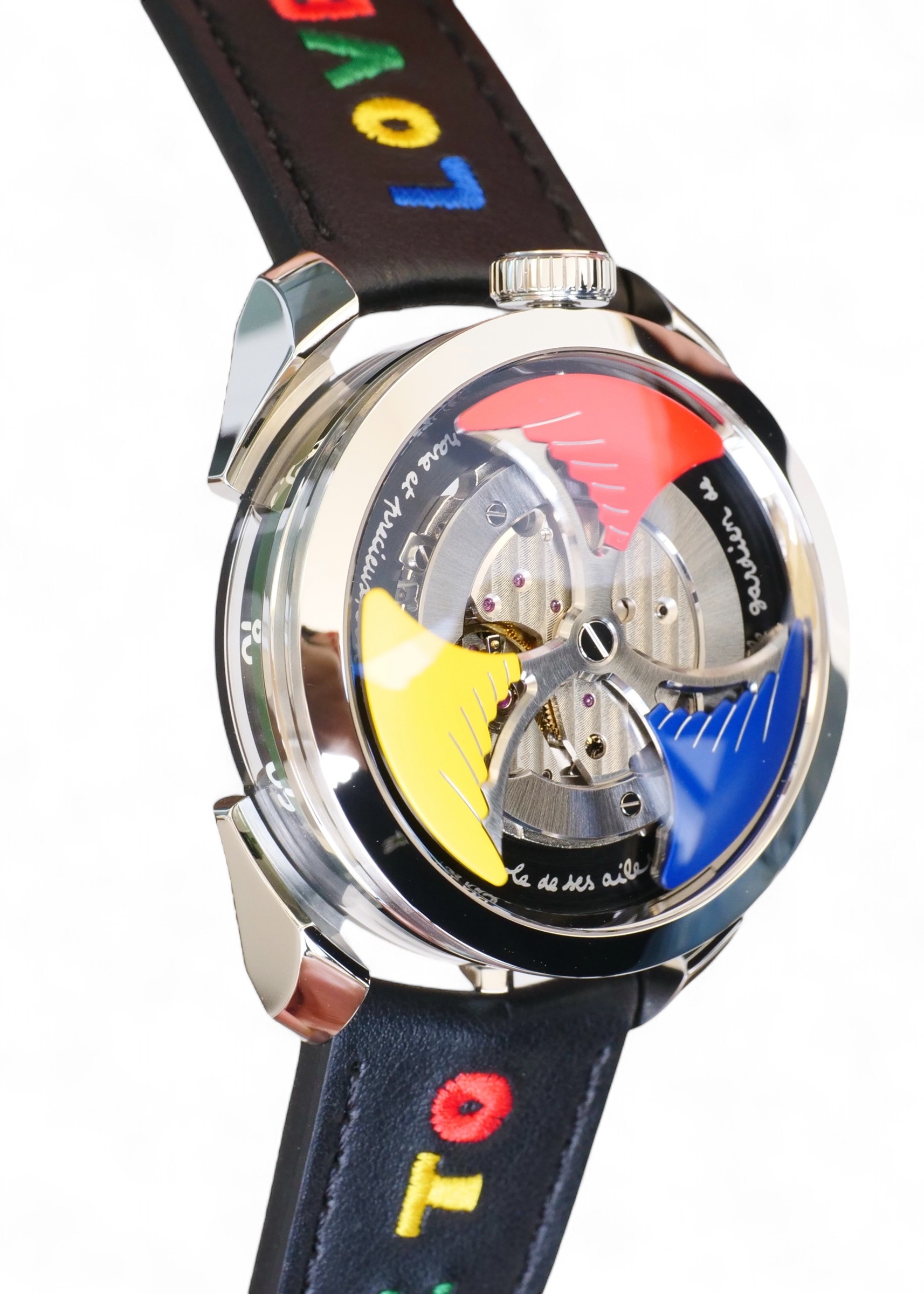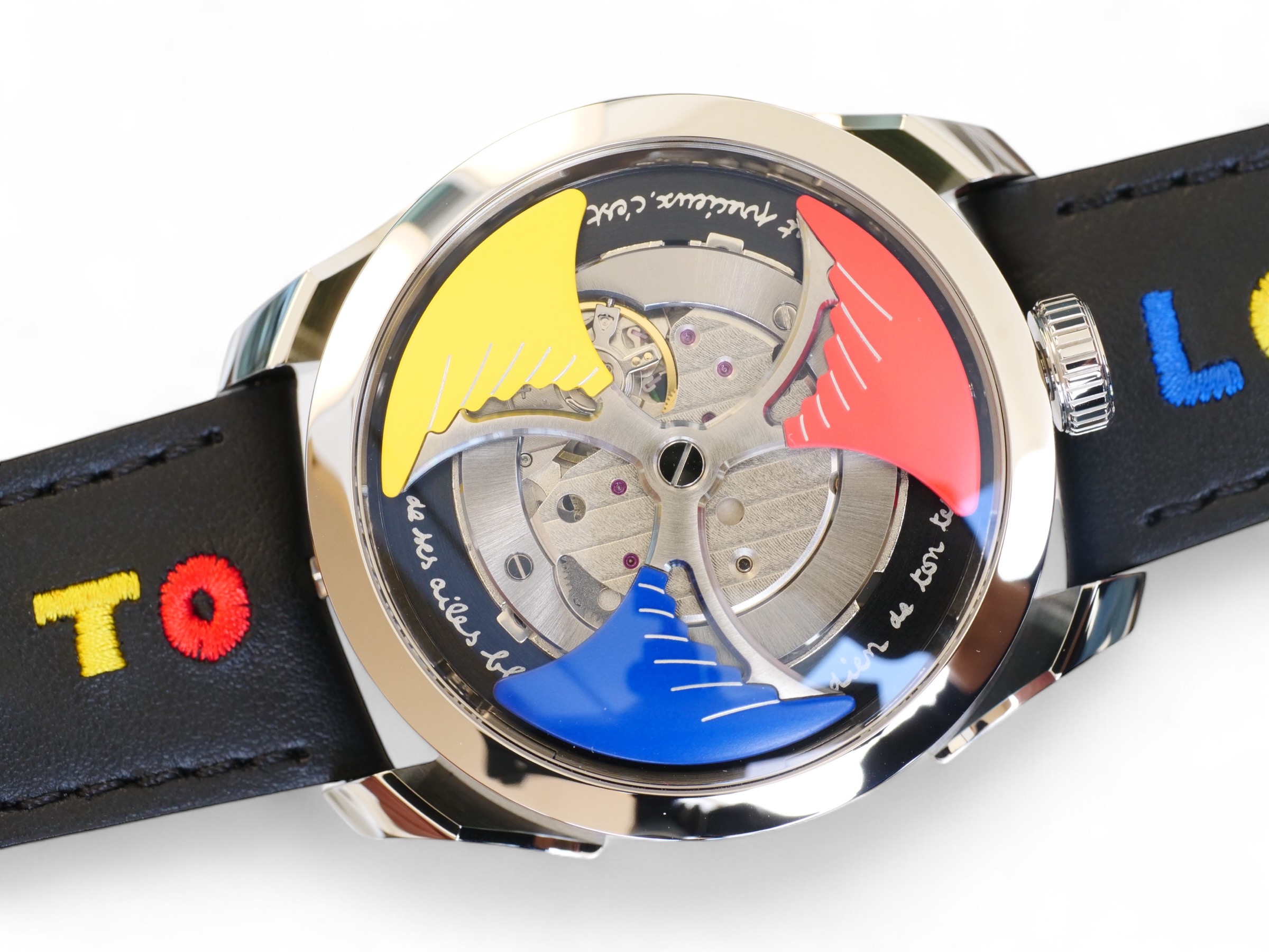 The watch showcases a fully visible triple-blade, titanium and tungsten rotor which winds one of the rare automatic movements with unidirectional winding, flipped upside-down – a nod to MB&F’s Horological Machines HM3 and HM8. Giving the watch the Castelbajac touch, the triple-blade rotor is now picked out in blue, yellow and red lacquer, and the blades are shaped like angel wings. One of the wings is slightly heavier than the others to optimise spinning on the newly engineered rotor.