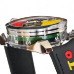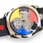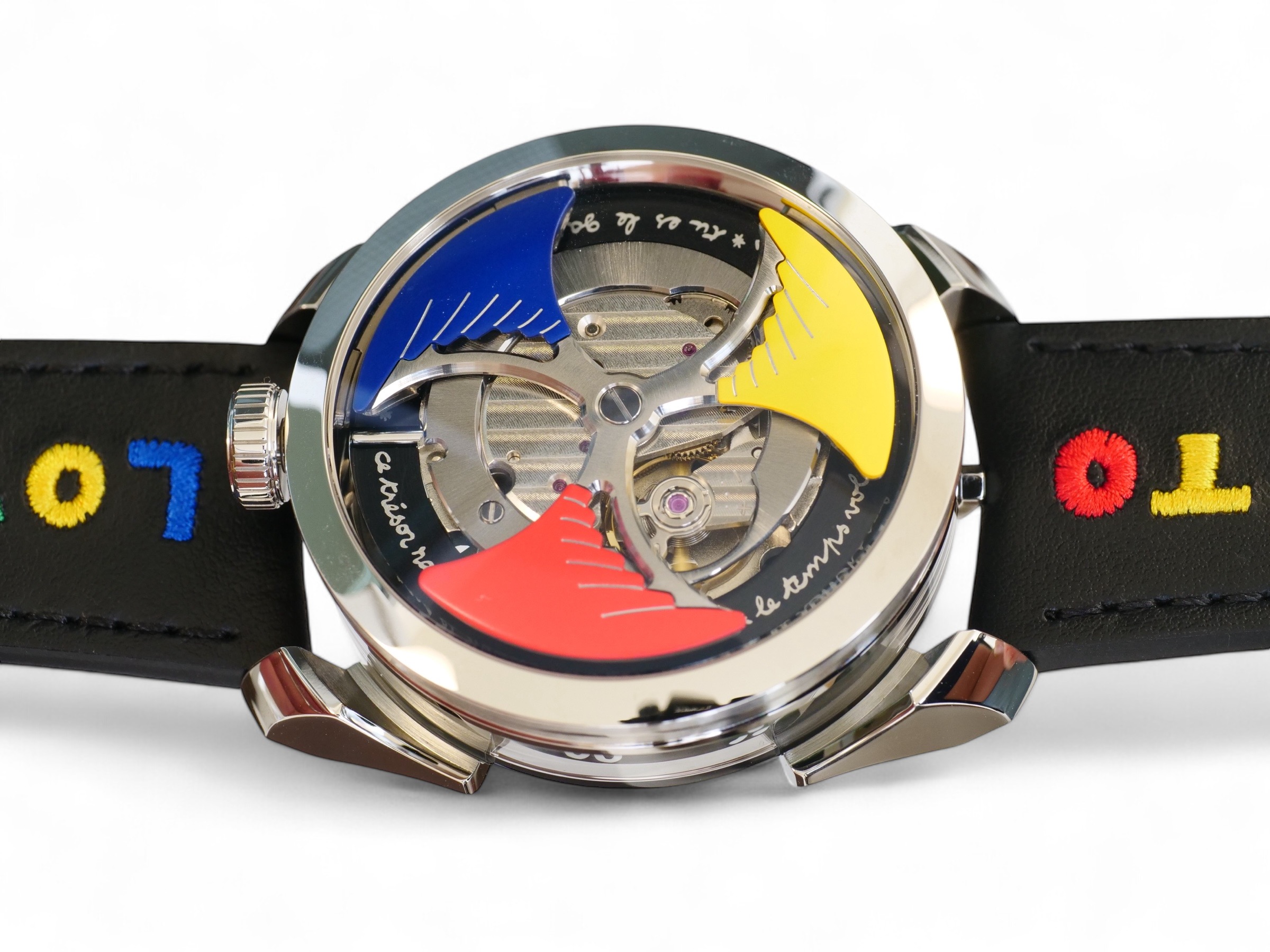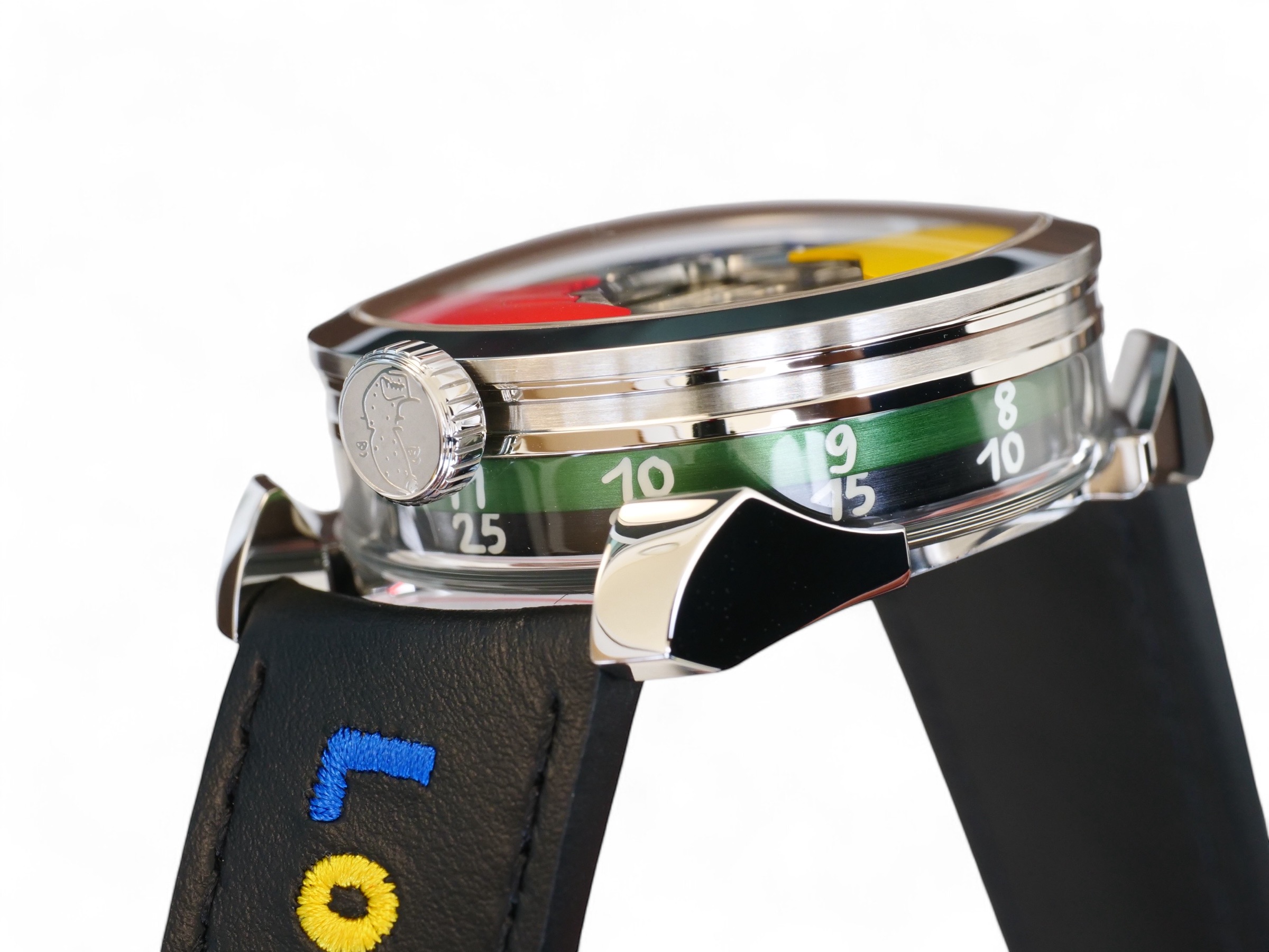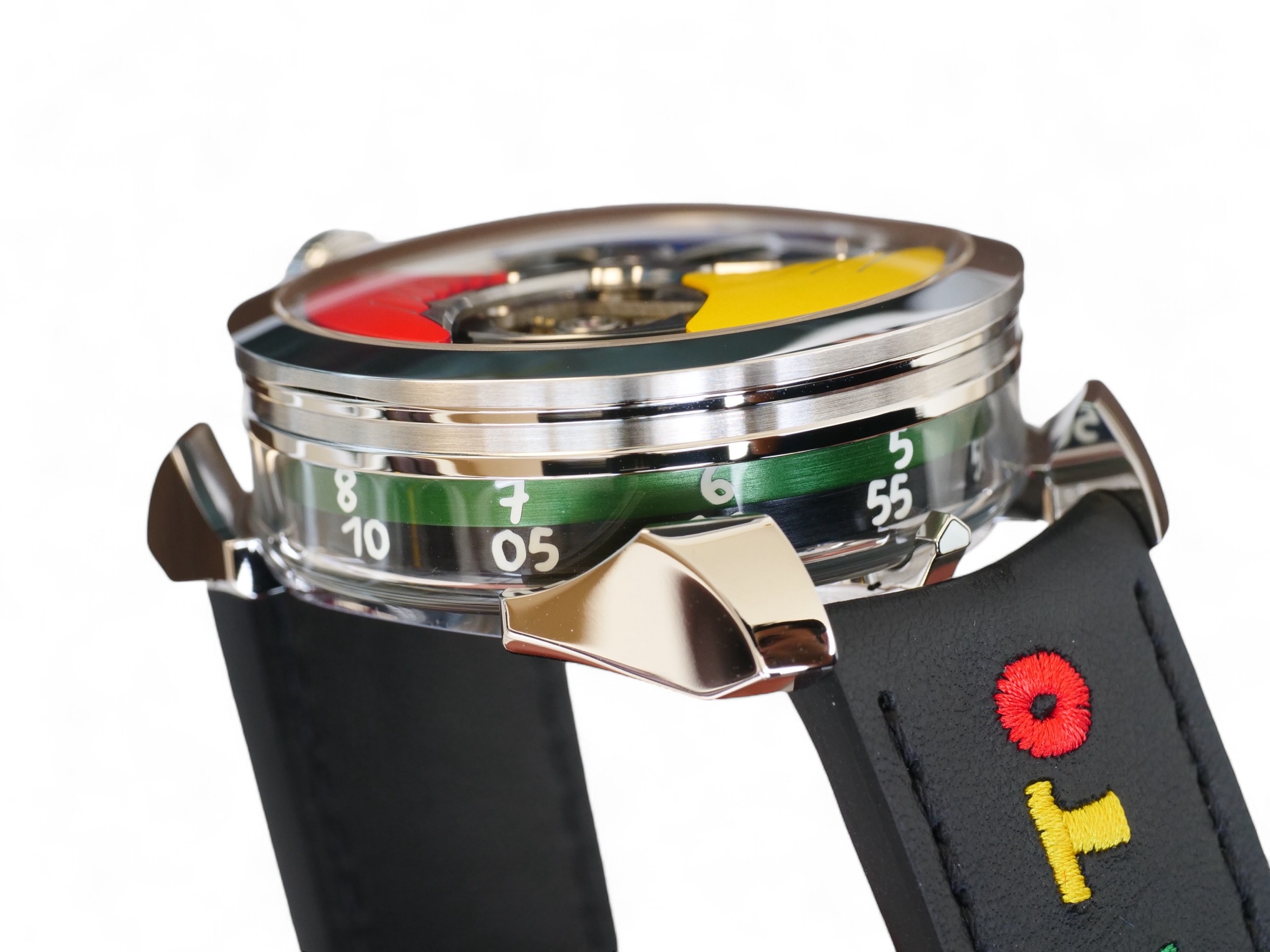 The watch showcases a fully visible triple-blade, titanium and tungsten rotor which winds one of the rare automatic movements with unidirectional winding, flipped upside-down – a nod to MB&F’s Horological Machines HM3 and HM8. Giving the watch the Castelbajac touch, the triple-blade rotor is now picked out in blue, yellow and red lacquer, and the blades are shaped like angel wings. One of the wings is slightly heavier than the others to optimise spinning on the newly engineered rotor.