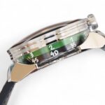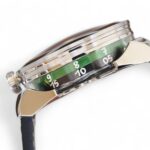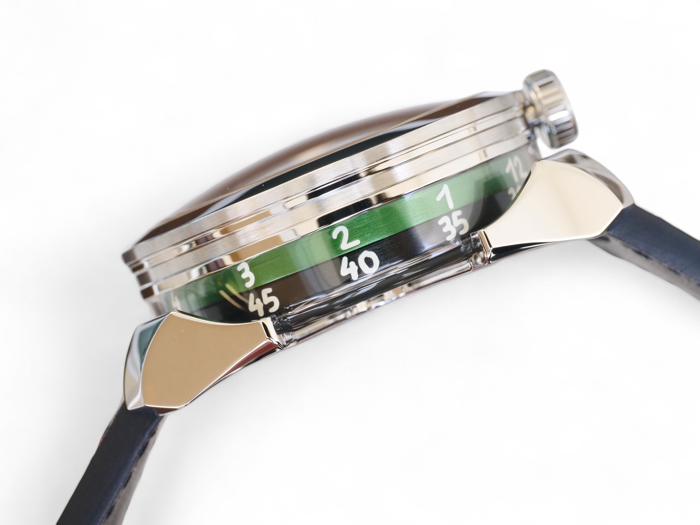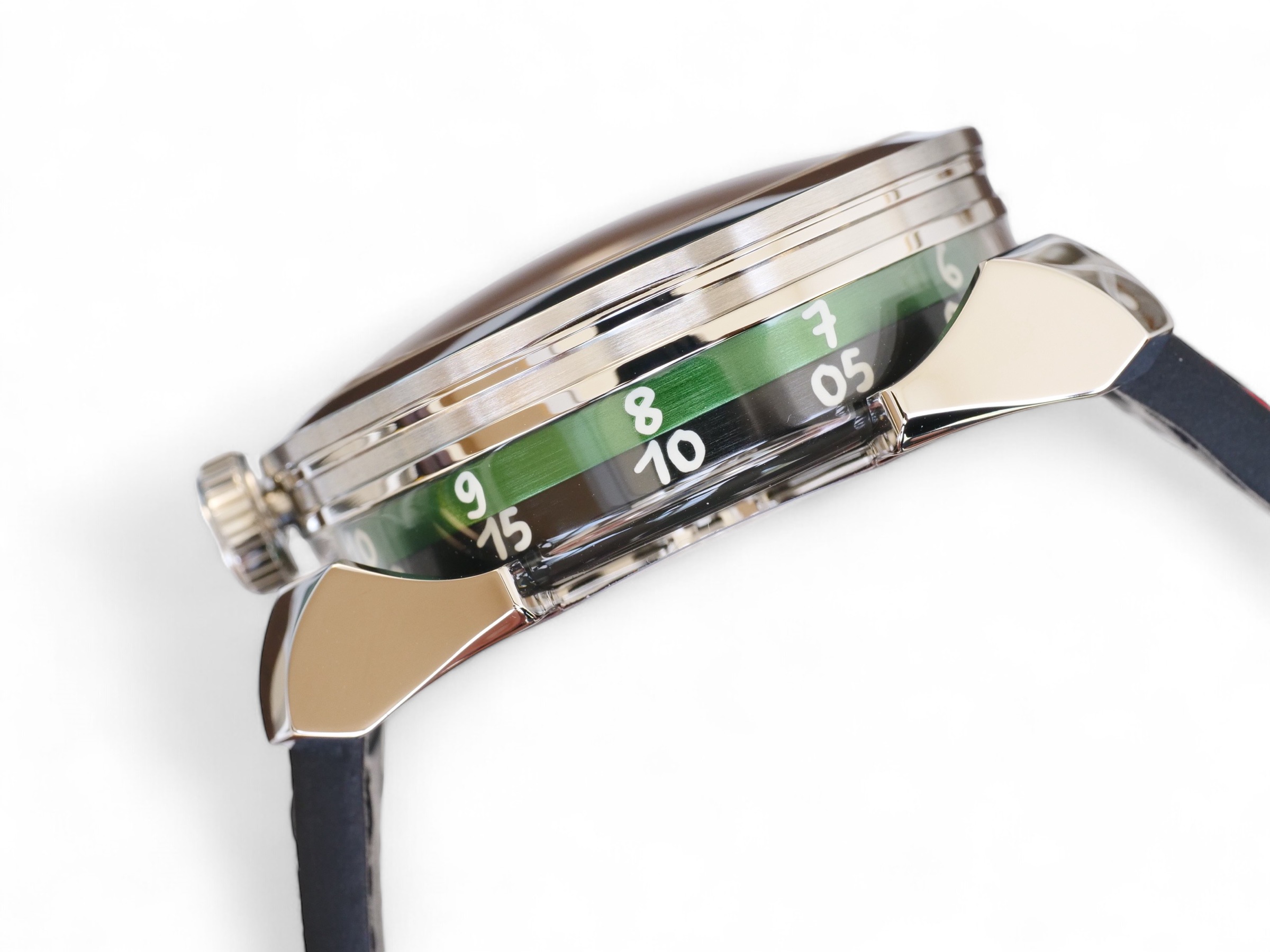 Time on this watch is displayed laterally (on the case side/rim), thanks to revolving hour and minute cylinders, engraved and boosted with Super-LumiNova.