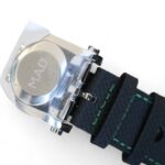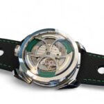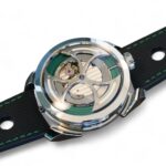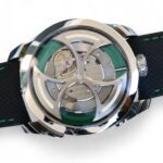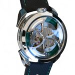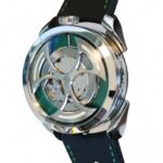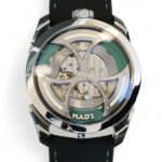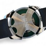 On offer for sale is a very cool and unique watch from MB&F, one of the very few available for sale, the M.A.D.1 GREEN, with a fully visible triple-blade, titanium and tungsten rotor which winds one of the rare automatic movements with unidirectional winding, flipped upside-down – a nod to MB&F’s Horological Machines HM3 and HM8.