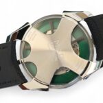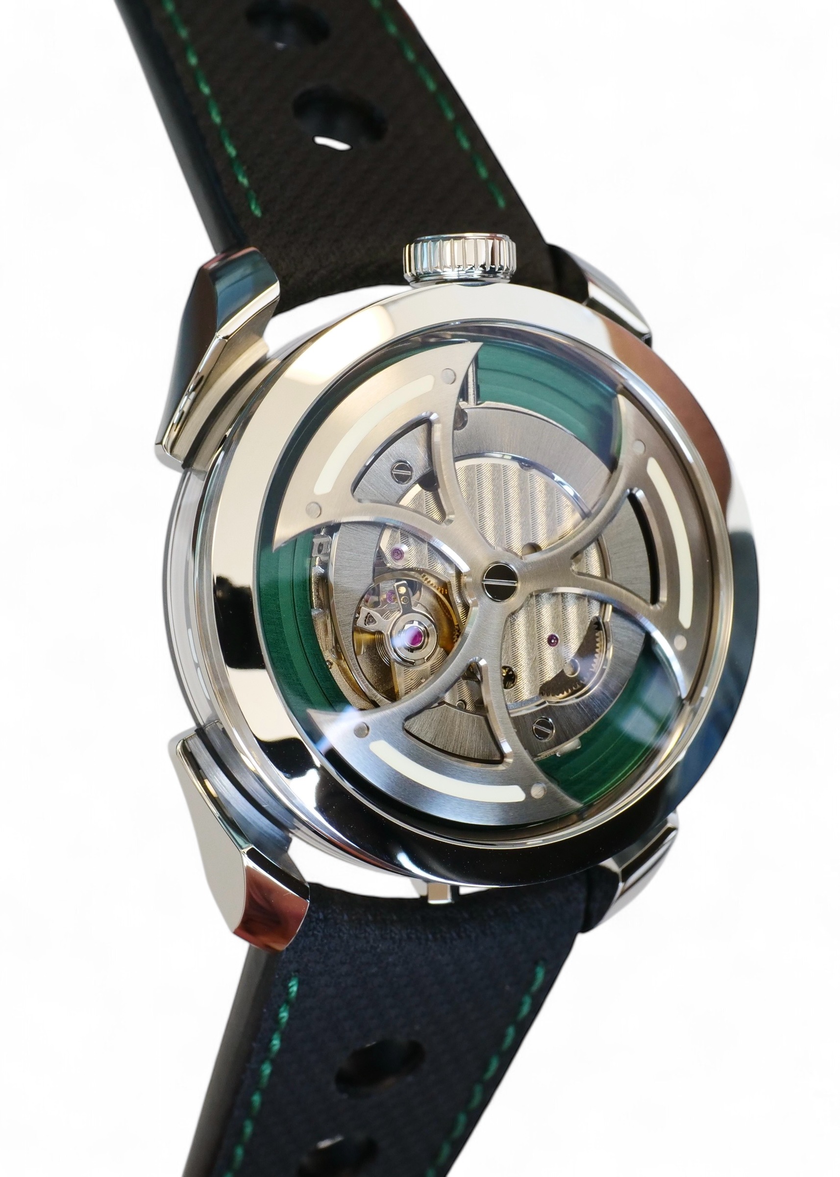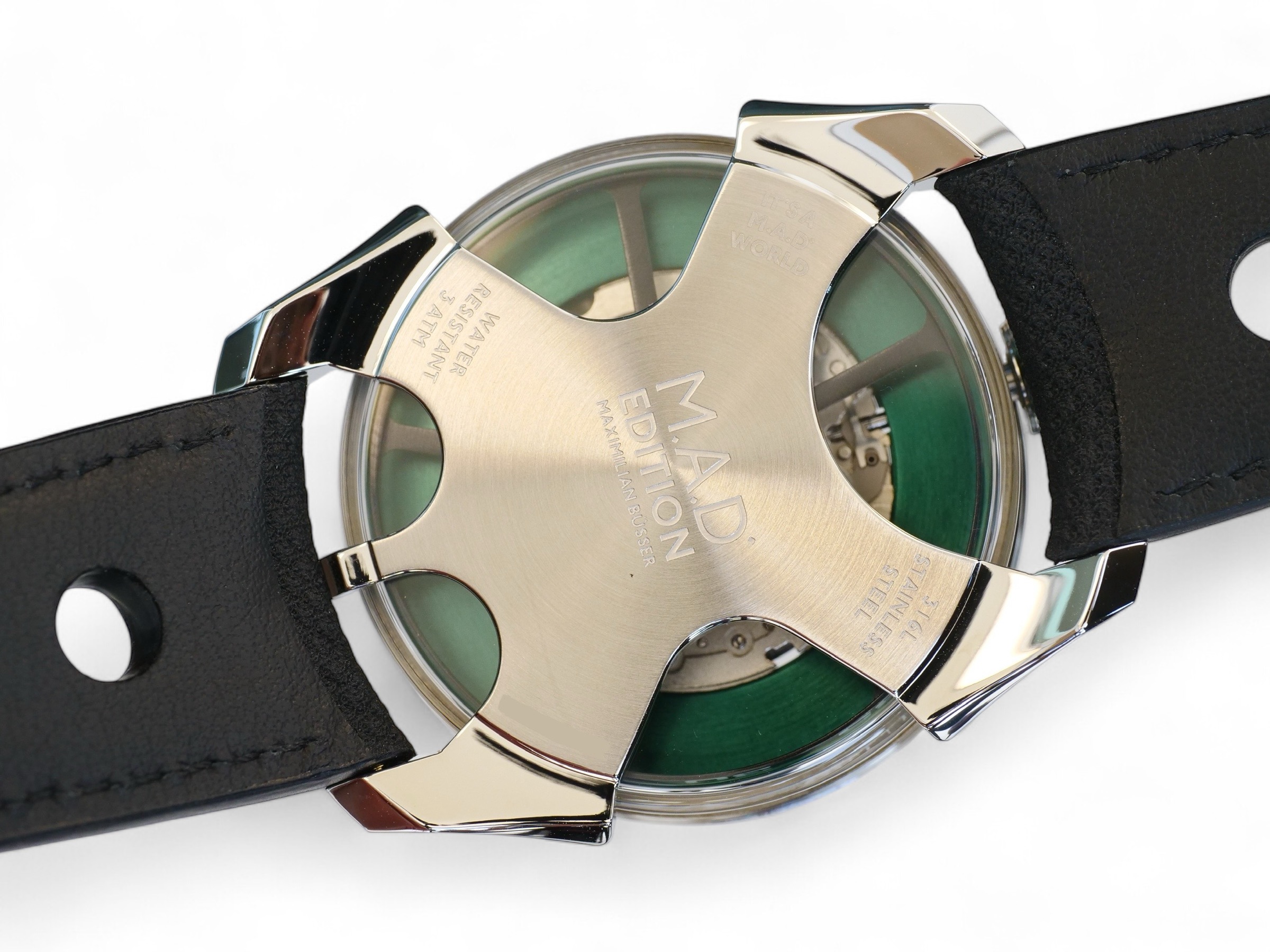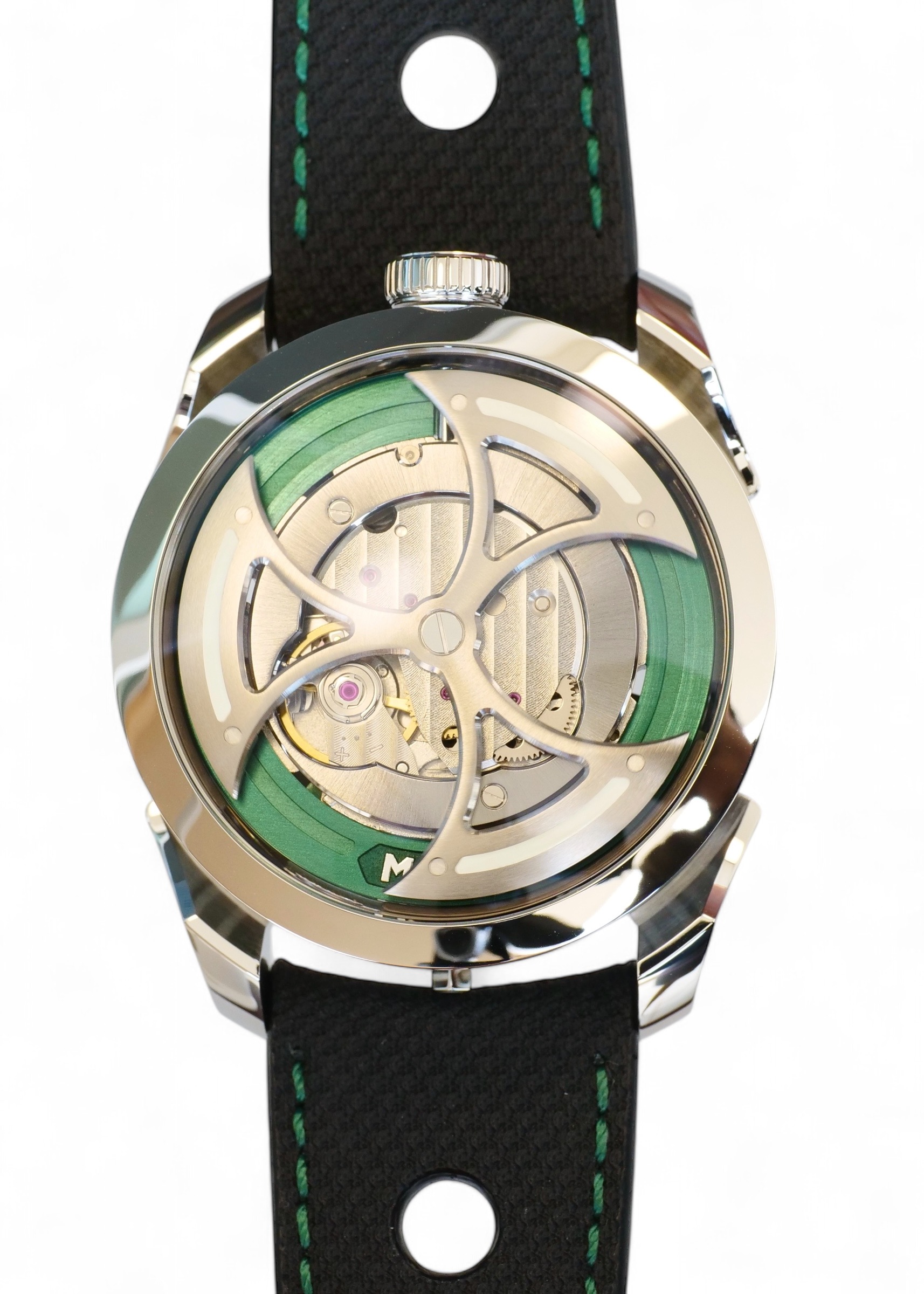 MB&F M.A.D. Editions M.A.D.1 green is on offer for sale. A very cool and unique watch from MB&F, a now-discontinued and no longer produced, the M.A.D.1 GREEN, with a fully visible triple-blade, titanium and tungsten rotor which winds one of the rare automatic movements with unidirectional winding, flipped upside-down – a nod to MB&F’s Horological Machines HM3 and HM8.