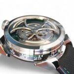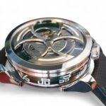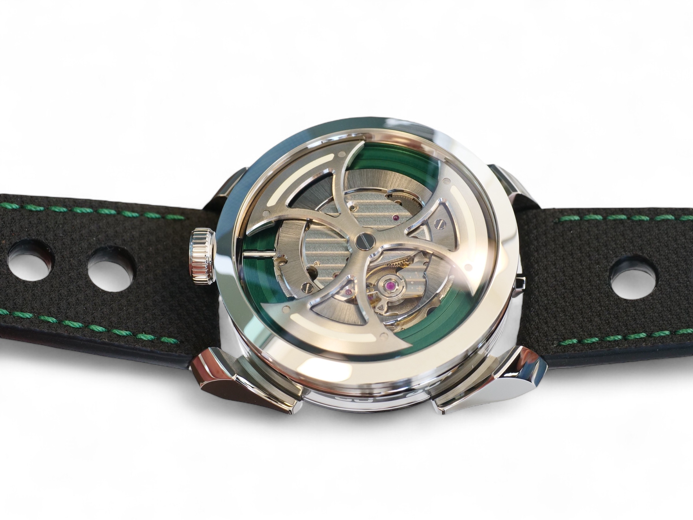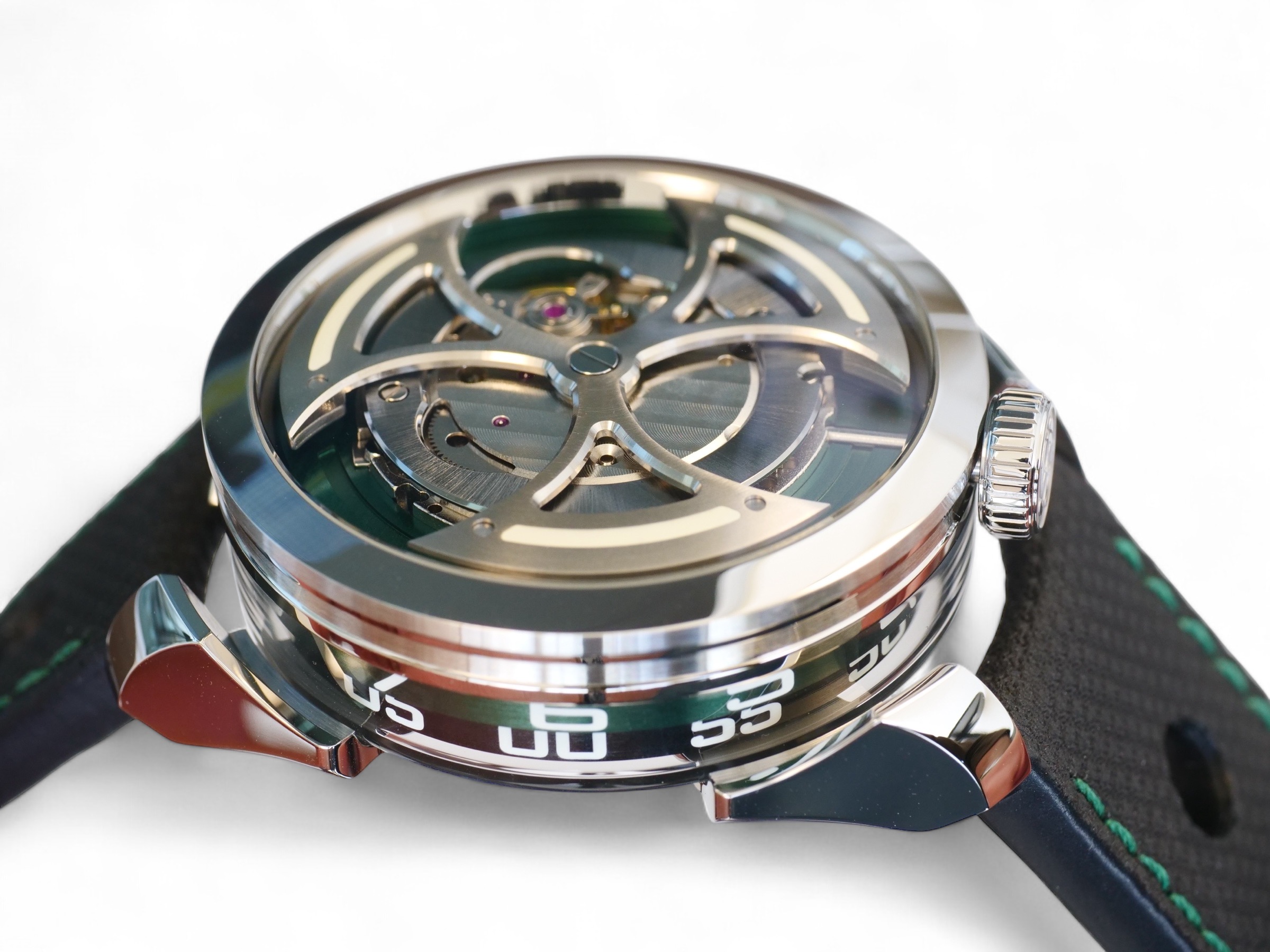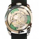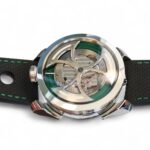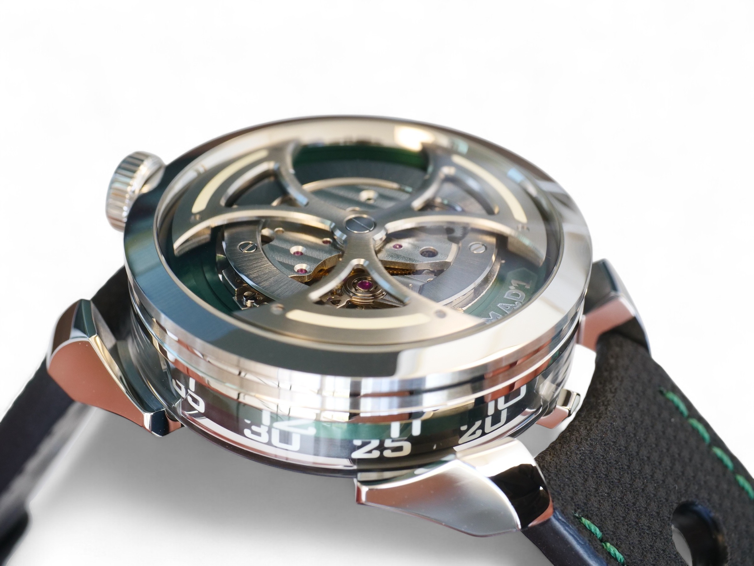 MB&F M.A.D. Editions M.A.D.1 green is on offer for sale. A very cool and unique watch from MB&F, a now-discontinued and no longer produced, the M.A.D.1 GREEN, with a fully visible triple-blade, titanium and tungsten rotor which winds one of the rare automatic movements with unidirectional winding, flipped upside-down – a nod to MB&F’s Horological Machines HM3 and HM8.