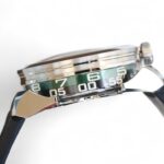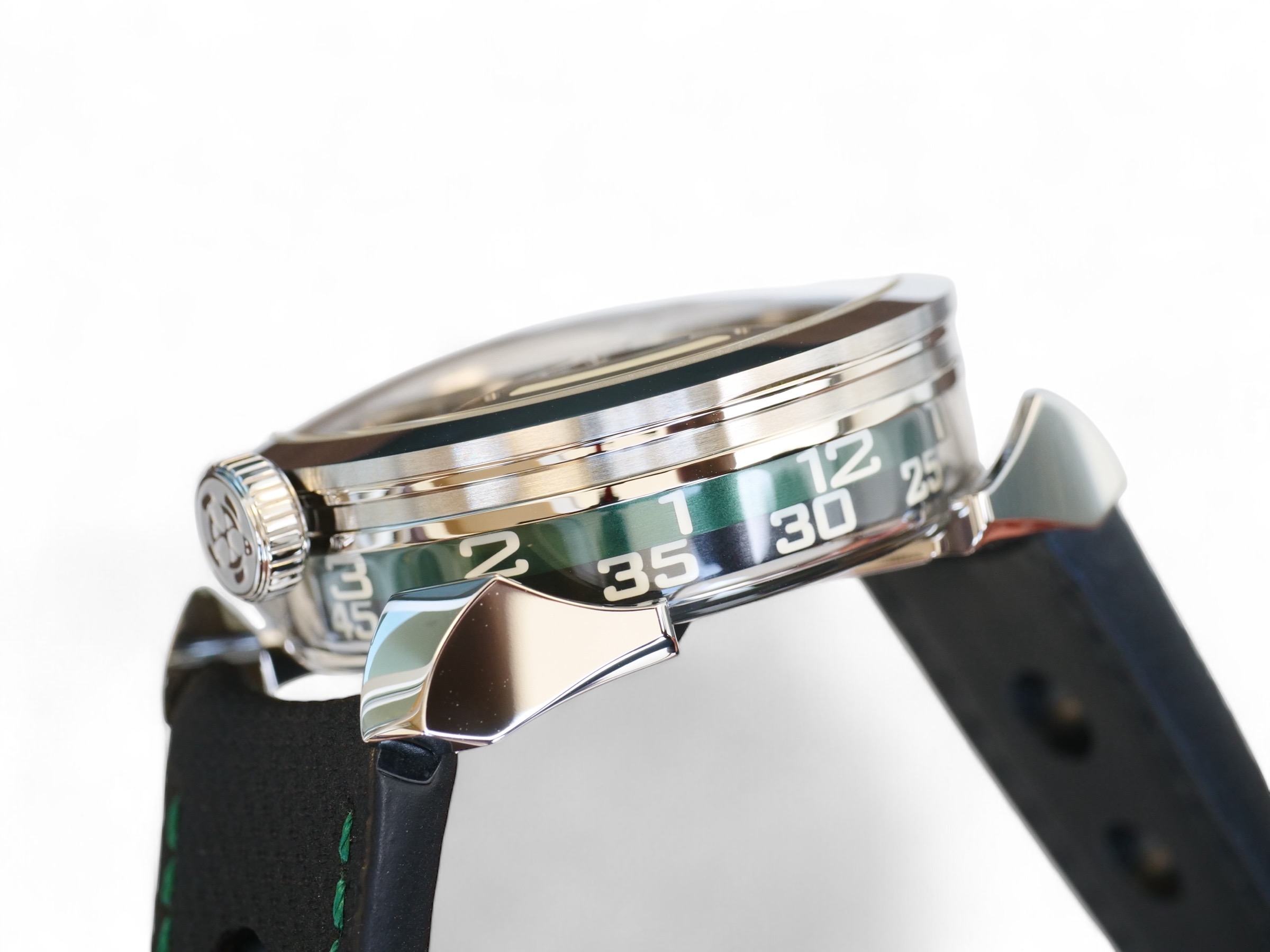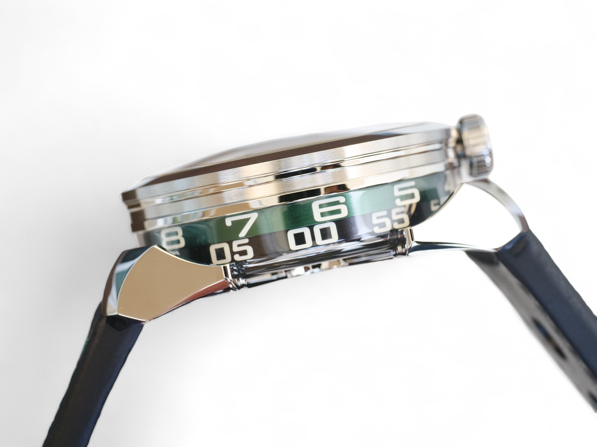 Time on this watch is displayed laterally (on the case side/rim), thanks to revolving hour and minute cylinders, engraved and boosted with Super-LumiNova.