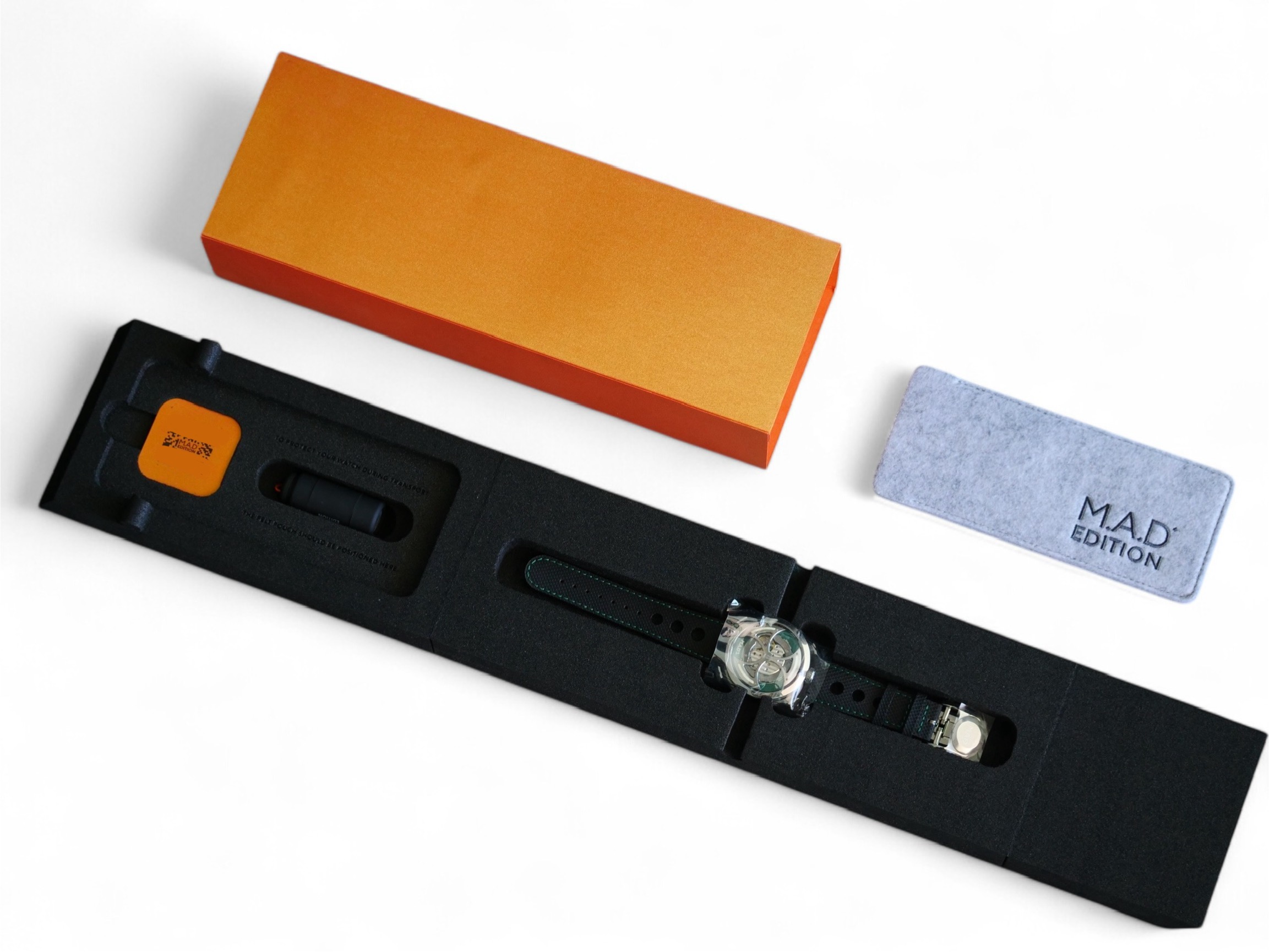 All photos are of the actual MB&F M.A.D. Editions M.A.D.1 green watch available for sale and form part of the description. Please let us know if you’d like any additional photos. Please note that all watch serials and dates are greyed out in the photos due to privacy and security reasons.