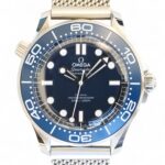 The Omega James Bond 007 Seamaster, launched in 2022, to celebrate 60 years of James Bond, this 42mm Seamaster Diver 300M in stainless steel, has a blue oxalic anodized aluminium dial, with laser engraved waves, inspired by the Seamaster Diver 300M worn by James Bond in 1995’s GoldenEye. A commemorative 60 replaces the diving scale’s traditional inverted triangle.