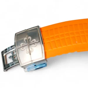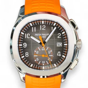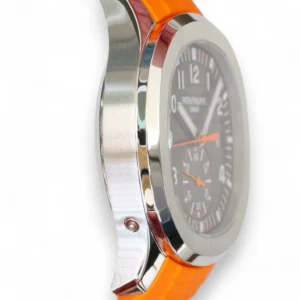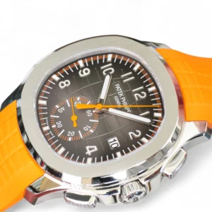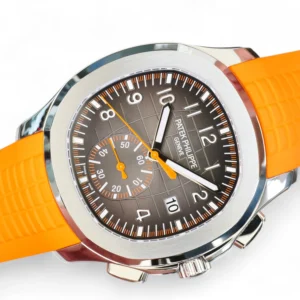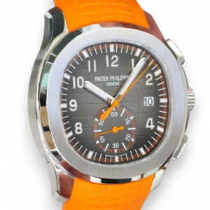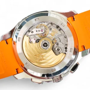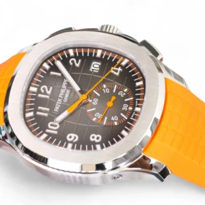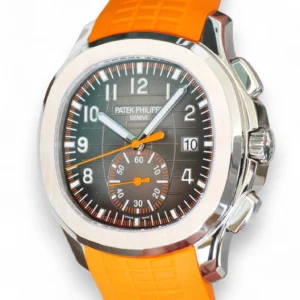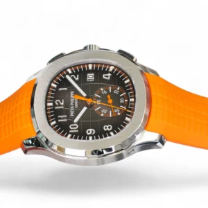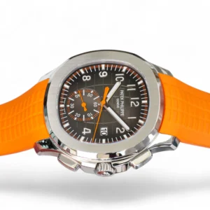 Patek Philippe Aquanaut Flyback Chronograph. the sporty and very contemporary Aquanaut collection’s first chronograph – a complication that perfectly matches the character of this youthful and dynamic timepiece line. Endowed with a self-winding flyback chronograph movement, the Reference 5968A-001 also stands out with remarkable aesthetic appeal, typified by orange chronograph display contrasting against the black dial. It comes with two straps: one orange, one black, in an ultra-resistant composite material.