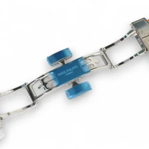 This Patek Philippe Aquanaut Chronograph comes in Like-New and Mint and unpolished/factory-finish condition and is delivered with the new-style Patek deployant clasp with Patek logo on the inner side. The watch is only very lightly used and comes with factory stickers on the clasp and underside of the clasp, as can be seen in the photos.