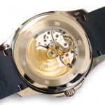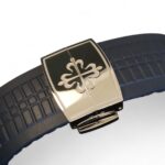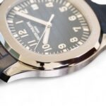 Paying tribute to the 20th anniversary of the Patek Philippe Aquanaut launched in 1997, the men’s model in the new 42.2-millimeter “Jumbo” format. It features an embossed dial subtly gradated from black to night blue, and a blue rubber strap with a white gold double deployment block.. Decidedly masculine looks for this incarnation of casually elegant chic framed by a delicately satin-finished bezel. The extra-thin 8.2mm white-gold case houses the self-winding caliber 324 S C movement showcases through a see-through transparent case back.