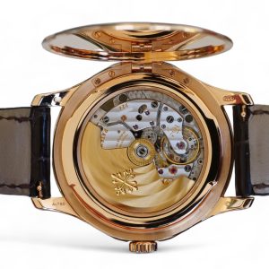 What makes the 5227R a very interesting and unique watch is that its exhibition case back is protected by an invisibly-hinged dust cover i.e. the case back looks closed, but you can hinge open the dust cover and you have a full display of intricate and exceptionally excuted Patek calibre 324 S C.