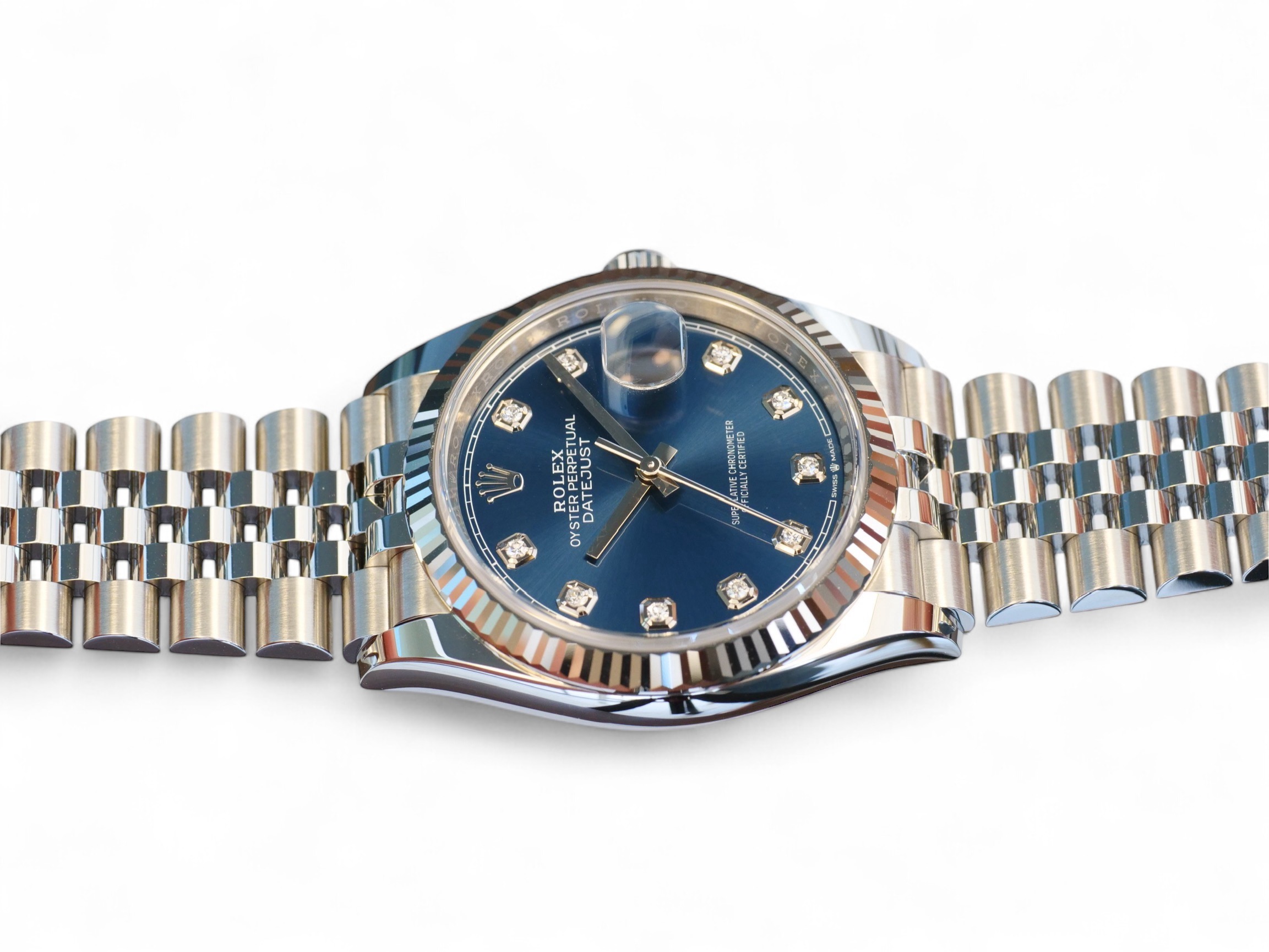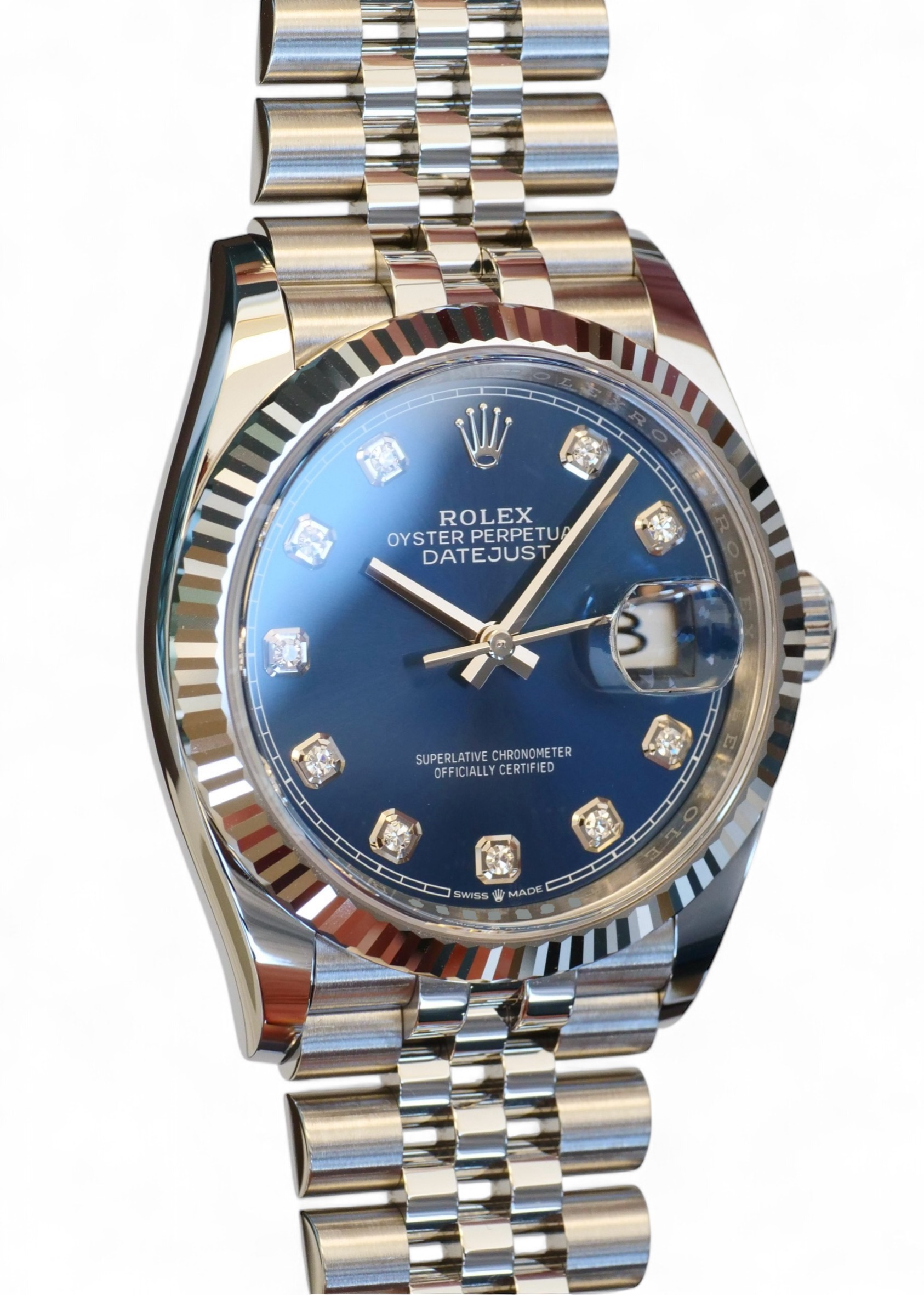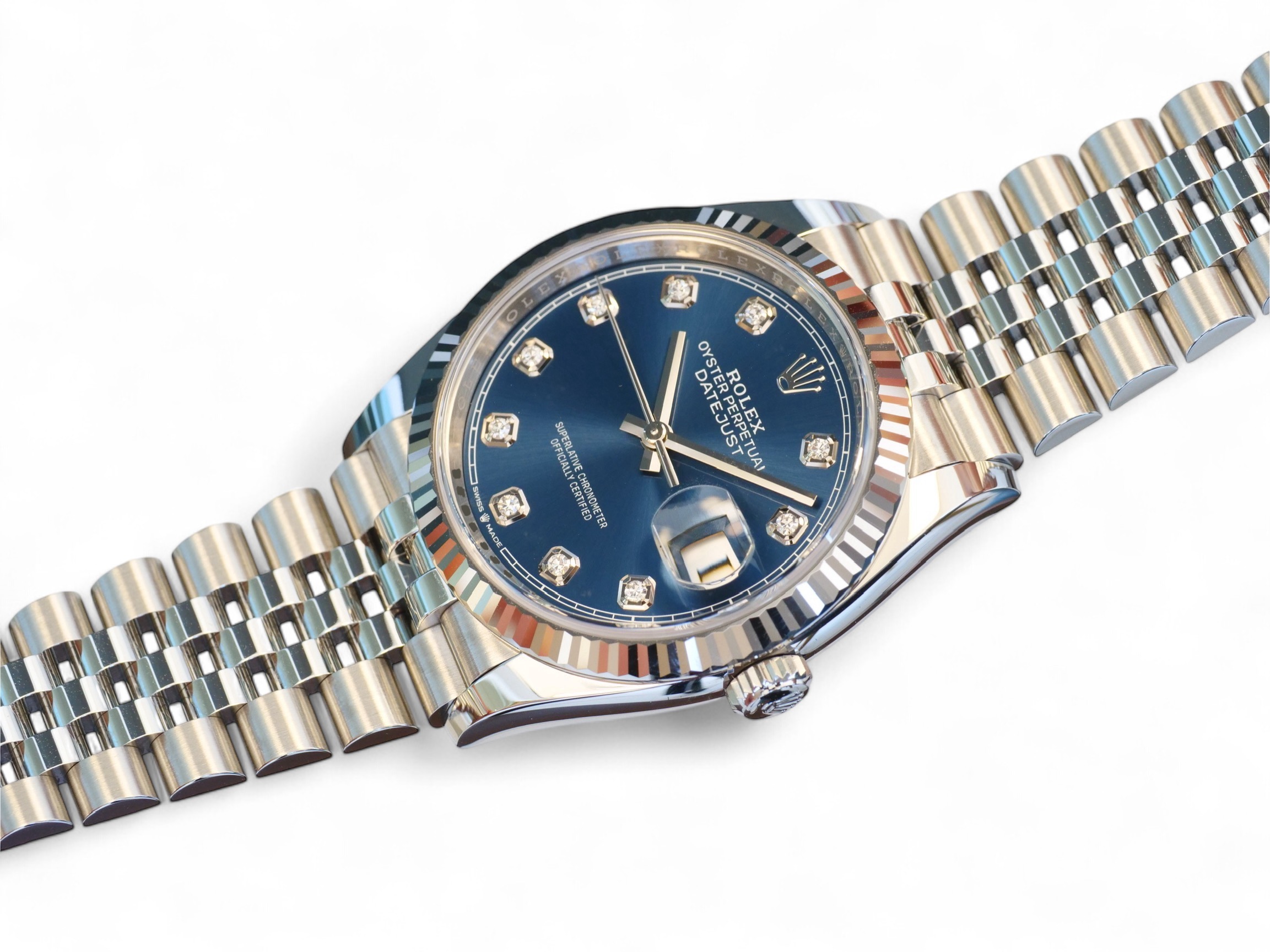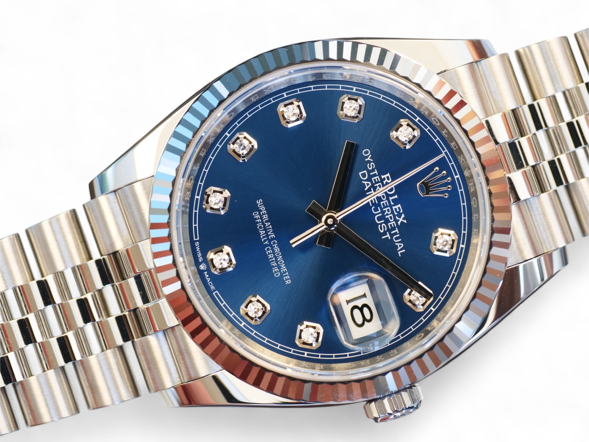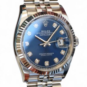 Rolex Datejust 36 blue diamond-set dial, a stunning timepiece in Oystersteel with 18ct fluted bezel, a very collectible model in the most sought-after configuration of 18ct fluted bezel and a jubilee bracelet.