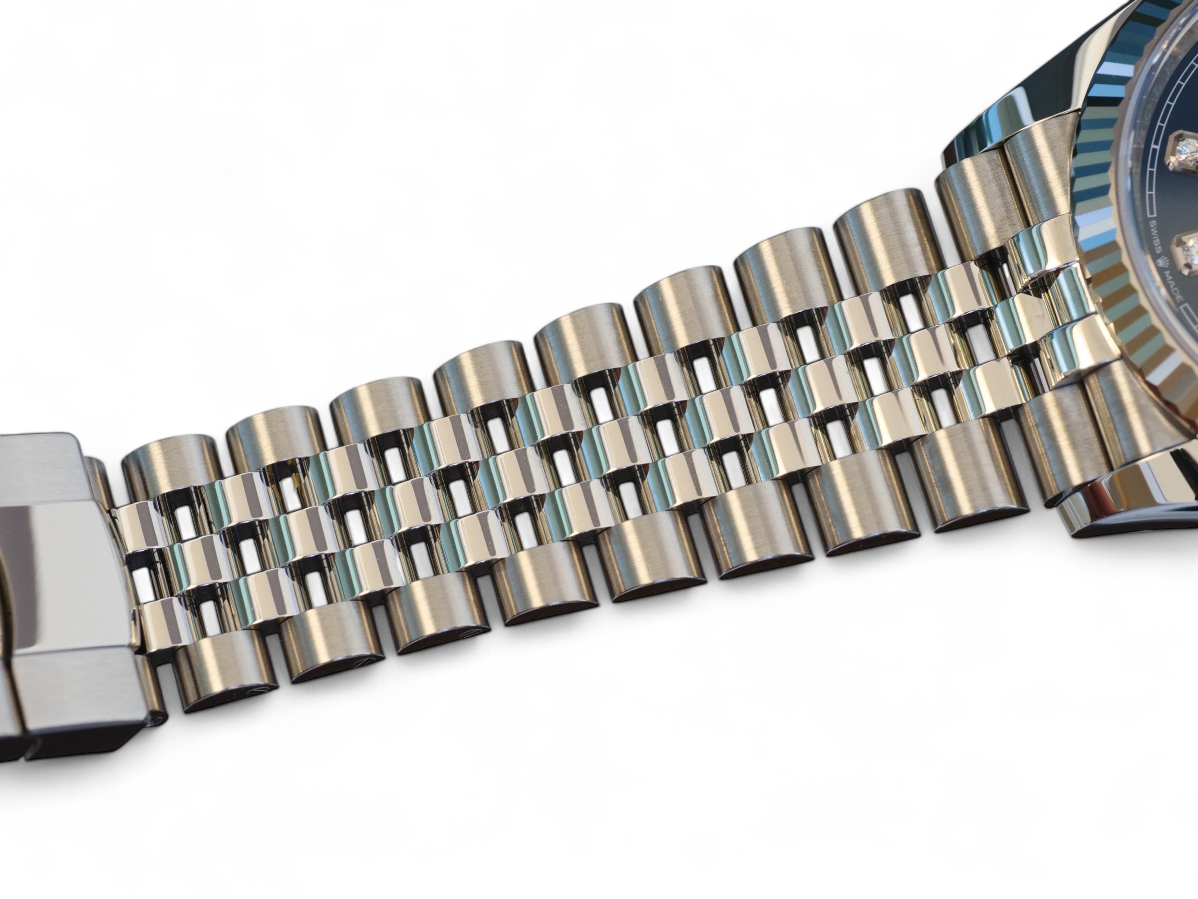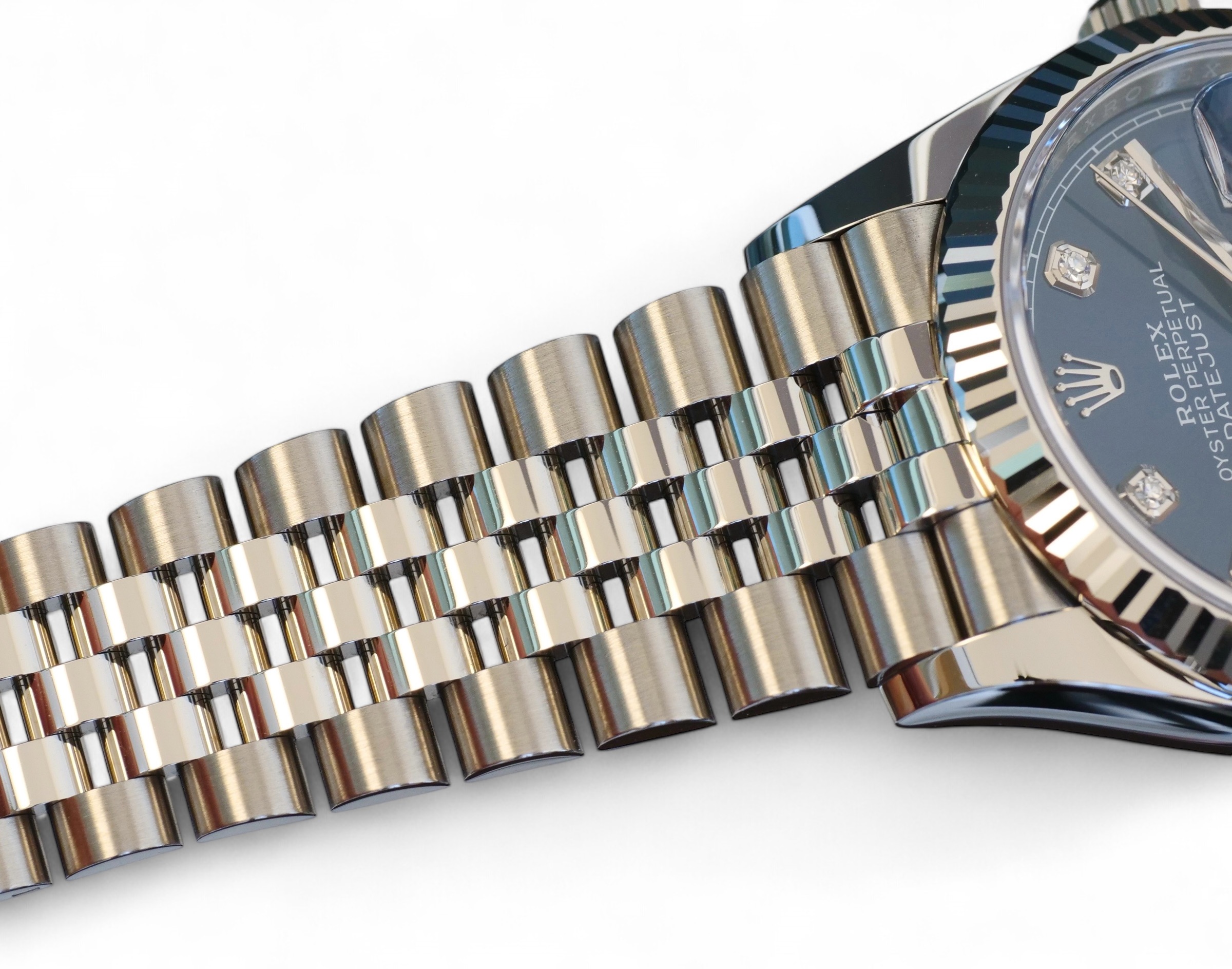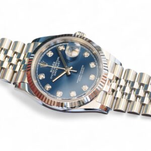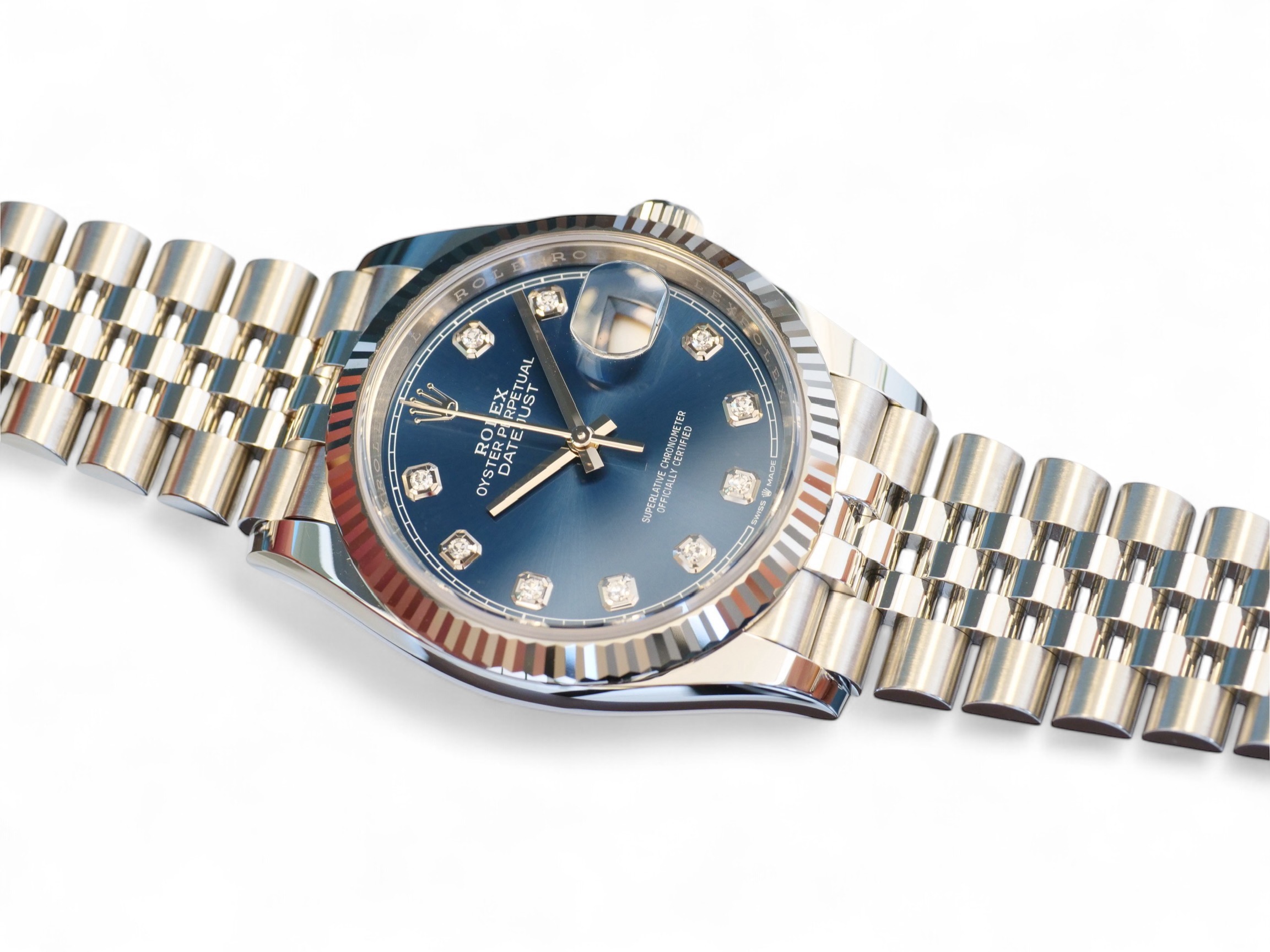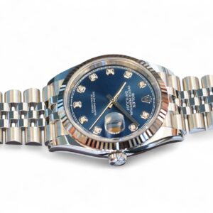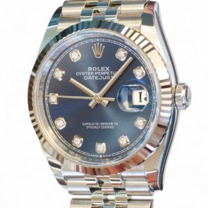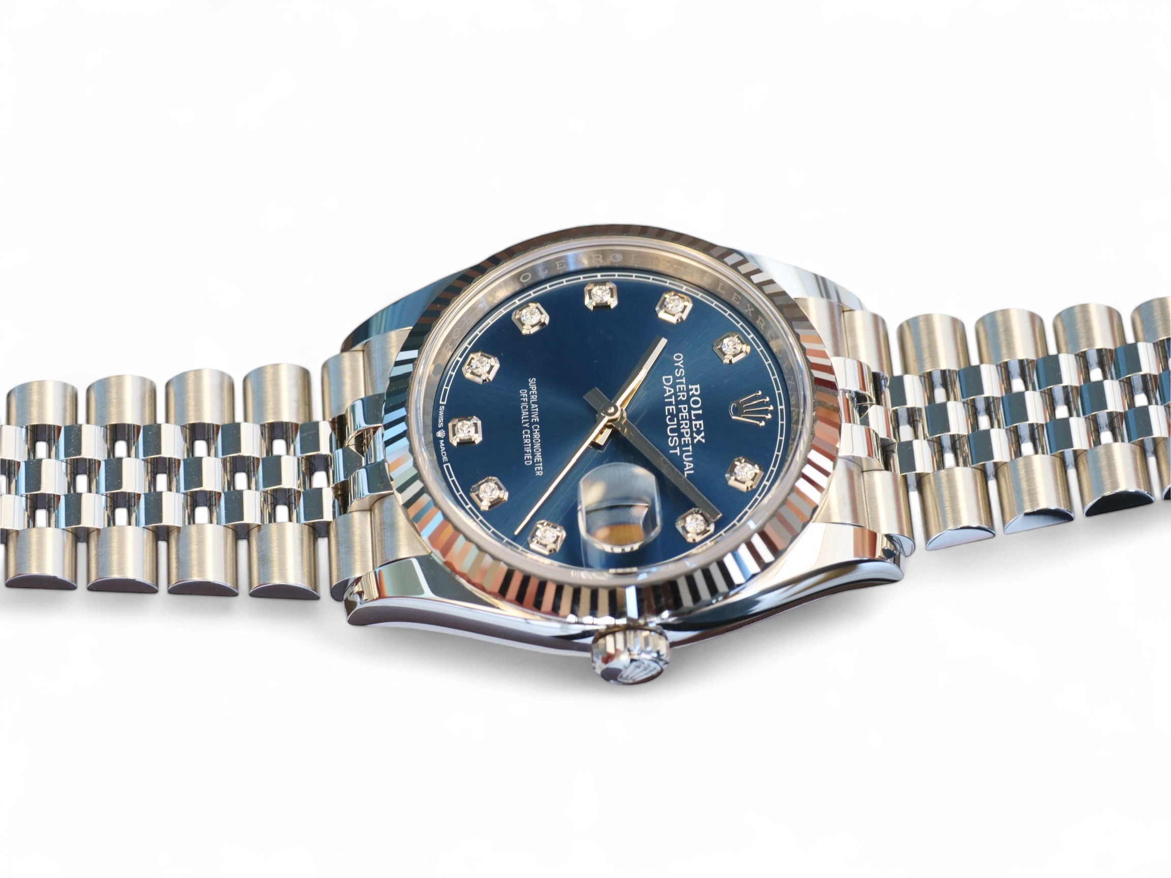 Rolex Datejust 36 blue diamond-set dial, a stunning timepiece in Oystersteel with 18ct fluted bezel, a very collectible model in the most sought-after configuration of 18ct fluted bezel and a jubilee bracelet.
