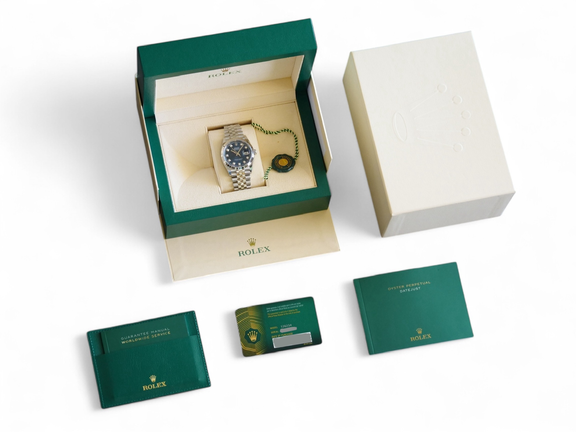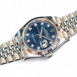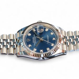 All photos are of the actual Rolex Datejust 36 blue diamond-set dial watch for sale, and form part of the description and condition disclosure. The watch serial number is redacted from the photos for security and privacy reasons.
