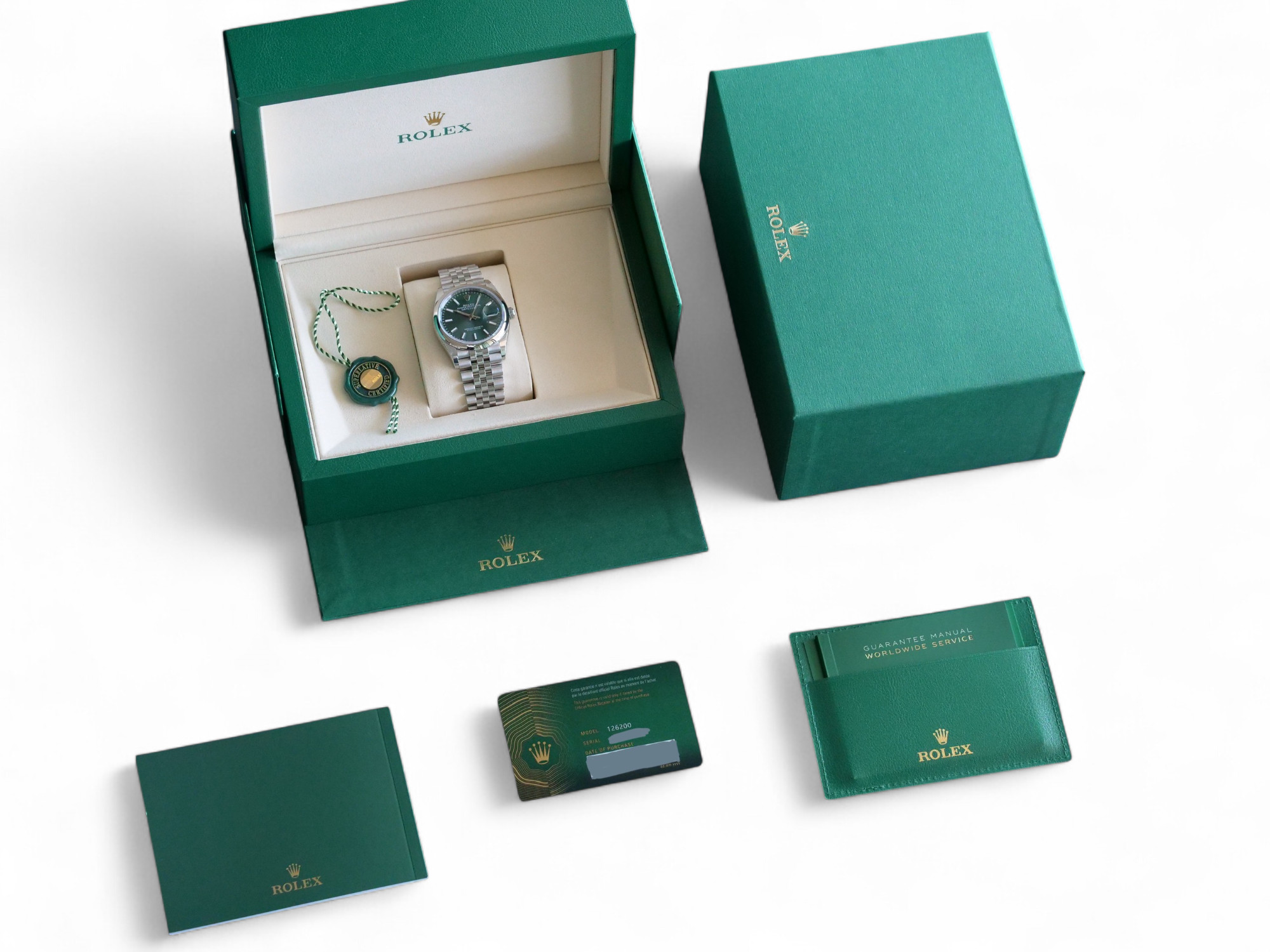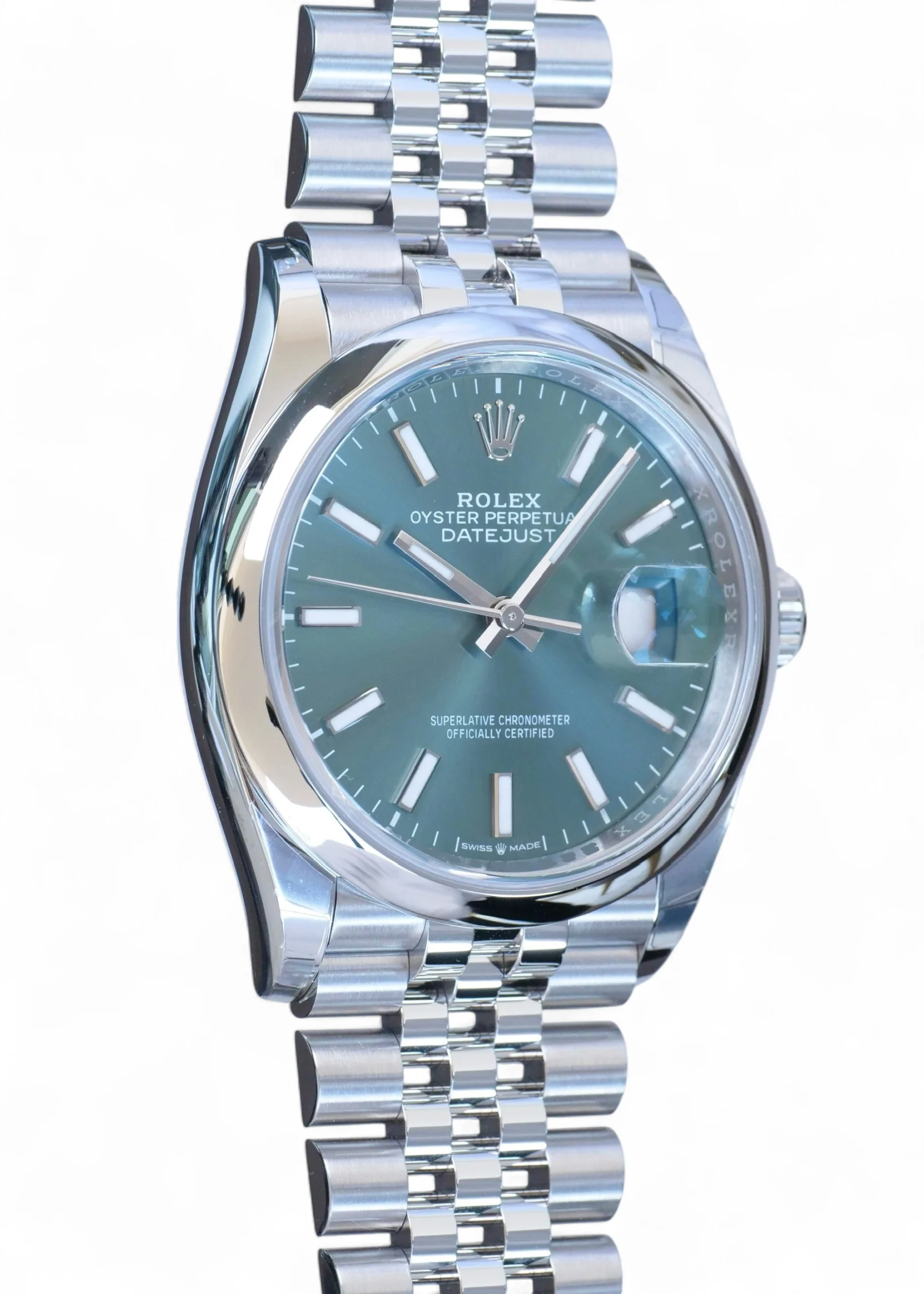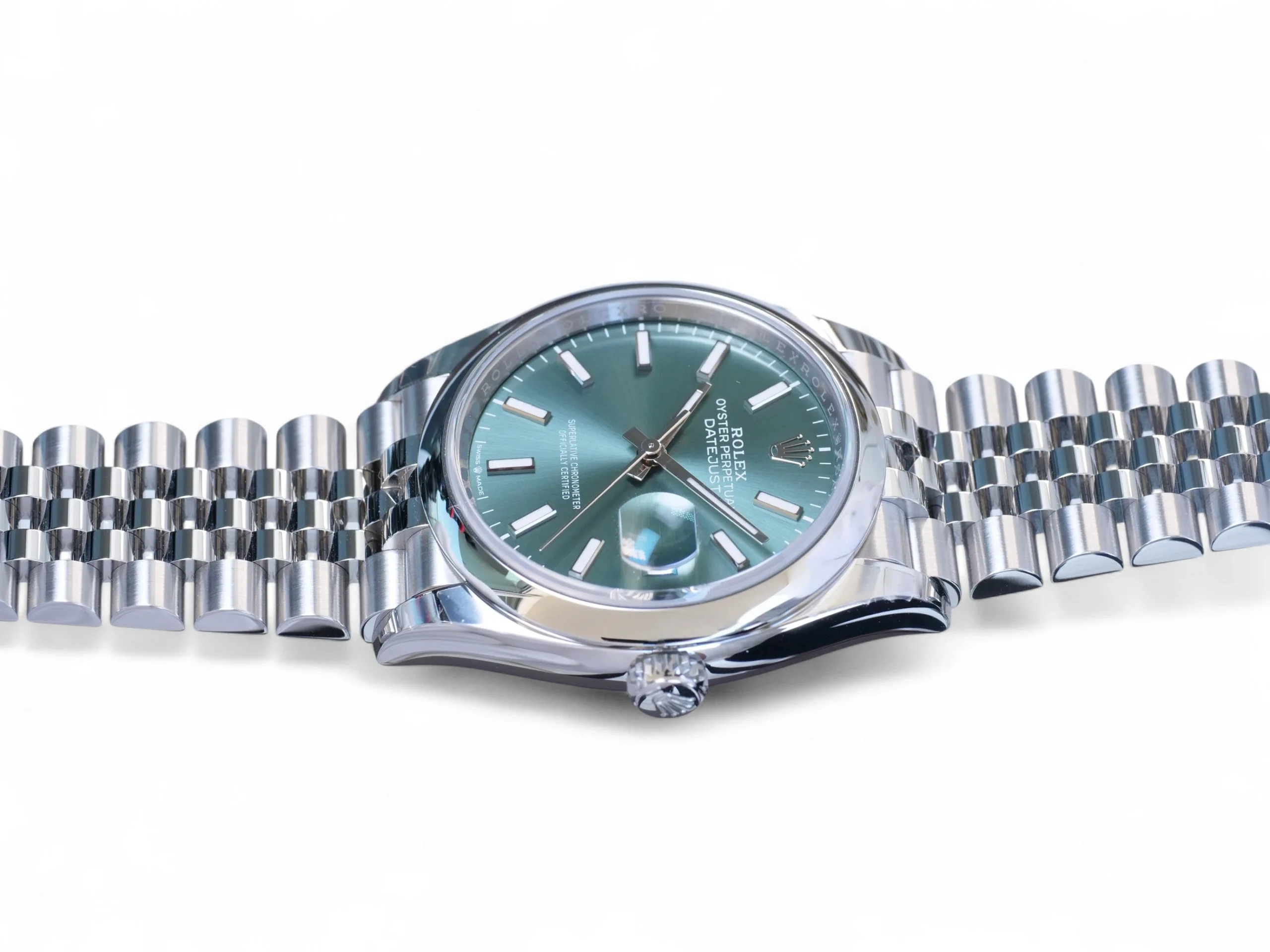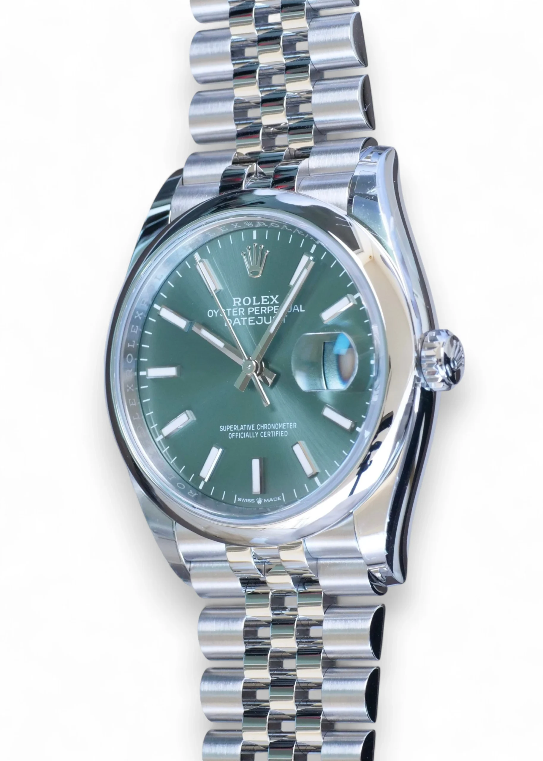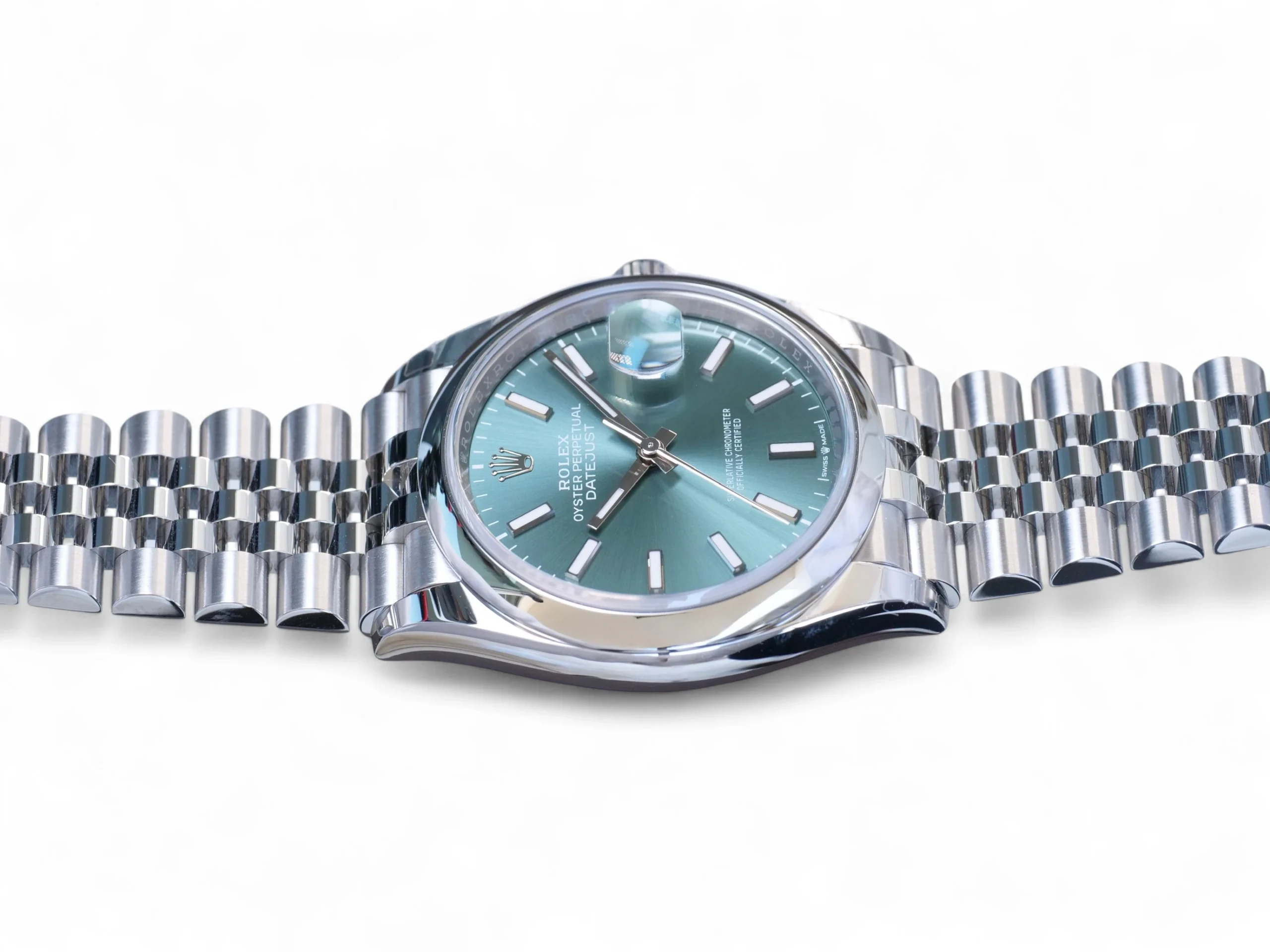 Rolex Datejust 36 Model 126200, in the highly popular and very sought after Mint Green dial, Smooth bezel and Jubilee bracelet.