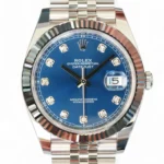 All photos are of the actual Rolex Datejust 41 Blue Diamond Dial timepiece for sale, and form part of the description and condition disclosure. The photos are indicative of the new condition that the watch presents. The serial number is redacted from all the photos, as applicable, along with the date on the warranty card for security and privacy reasons.