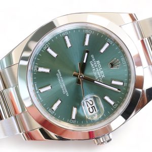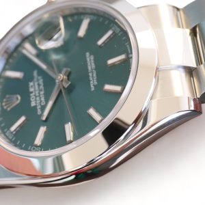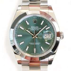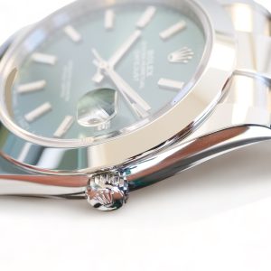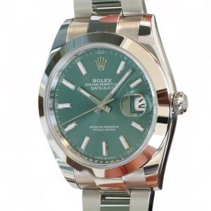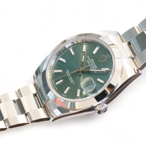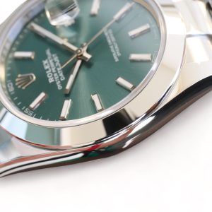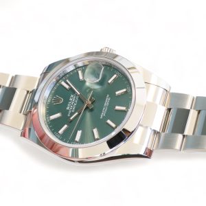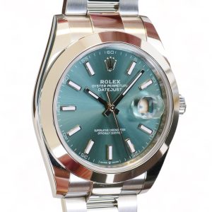 On offer for sale is a very sought after and popular Rolex Datejust 41 in a spectacular Mint Green dial with radial suburst treatment, smooth bezel and Oyster bracelet, model reference 126300.