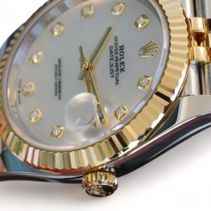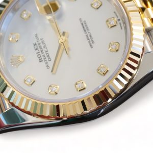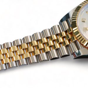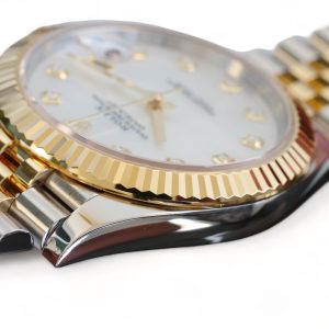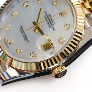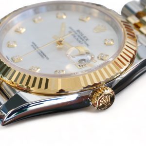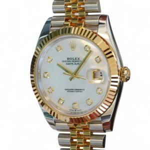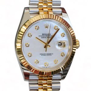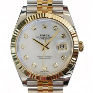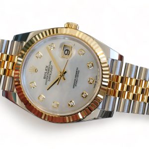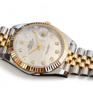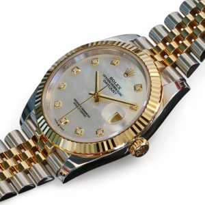 On offer for sale is argubaly, one of the most beautiful Rolex Datejust 41 configurations, model reference 126333 in two tone of Oystersteel and 18ct yellow gold, Mother of Pearl dial with 10 point diamond set dial, 18ct fluted bezel and jubilee bracelet.