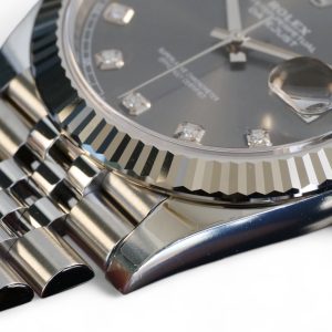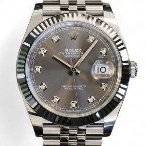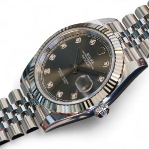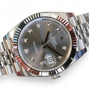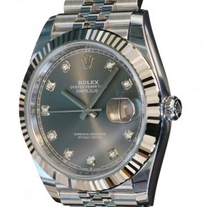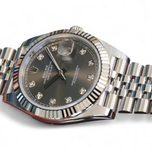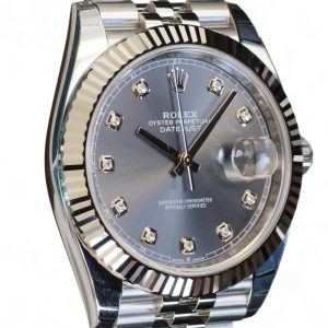 On offer for sale is an all-time classic, a very iconic and historic Rolex Datejust 41 in a very beautiful configuration of Slate factory diamond-set dial and the most sought after configuration of 18ct white gold fluted bezel and a jubilee bracelet.