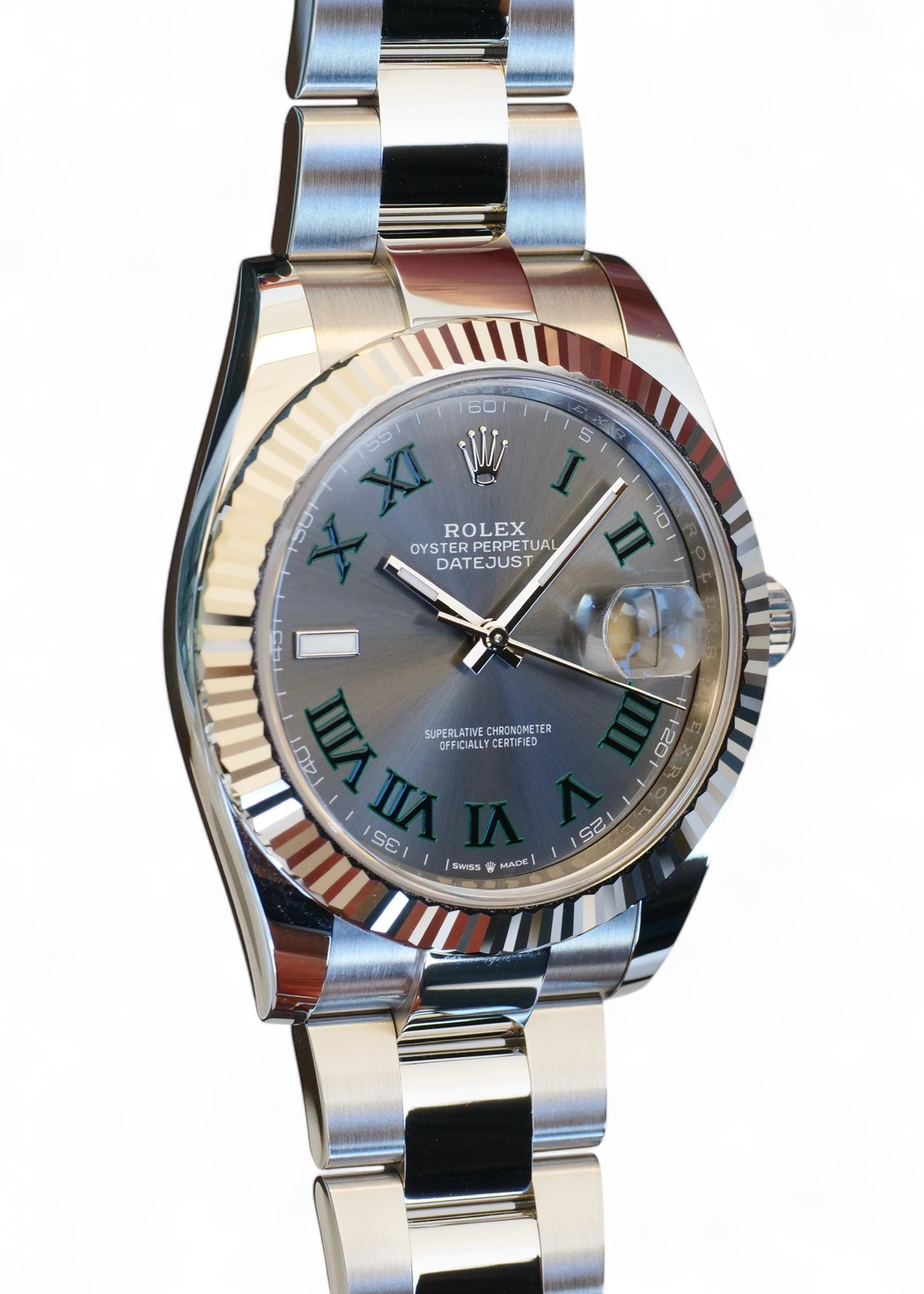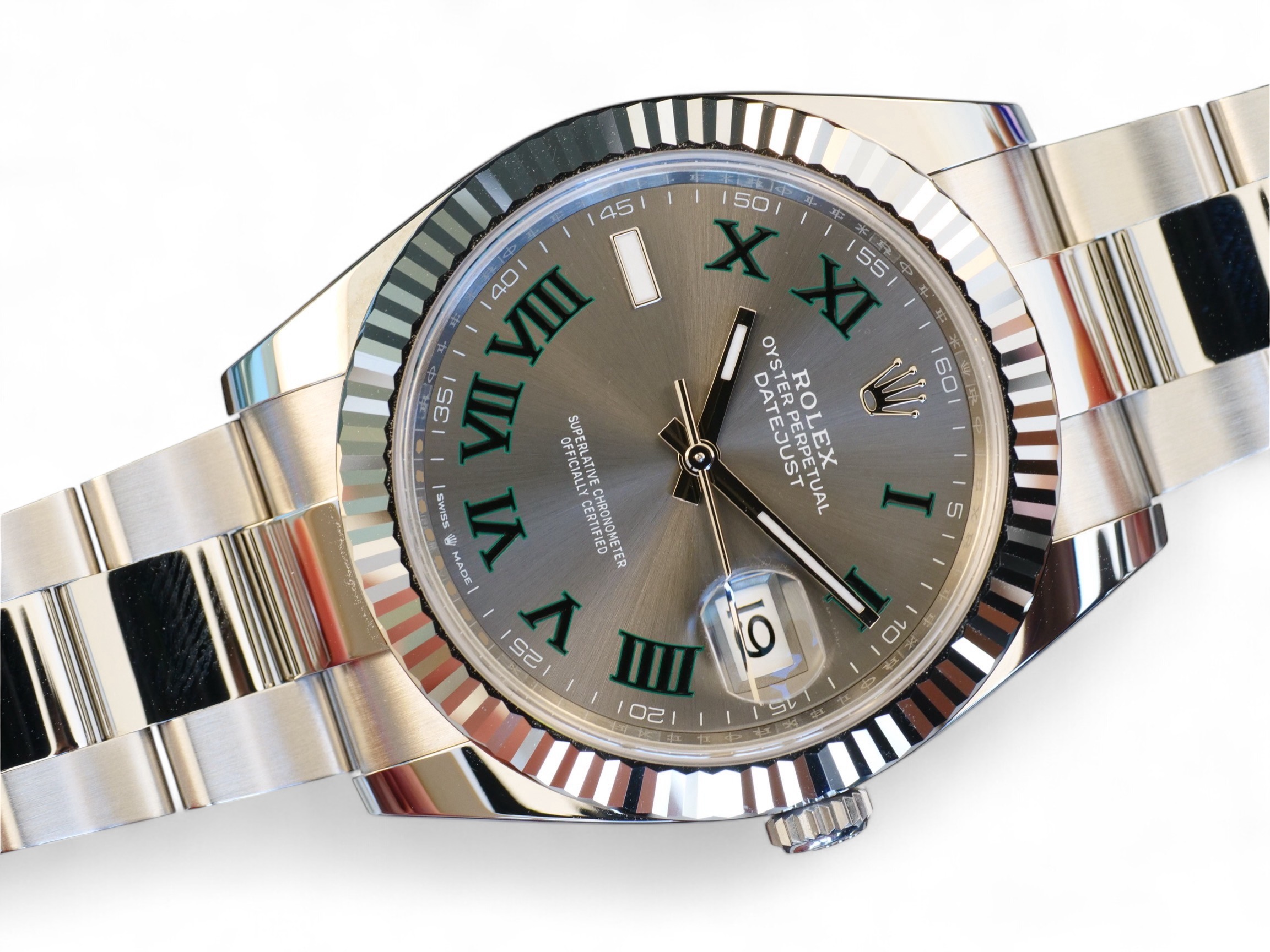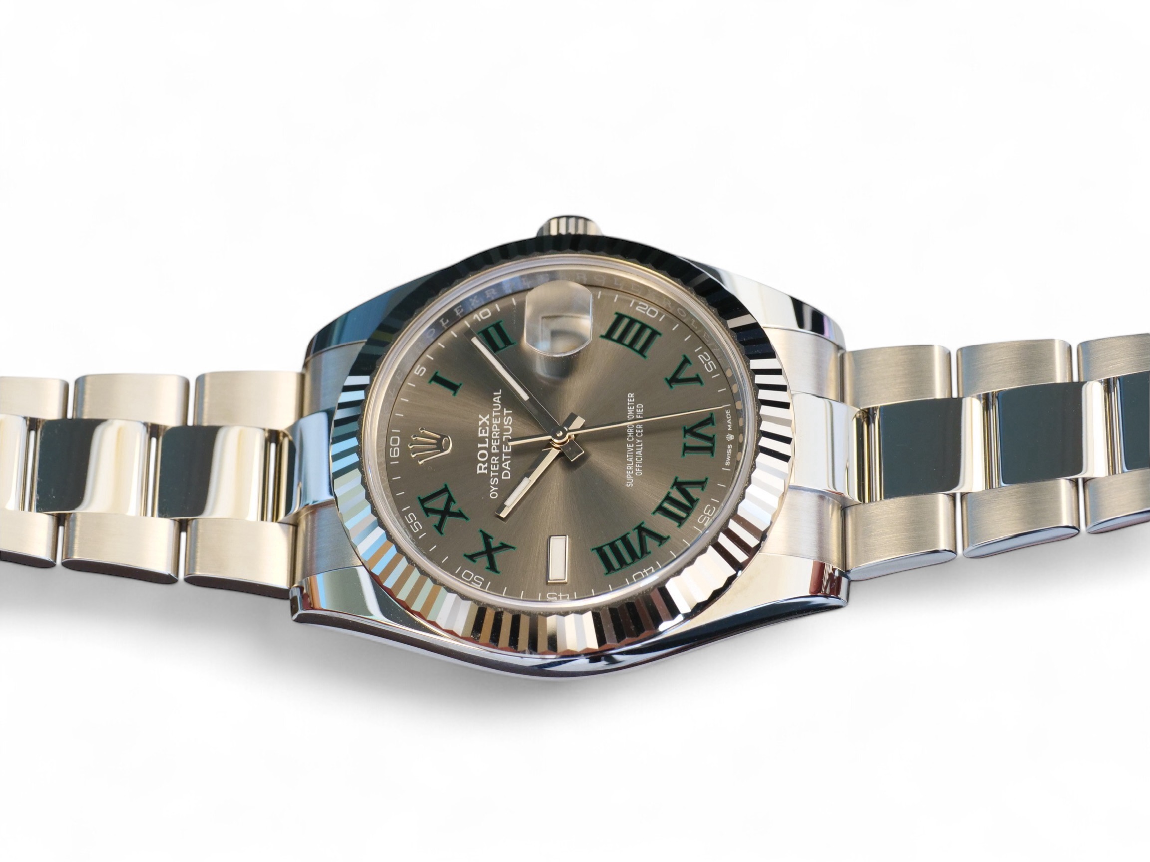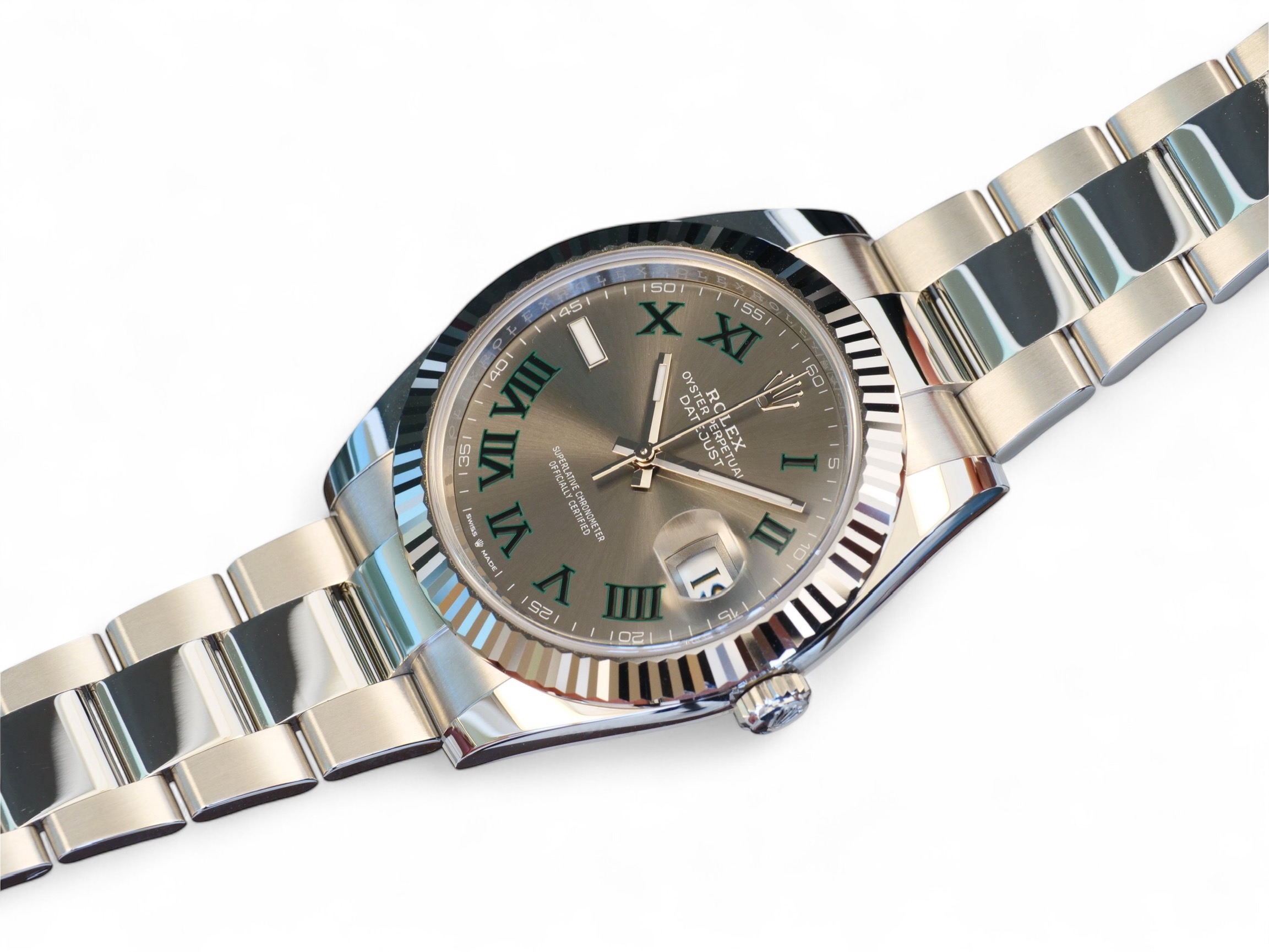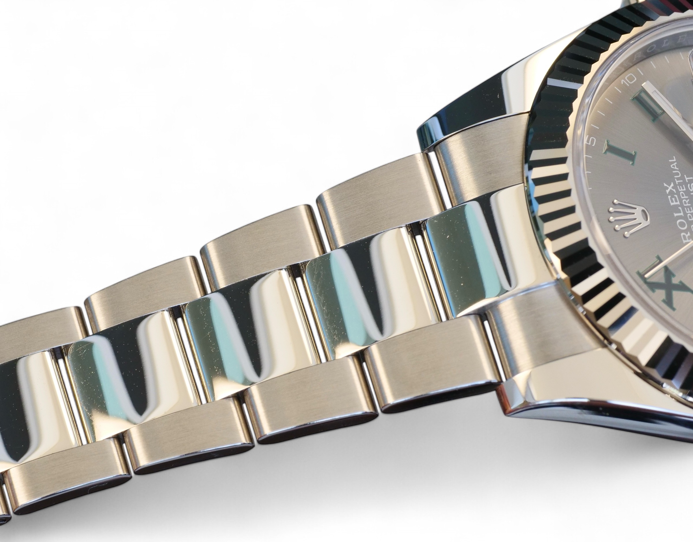 Rolex Datejust 41 Wimbledon Roman Dial in a very beautiful and the most sought-after configuration of 18ct fluted bezel and Oyster bracelet.