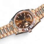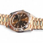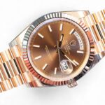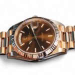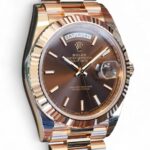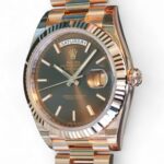 Featuring a very beautiful and highly attractive Rolex Day-Date 40 in 18ct Everose gold case and bracelet, and a spectacular Chocolate dial, the iconic Rolex president bracelet with hidden clasp and signature fluted bezel, model reference 228235.