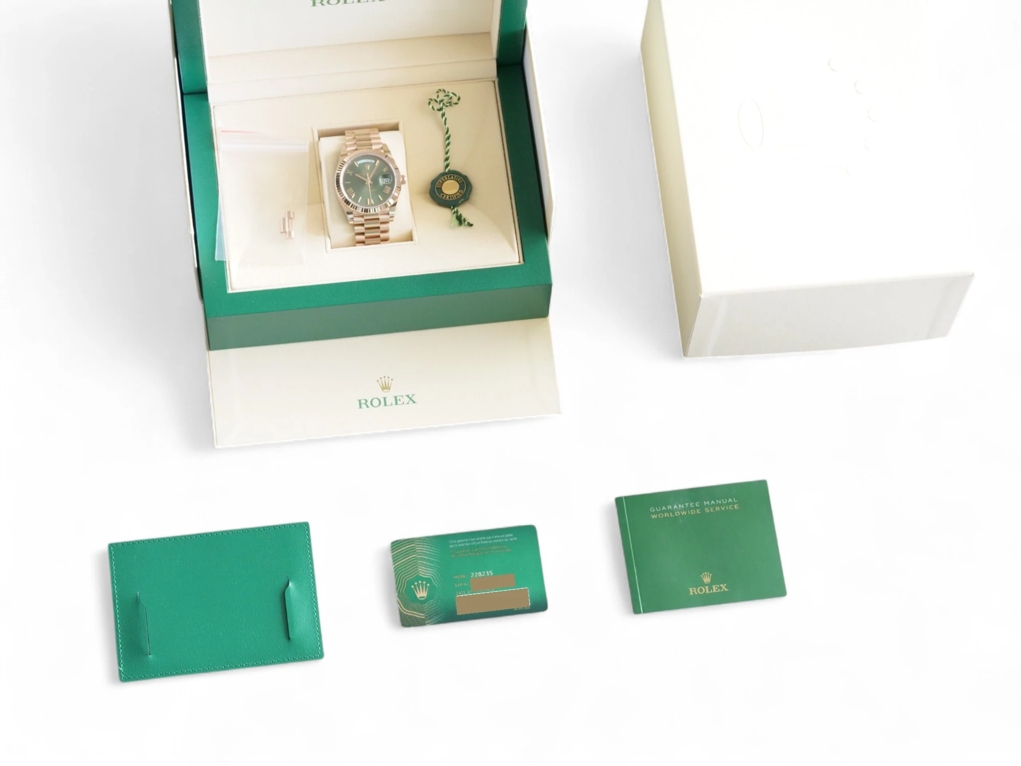 The Rolex Day-Date 40 Everose gold for sale is in Mint condition, as can be seen in the photos. The watch is offered as a full set with factory presentation boxes (minus the Day-Date Manual) and papers dated 2020, including the green Rolex hang tag & new NFC style green Rolex card – please refer to the last photo of the listing for full delivery contents.