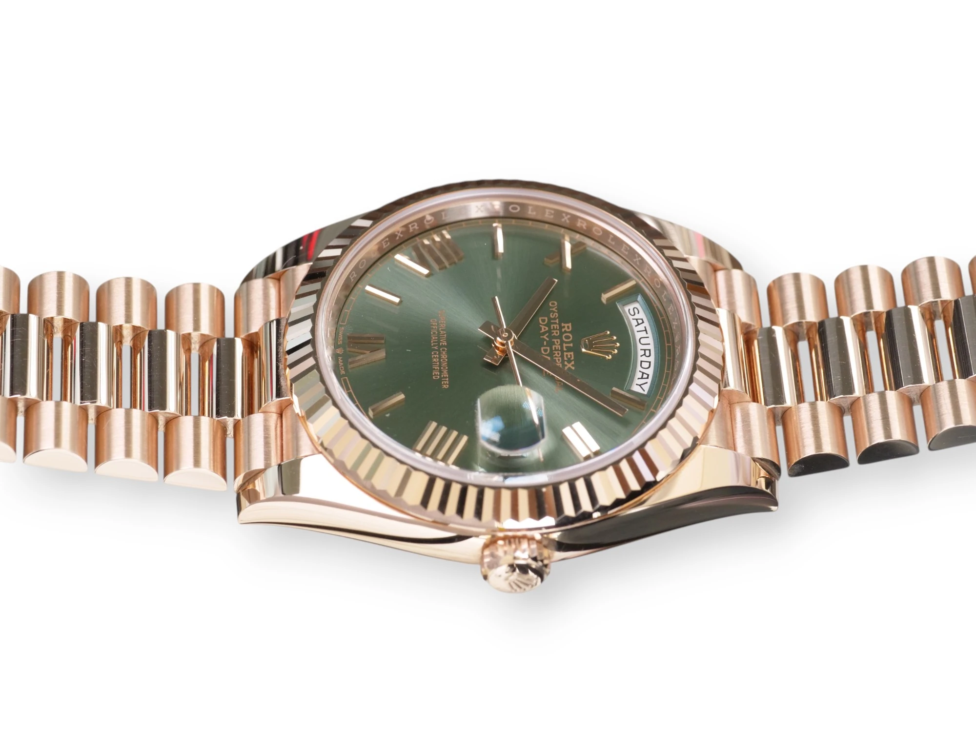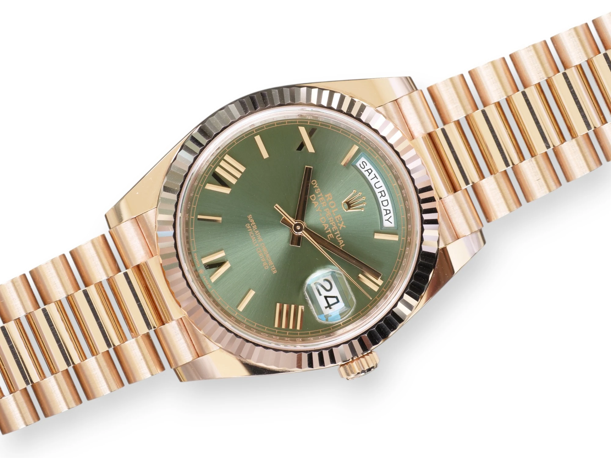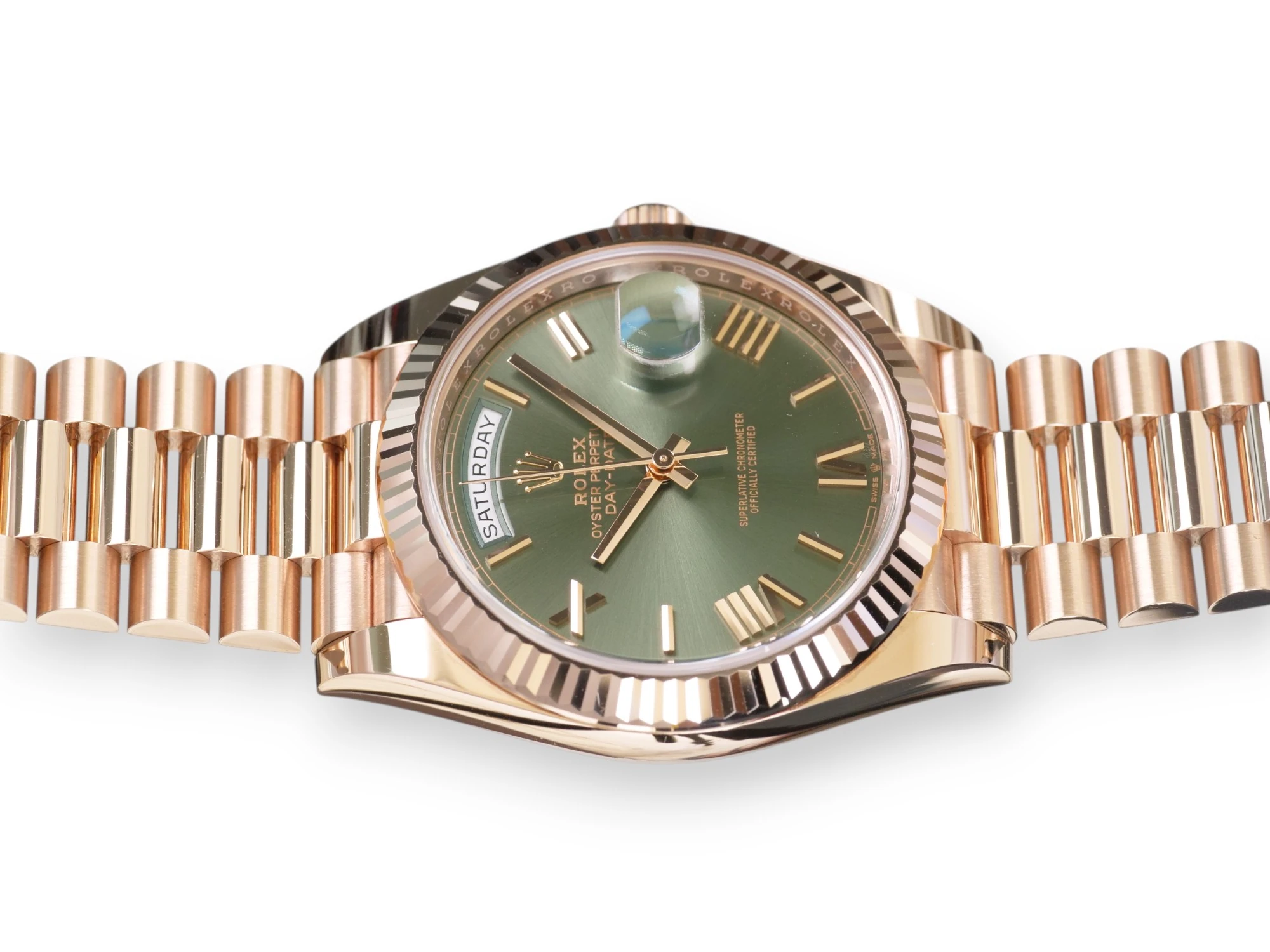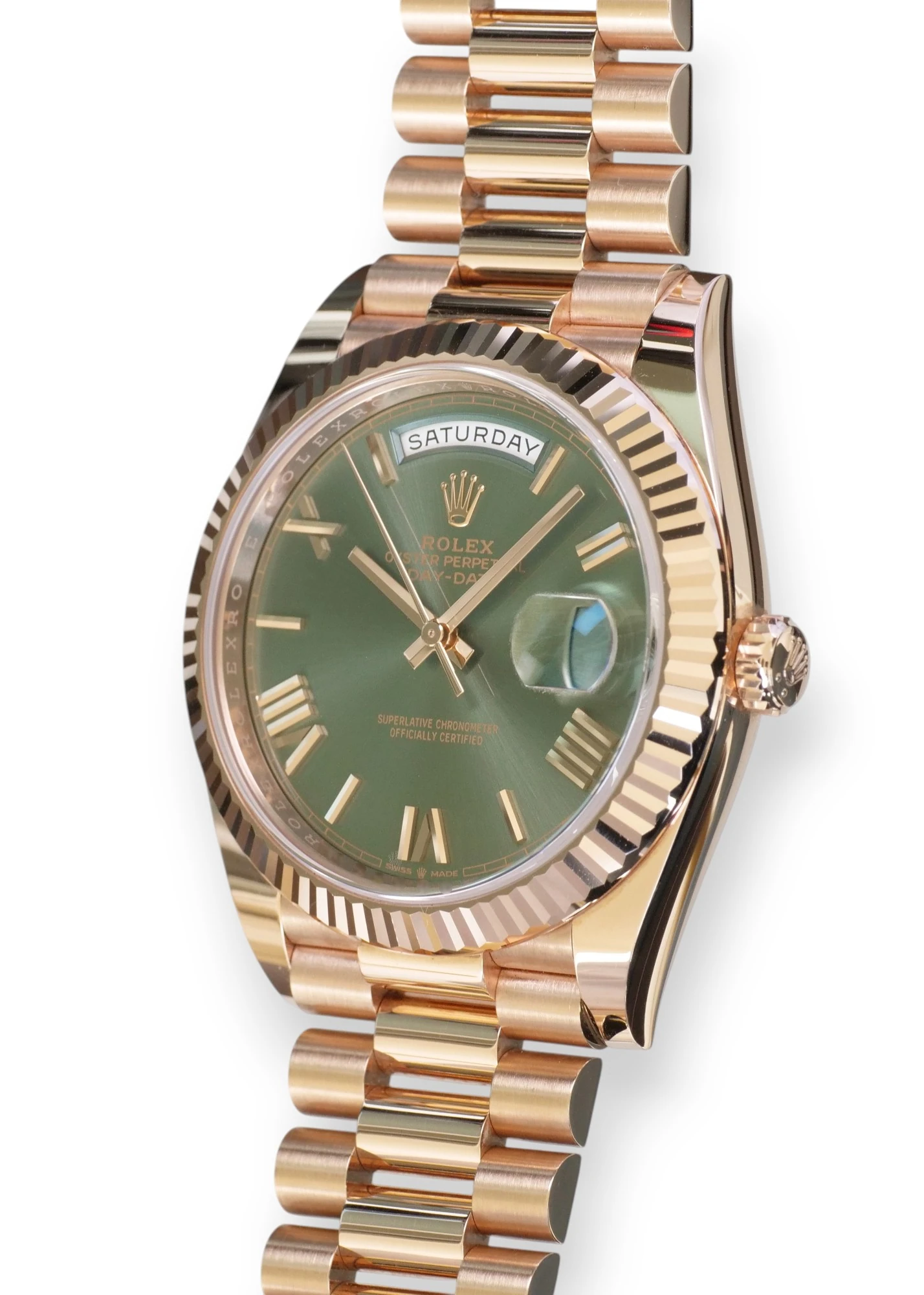 Featuring a very beautiful and one of the most sought-after Rolex Day-Date 40 Everose gold case and bracelet, and the very popular and spectacular Olive Green dial, the iconic Rolex president bracelet with hidden clasp and signature fluted bezel, model reference 228235.