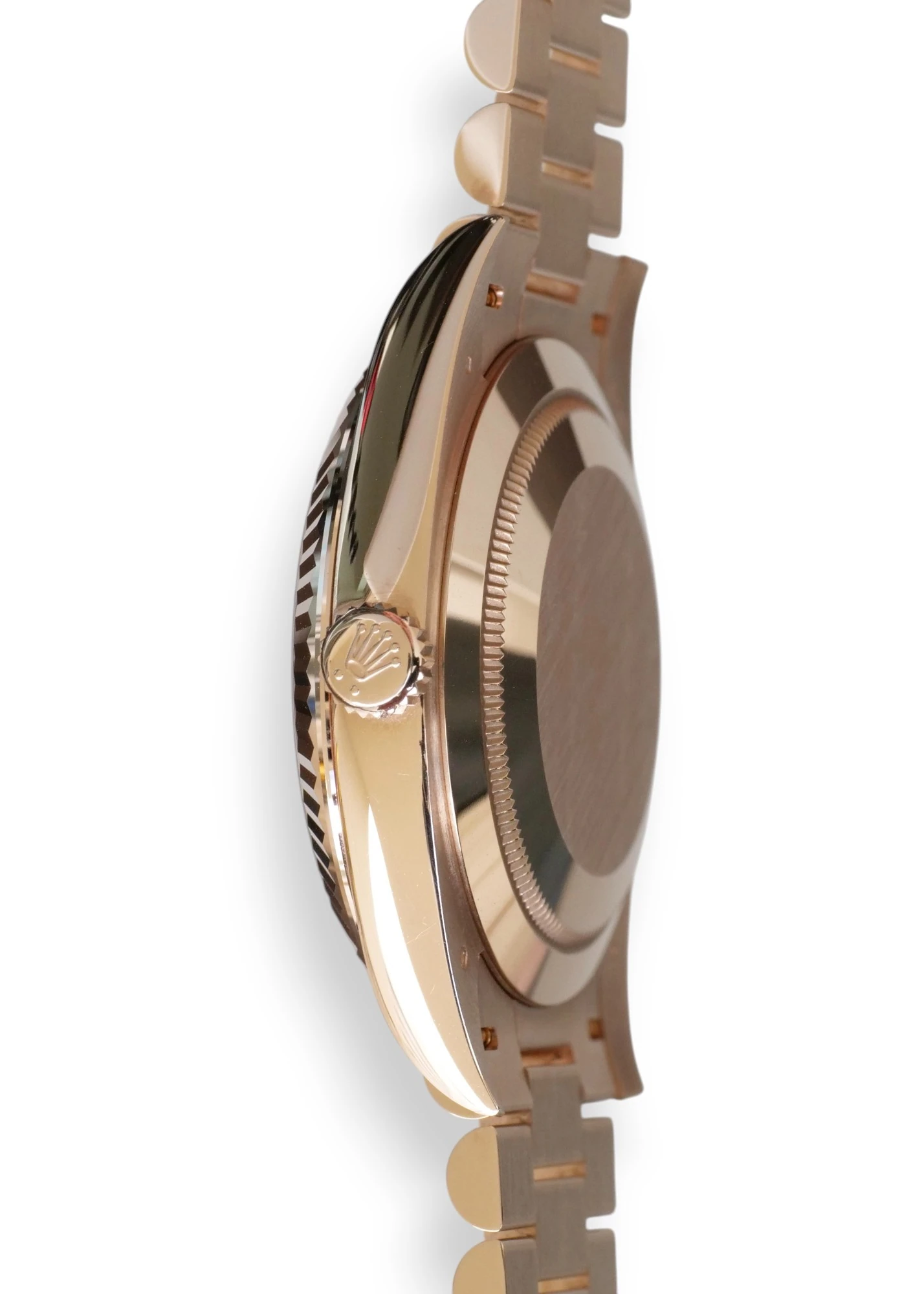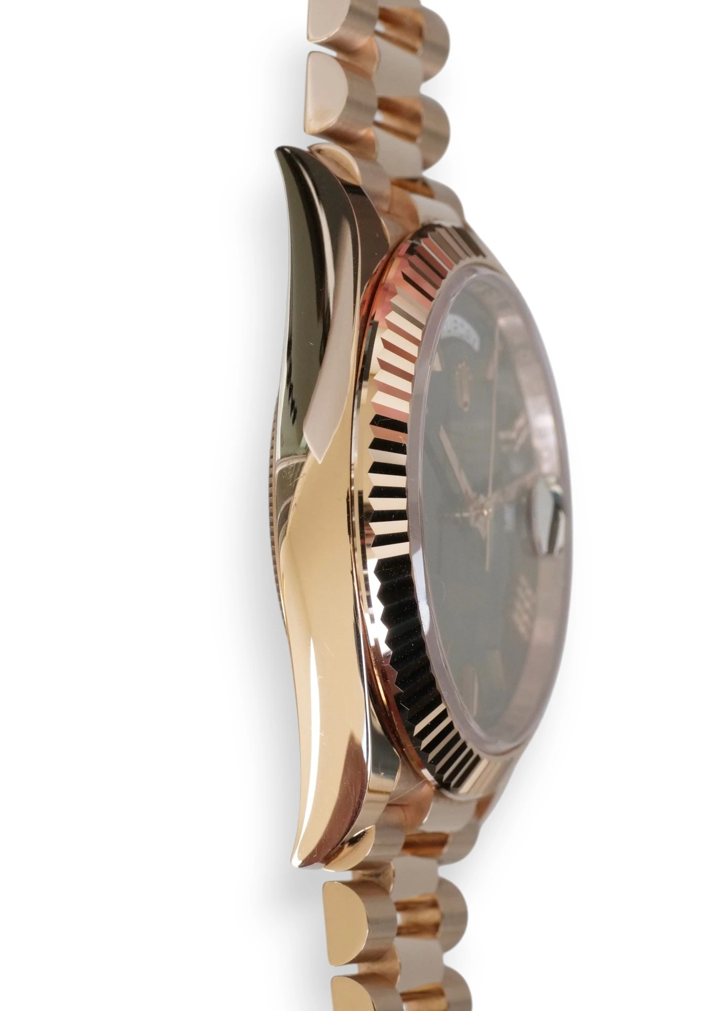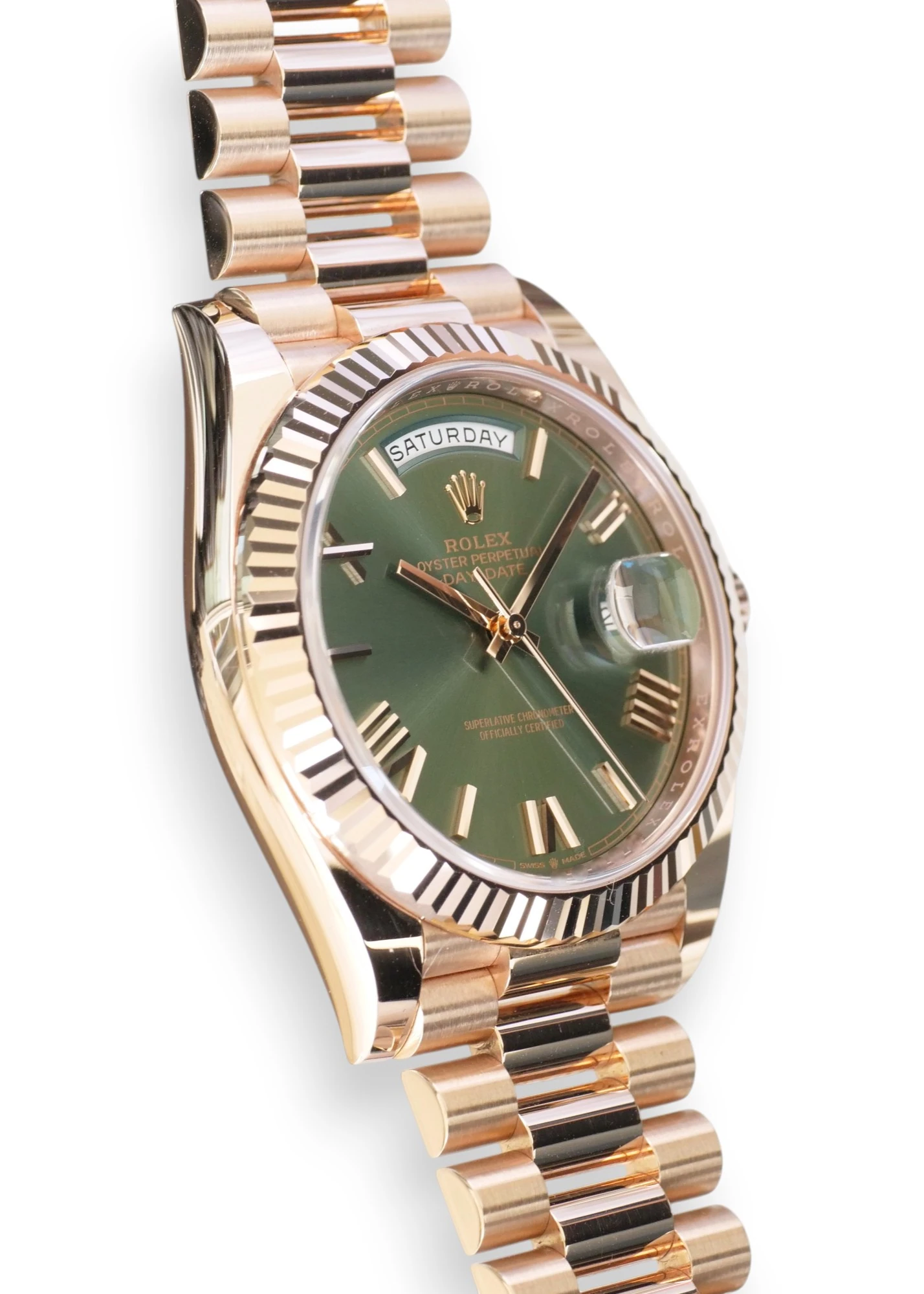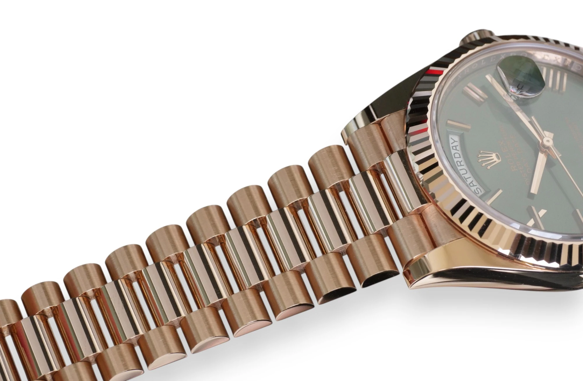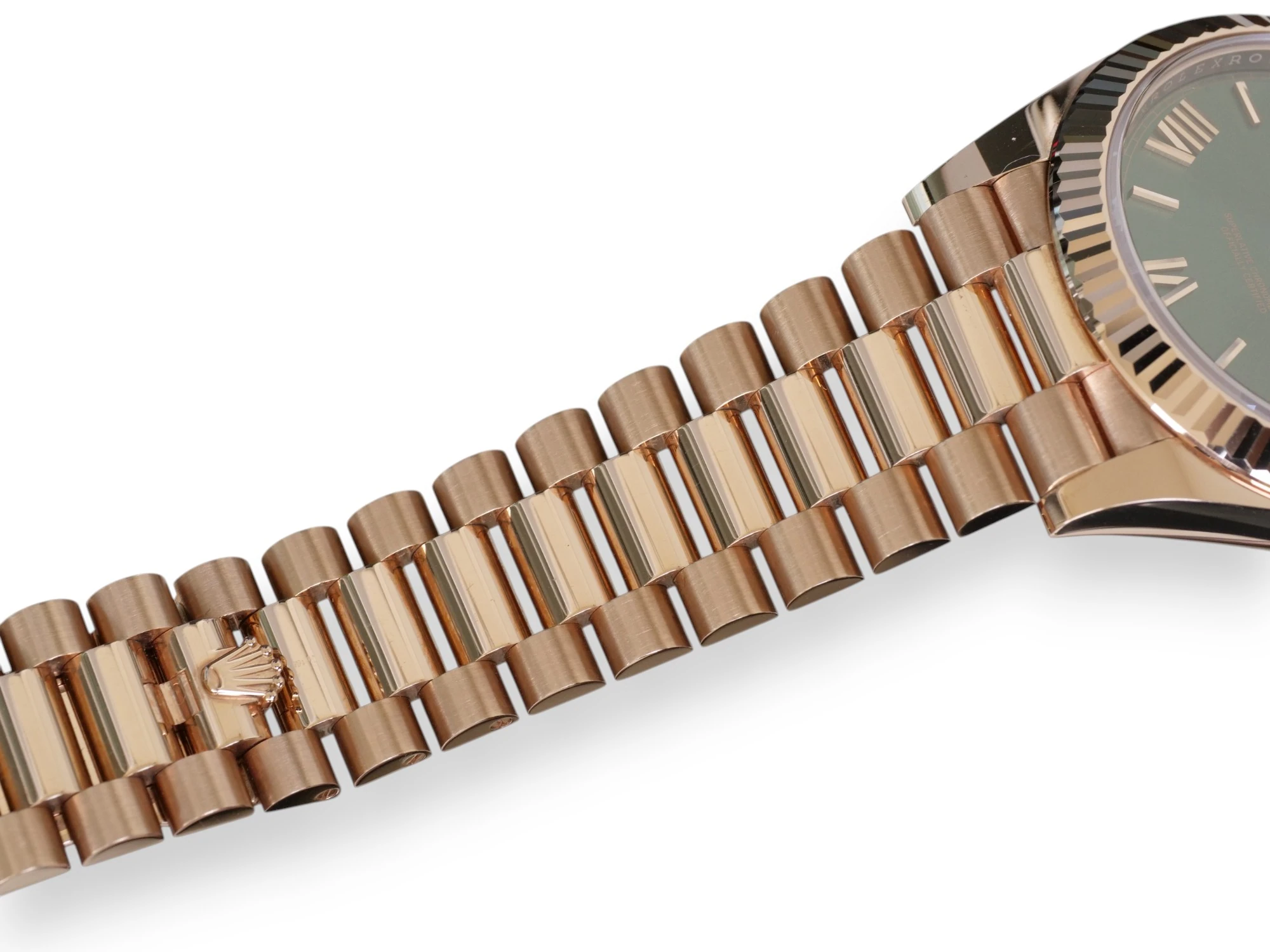 Featuring a very beautiful and one of the most sought-after Rolex Day-Date 40 Everose gold case and bracelet, and the very popular and spectacular Olive Green dial, the iconic Rolex president bracelet with hidden clasp and signature fluted bezel, model reference 228235.