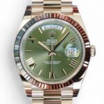 Featuring a very beautiful and highly sought after Rolex Day-Date 40 in 18ct white gold and an Olive green dial with Roman numerals, the iconic Rolex President bracelet with hidden clasp and signature fluted bezel, model reference 228239.