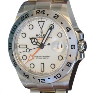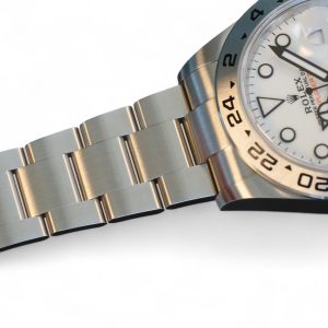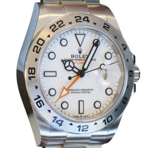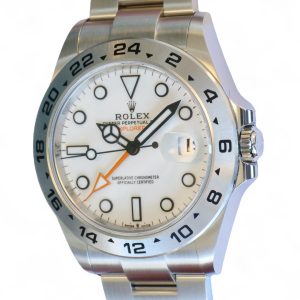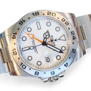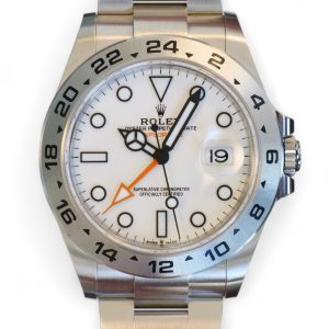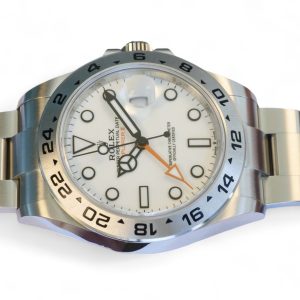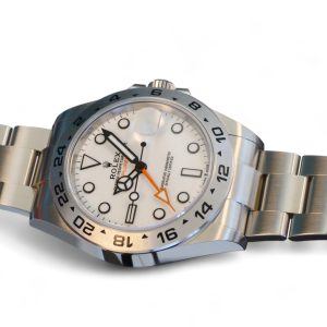On offer for sale is a beautiful, the latest generation, 50th anniversary model Rolex Explorer II, in a very sought after Polar dial with the iconic black and white accents and the very special orange GMT hand, model reference 226570, offering 70 hours of power reserve.