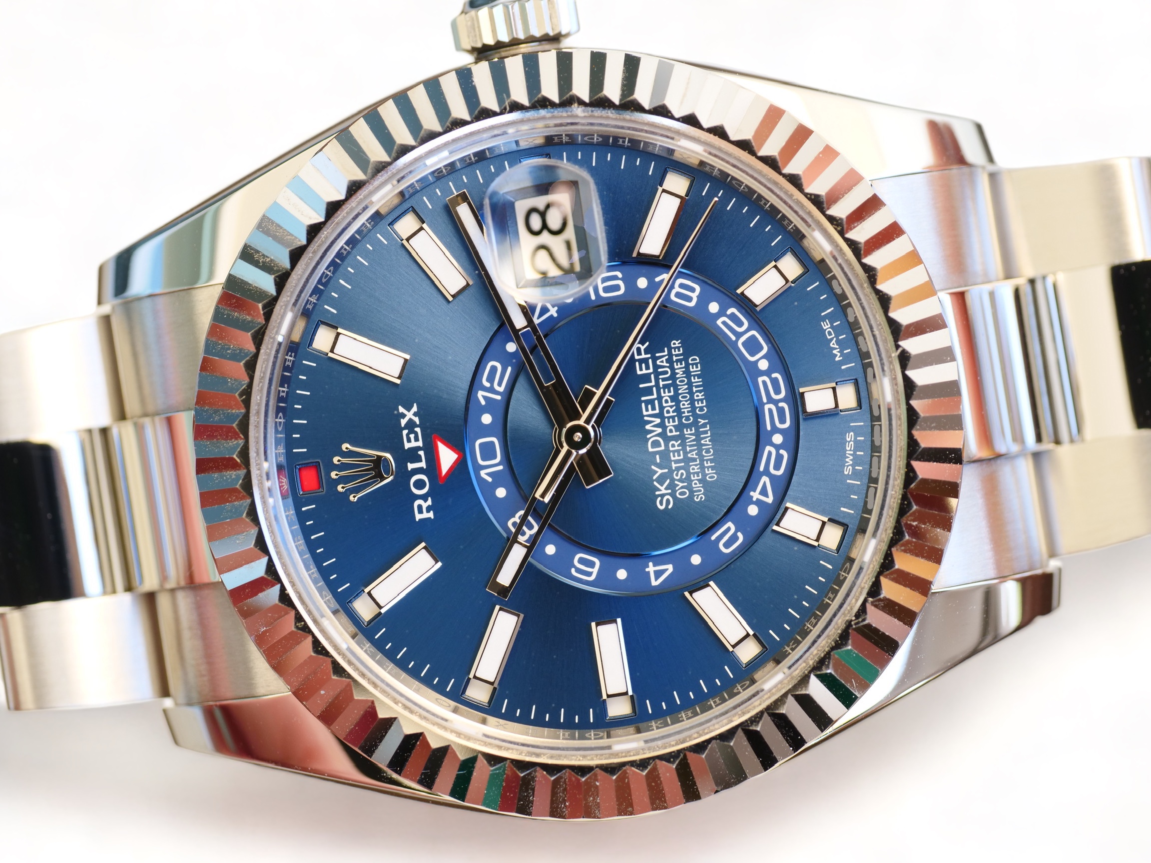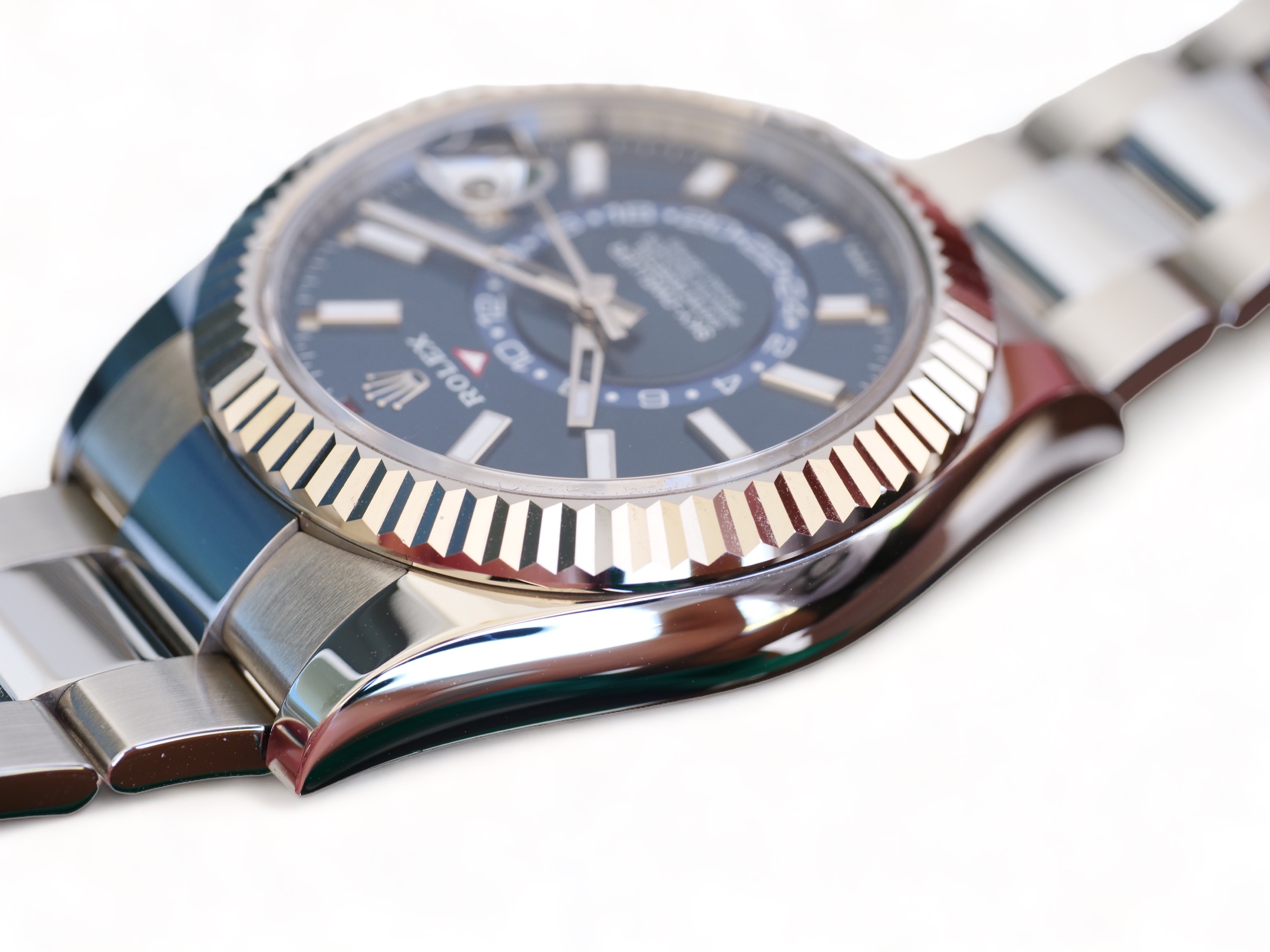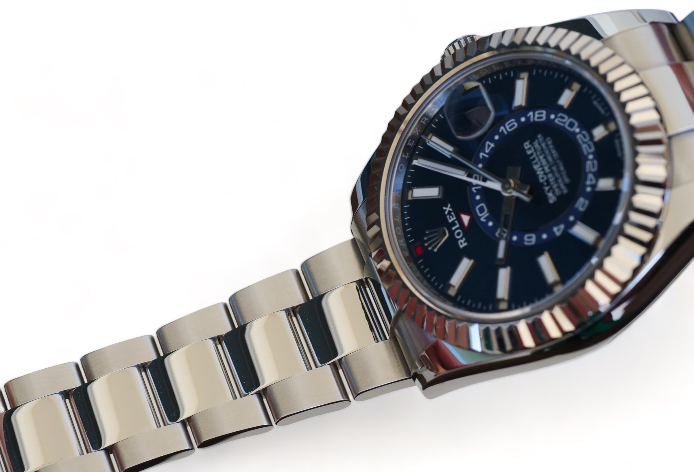 On offer for sale is one of the most desirable and technically, the highest complication Rolex watches to exist, the Annual Calendar, dual time and date complication, the Rolex Skydweller in a spectacular sunburst blue dial with the  iconic Oystersteel bracelet.