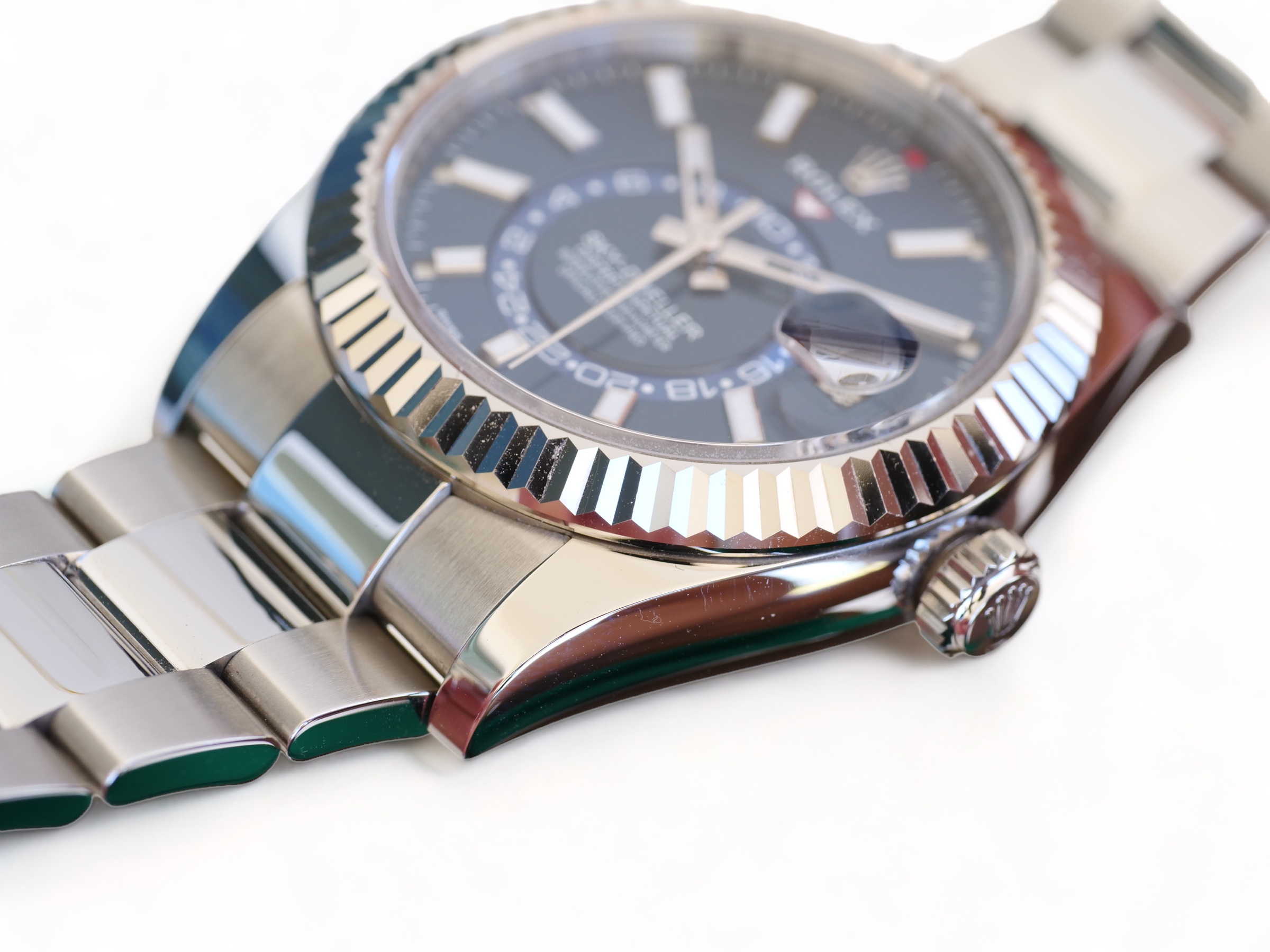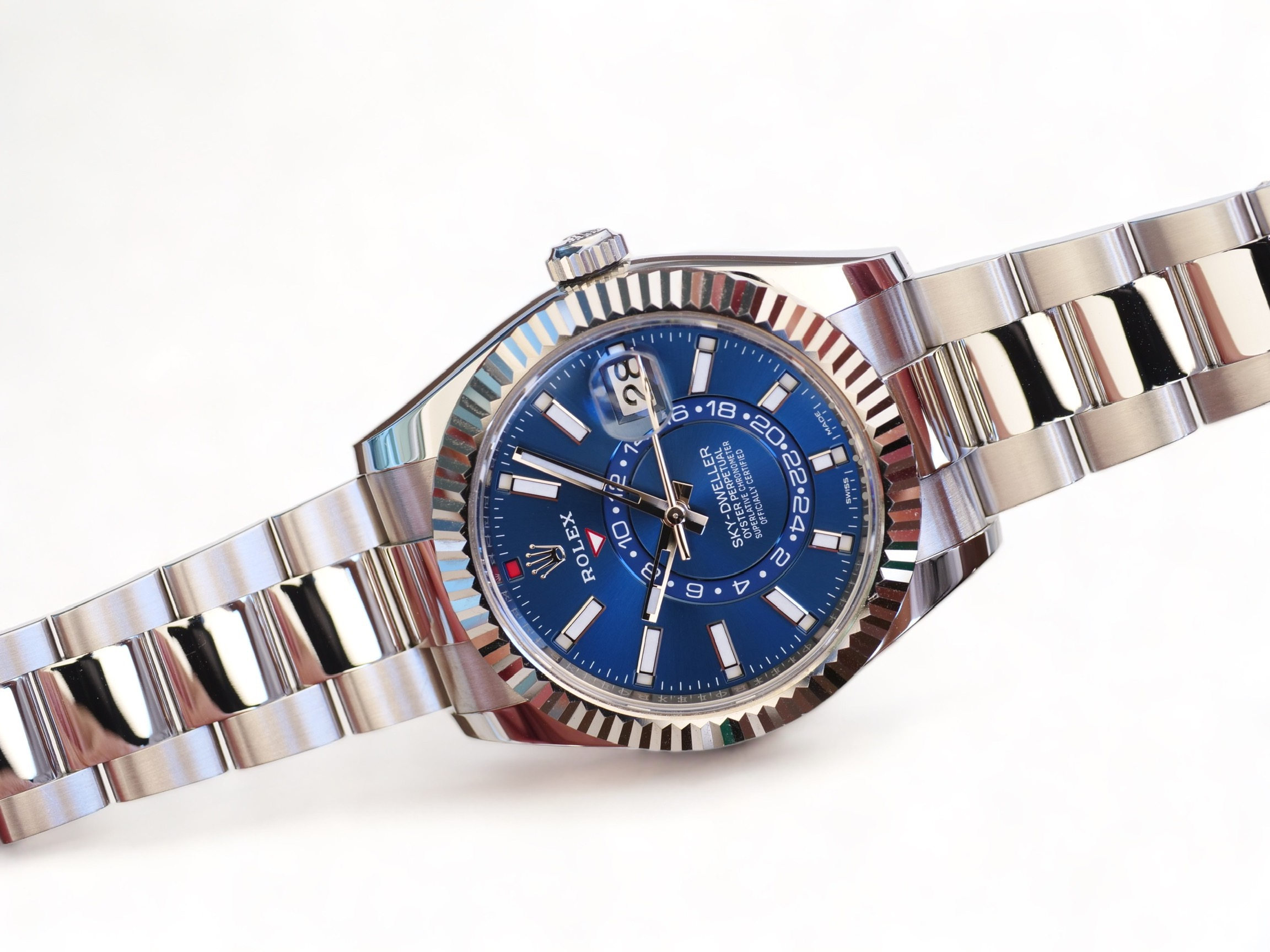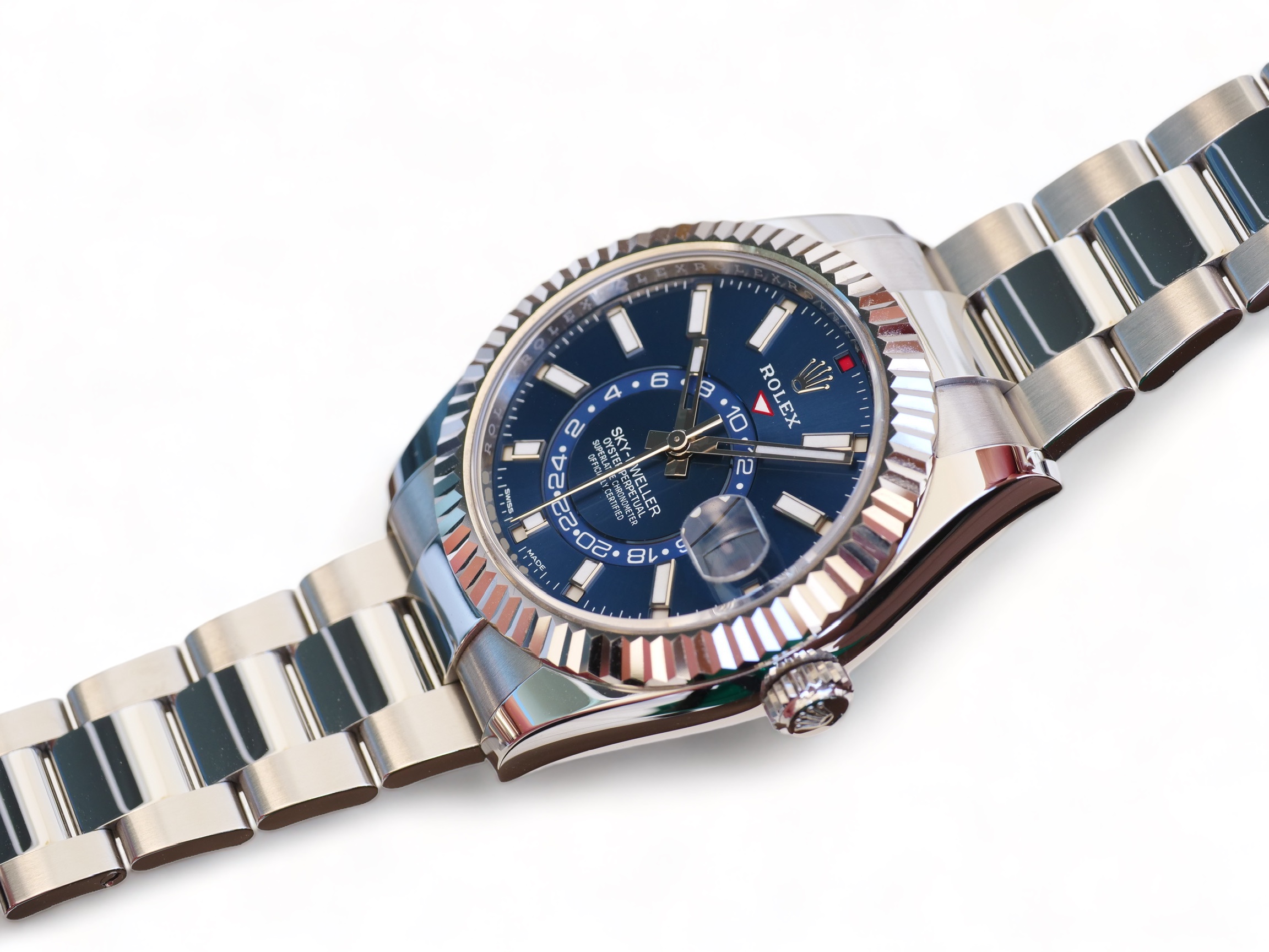 On offer for sale is one of the most desirable and technically, the highest complication Rolex watches to exist, the Annual Calendar, dual time and date complication, the Rolex Skydweller in a spectacular sunburst blue dial with the  iconic Oystersteel bracelet.