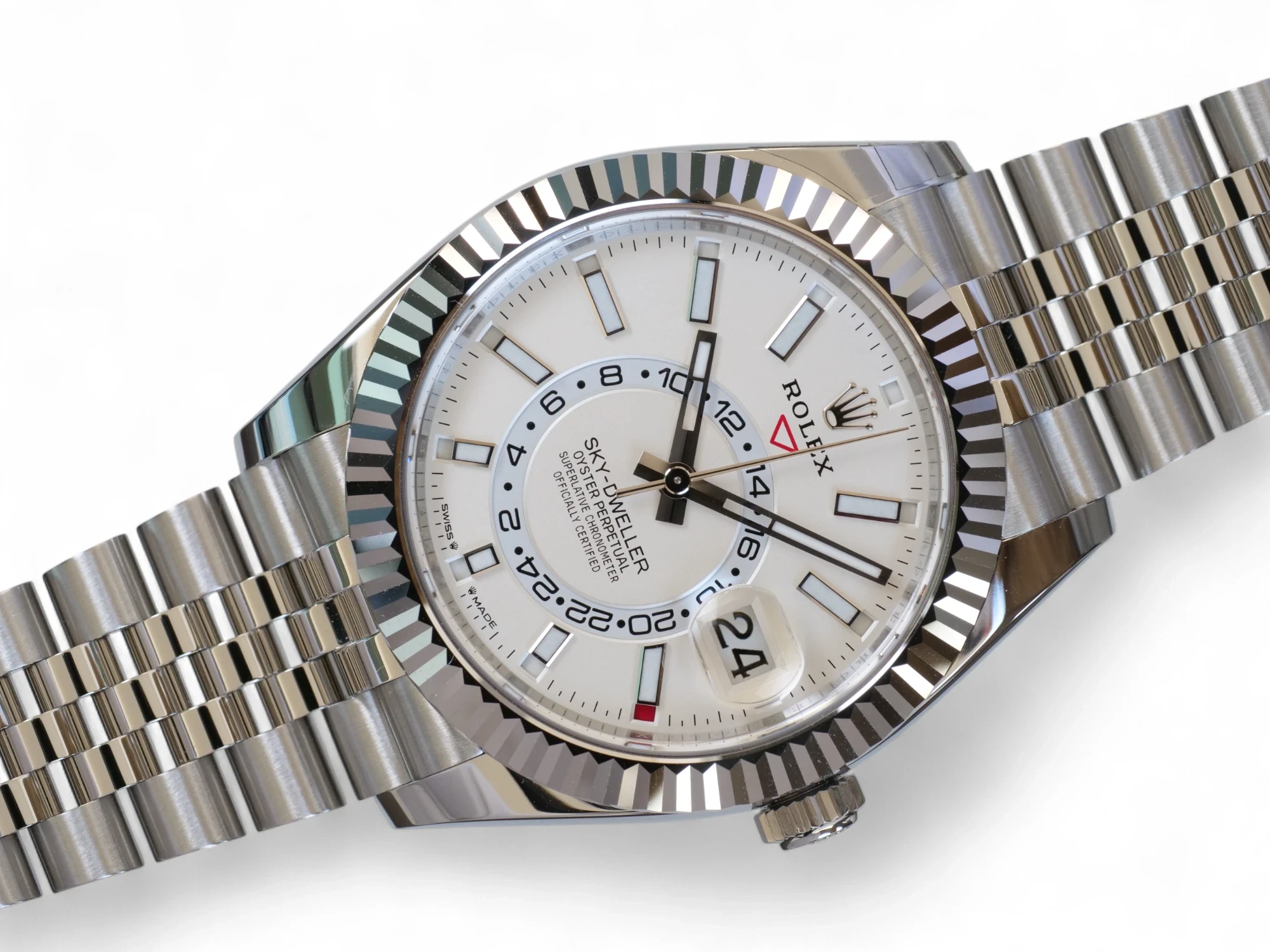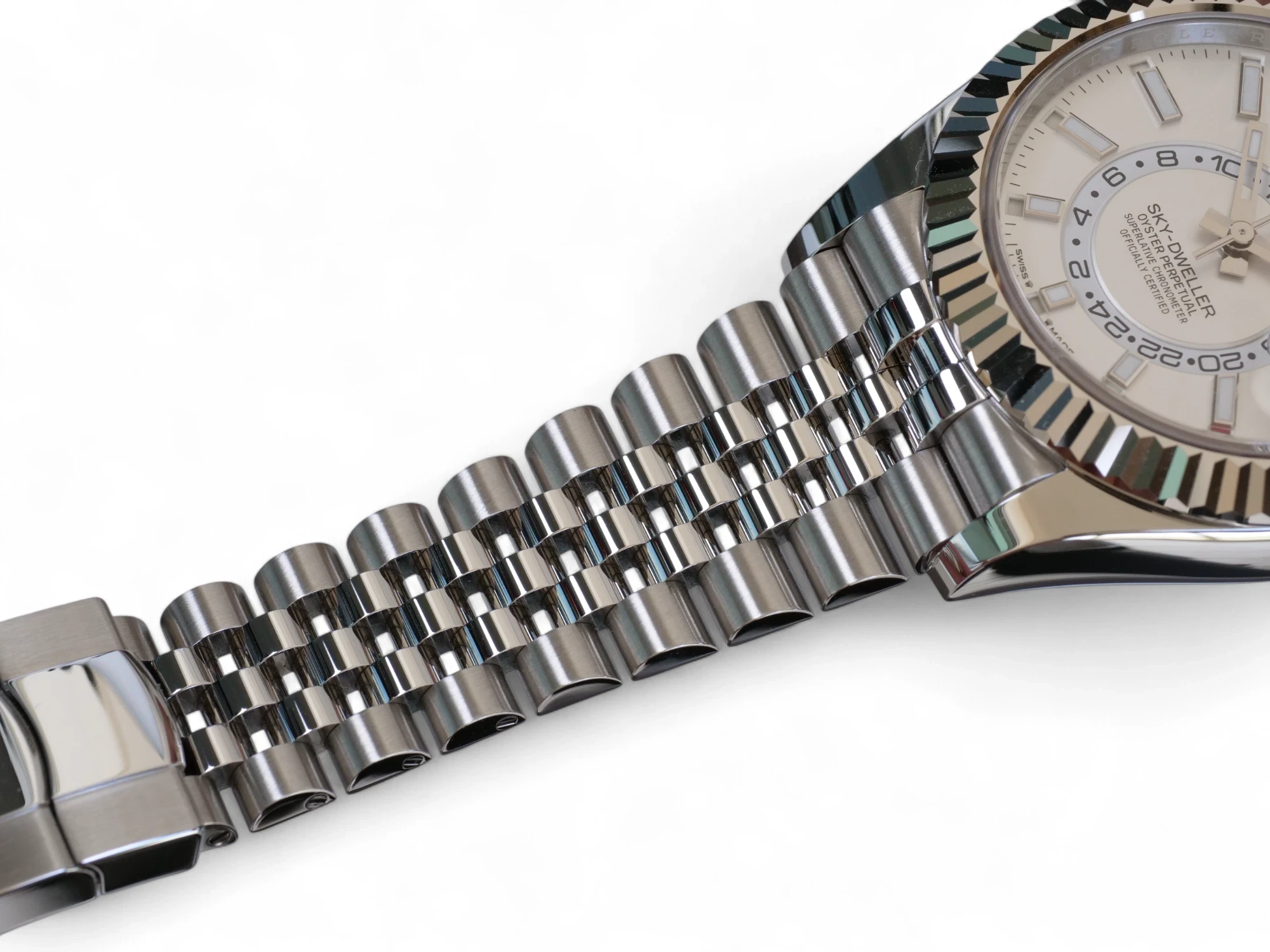 Rolex Sky-dweller White Dial, Jubilee bracelet model 336934, one of the most desirable and technically, the highest complication Rolex watch to exist with an annual calendar, dual time and date complication, all offered while featuring the iconic and timeless Rolex looks.